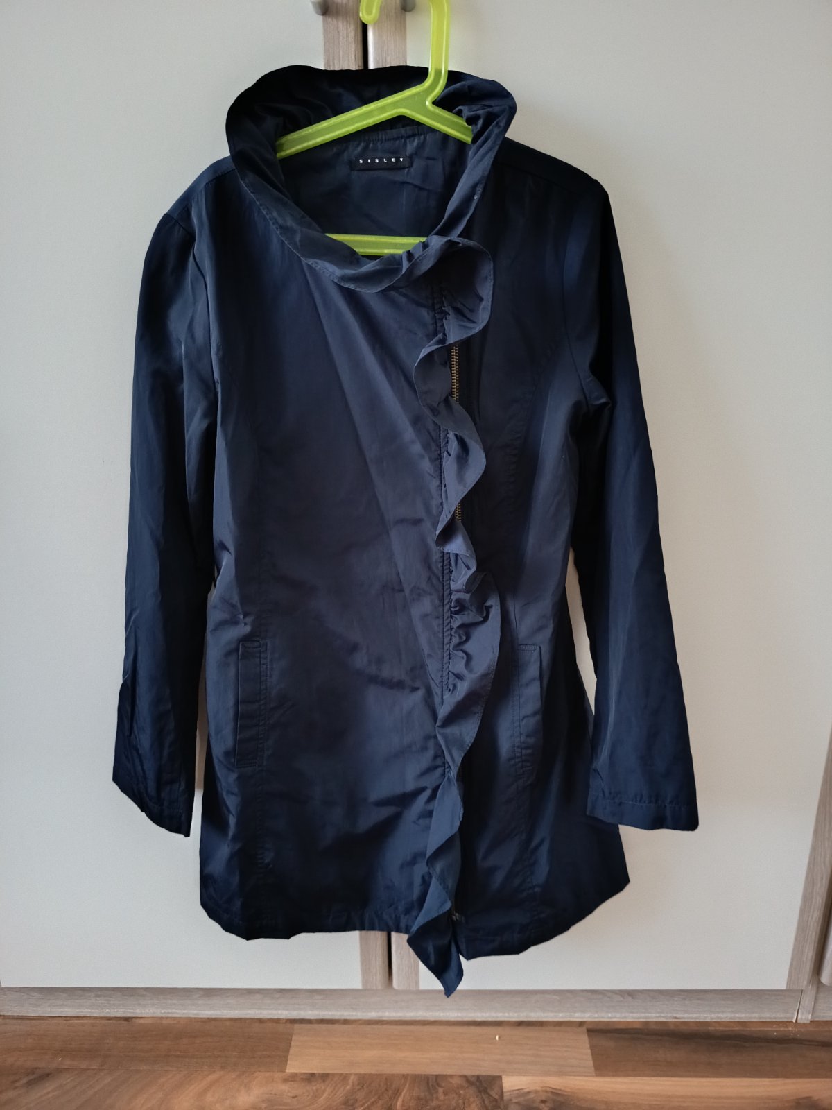 Ľahký prechodný kabátik bez podšívky na zips s volánikom.Nema pásik.dl.71cm,rukav-53 cm