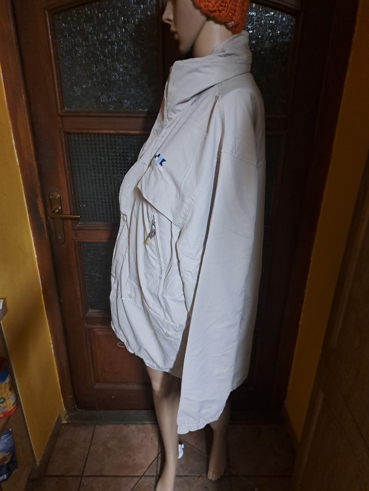 Pánska bunda na prechodné obdobie. Zapínanie je vpredu na zips a cvoky. Dĺžka je 75cm, obvod hrudníka je 126cm a obvod pása je 126cm. Dĺžka rukáva od krku je 85cm