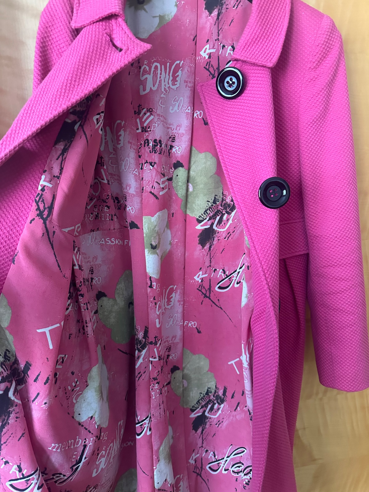 Ponúkam na predaj jarný kabát veľkosť S, minimálne nosené, rozmery: dĺžka 70 cm, šírka pod pazuchami 42 CM, rukáv 58 CM. Je to ako keby taká teplákovina, elastický materiál, veľmi pekná ružová sýta...