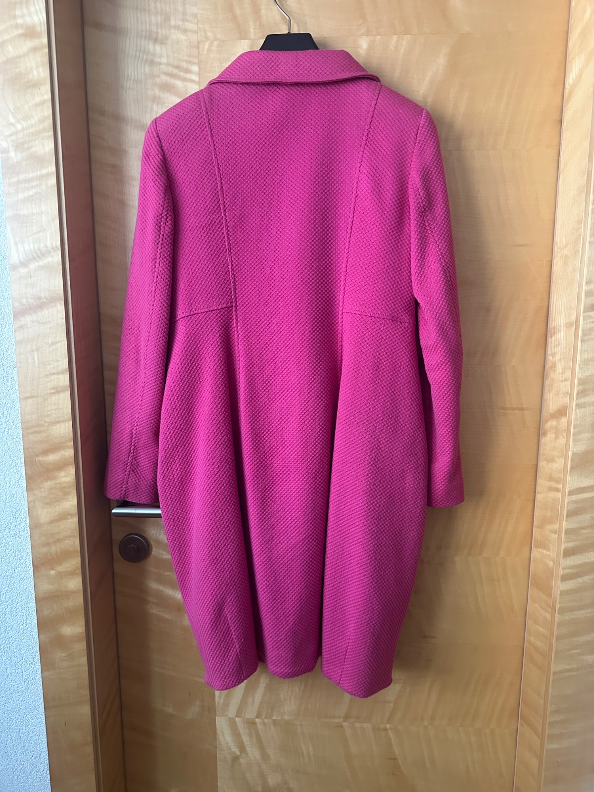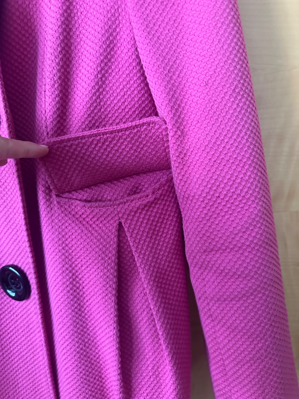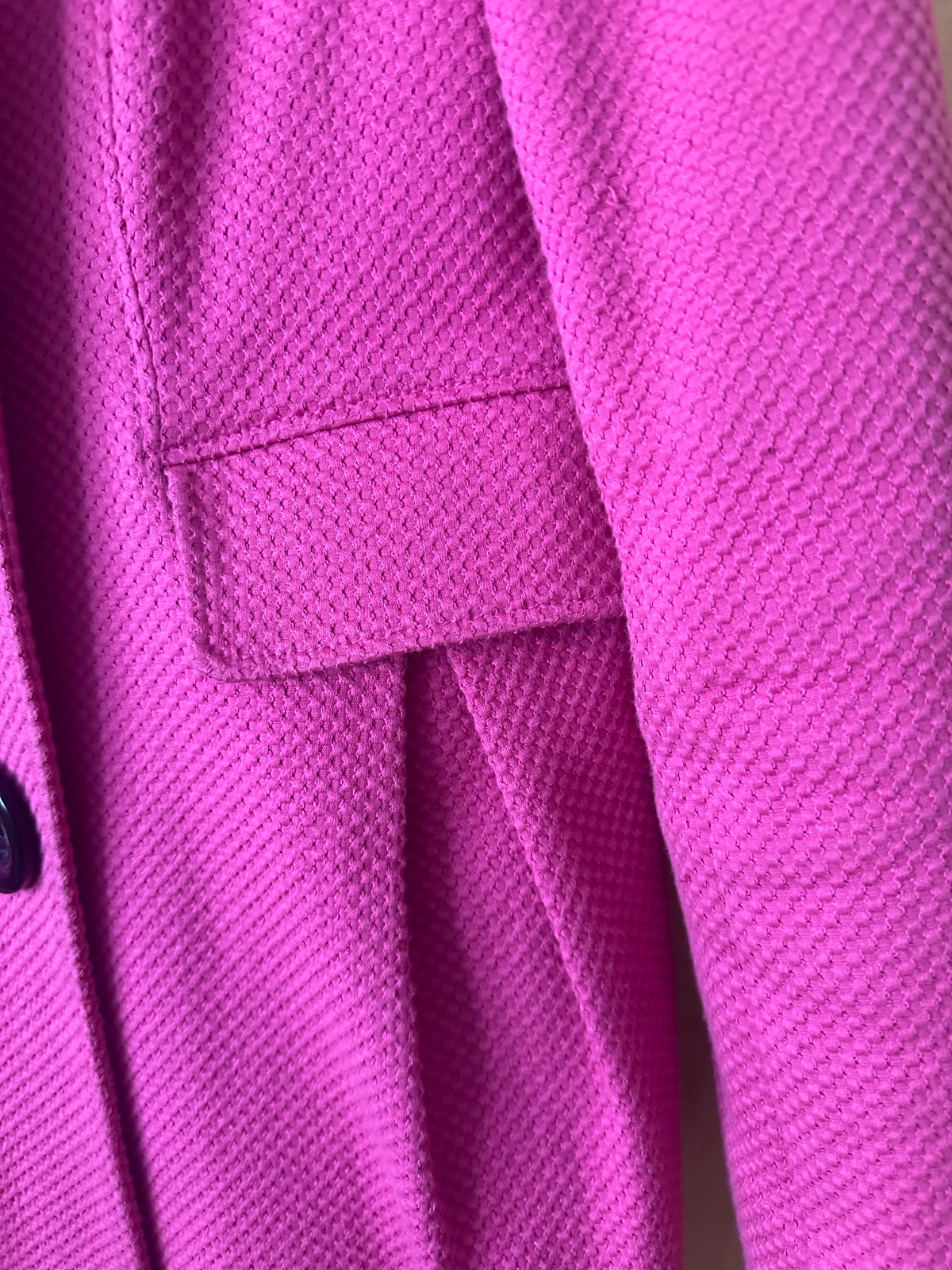Originál dámsky trenčkot/kabát cyklamenovej farby. Nový bez visačky. Veľkosť S. Pôvodná cena 169 $. Kúpené priamo v USA. Rozmery: šírka pod rukávmi: 48 cm dĺžka kabáta 77 cm dĺžka rukáva od goliera...