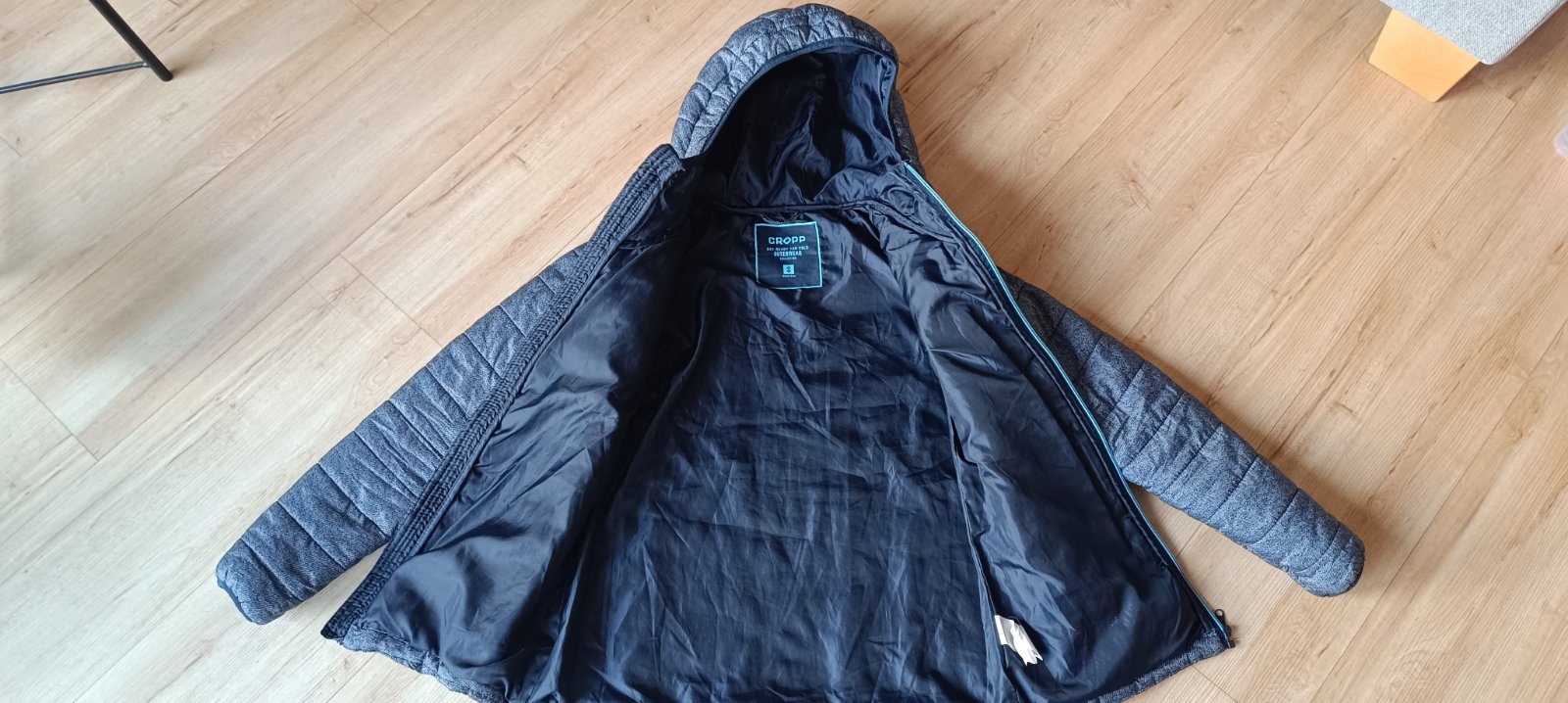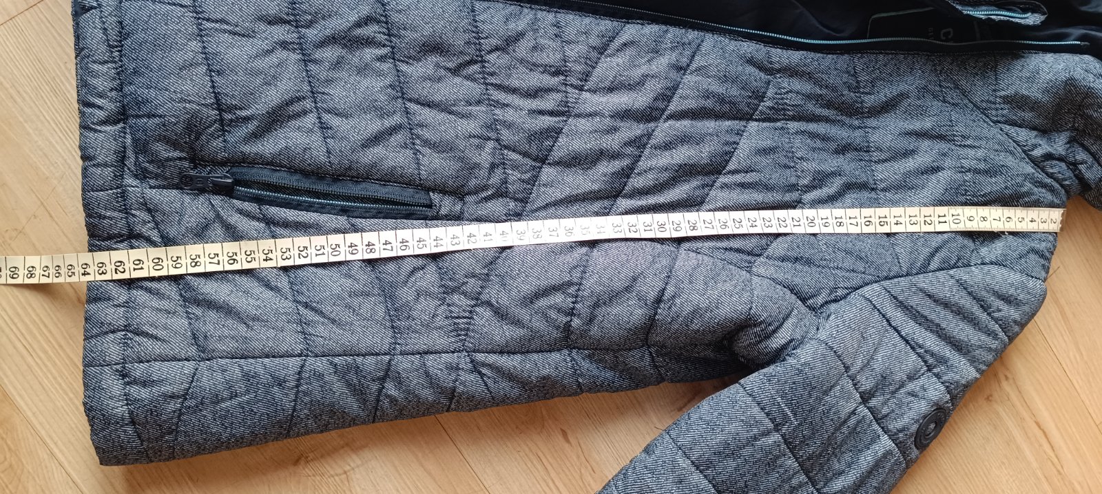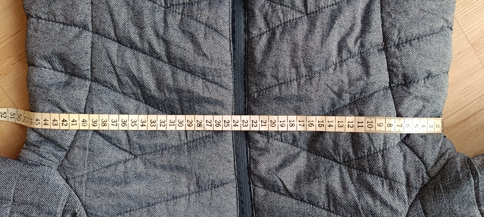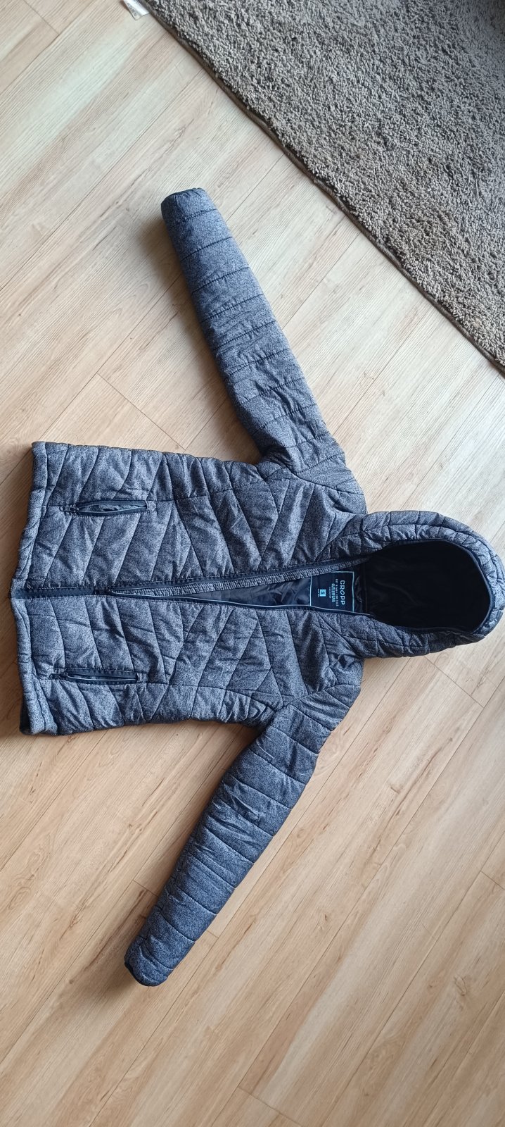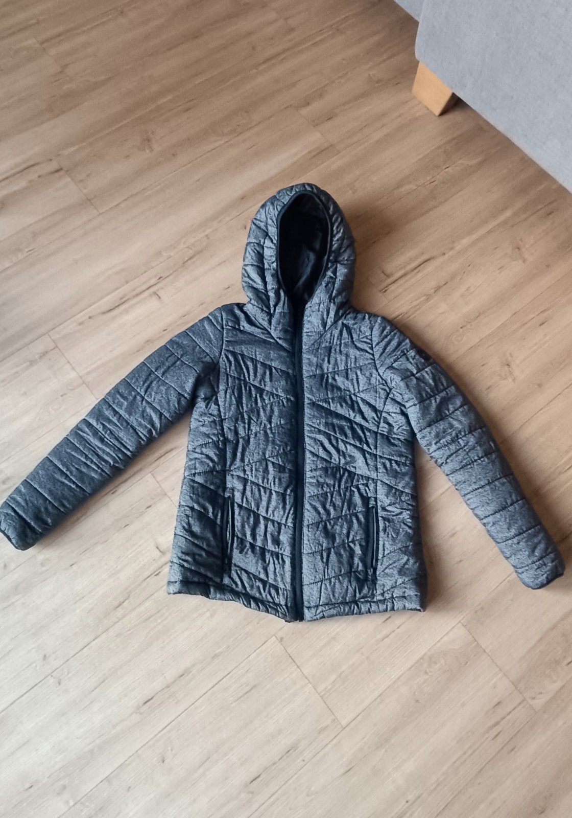 Krátka šedá bundička, nenosená, veľ. písaná L, ale skôr S, dĺžka 53 cm, šírka 2x46cm, rukáv 61cm. Cena 5 € + poštovné