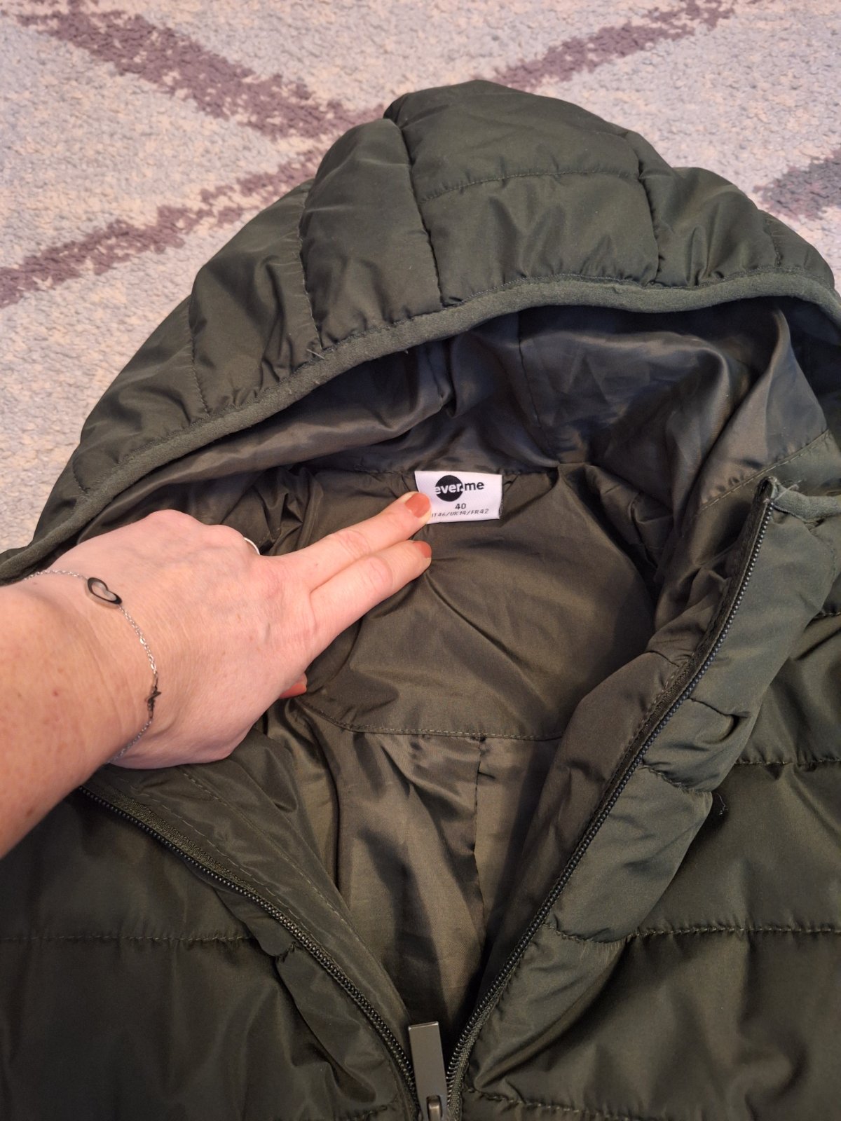 Bez poskodenia,dlzka 64cm,sirka pod prsami 50 cm,dlzka rukava od kapucne 72cm.