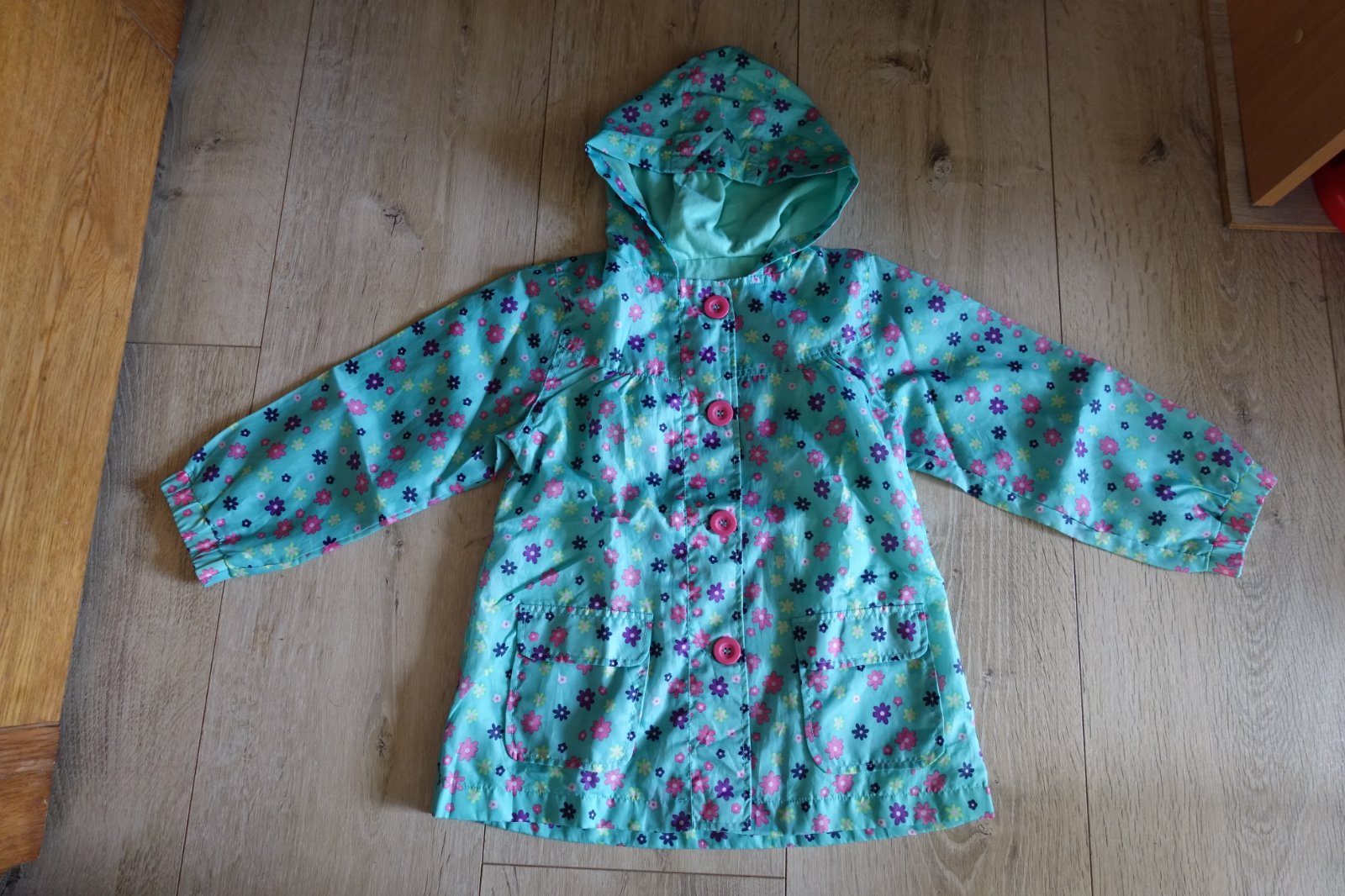 Predám krásny kabátik podteplený bavlnou s kvietočkami. Nie je hrubý, je tenší. Bol nosený max 2-3 krát, ale je v peknom nosenom stave. Nemá ani fľaky, ani diery, ani iné poškodenie. zapína sa na gombičky, v predu má 2 vrecúška. Dĺžka predného dielu je 51,5 cm a zadný diel je ešte o 1 cm predĺžený. Šírka je 39 cm. Dĺžka rukáviku od krku je 47 cm a od pliecka 39 cm. (G)