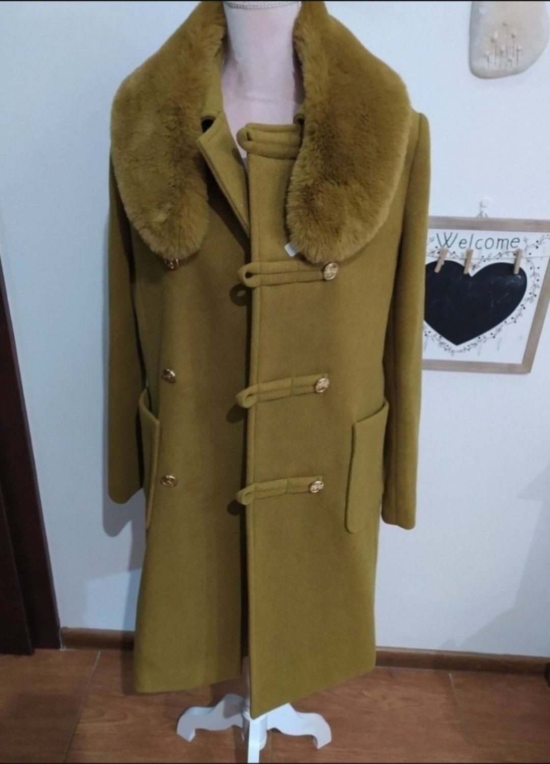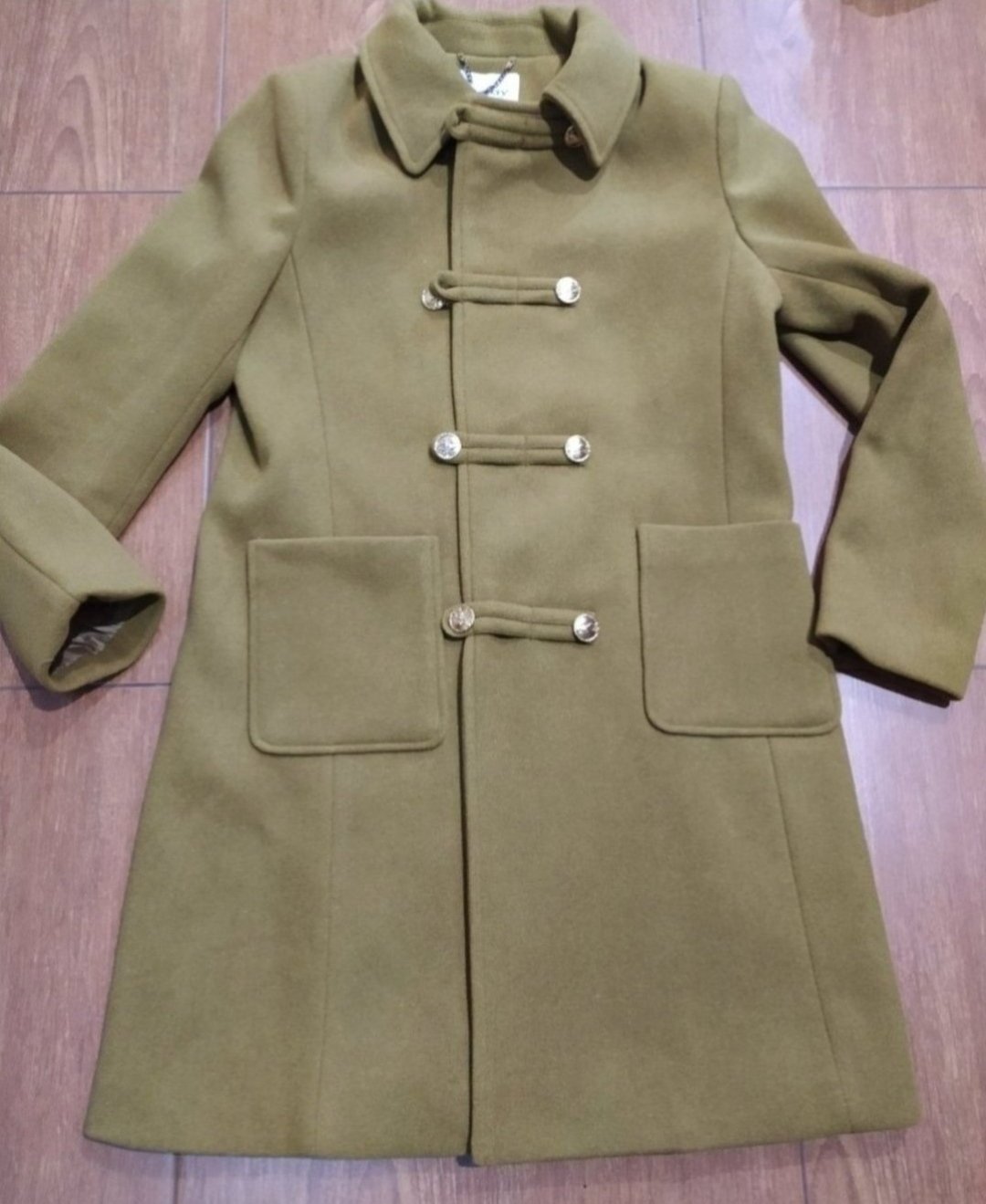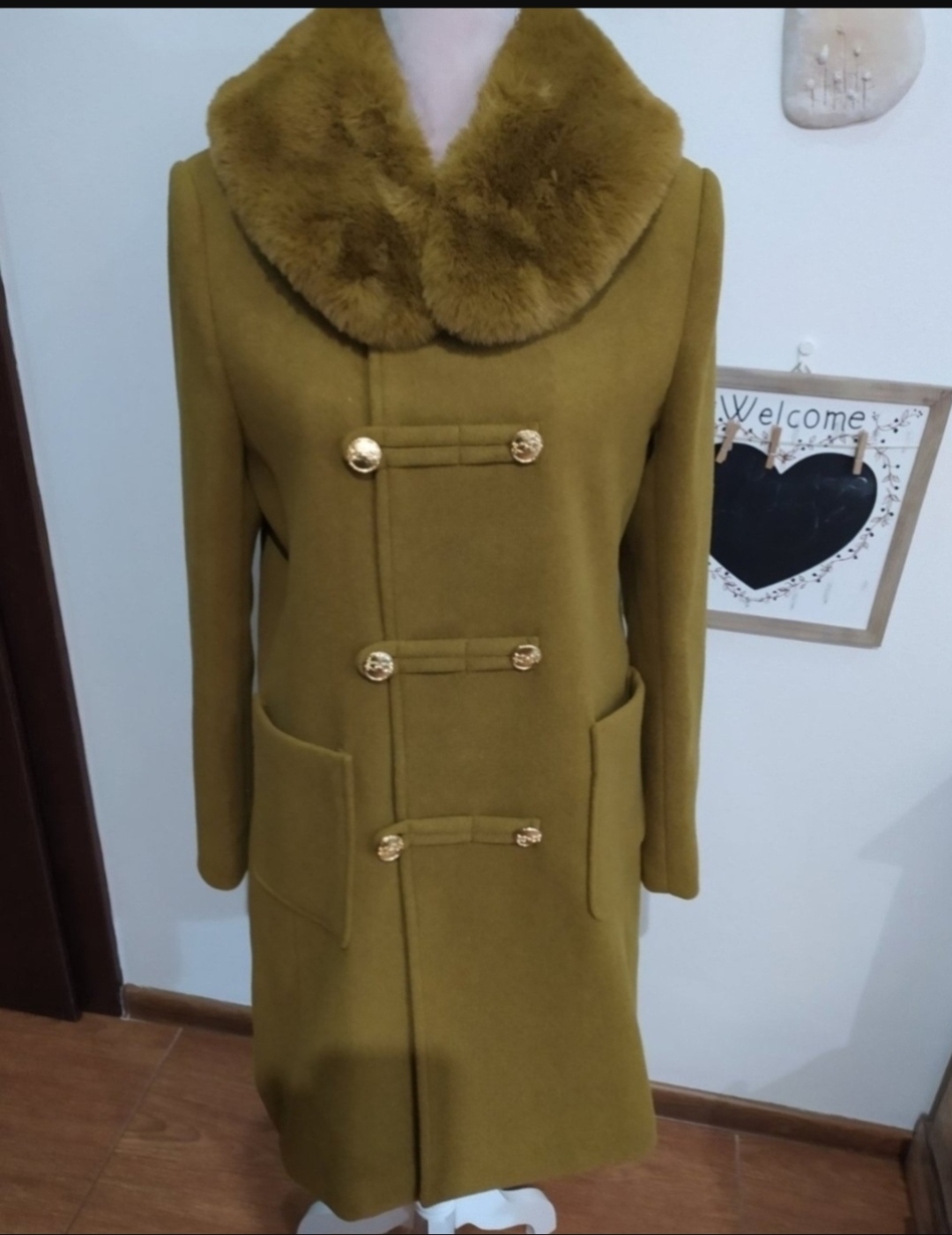 Kabát krásnej pistaciovej farby,doplnený zlatými gombikmi