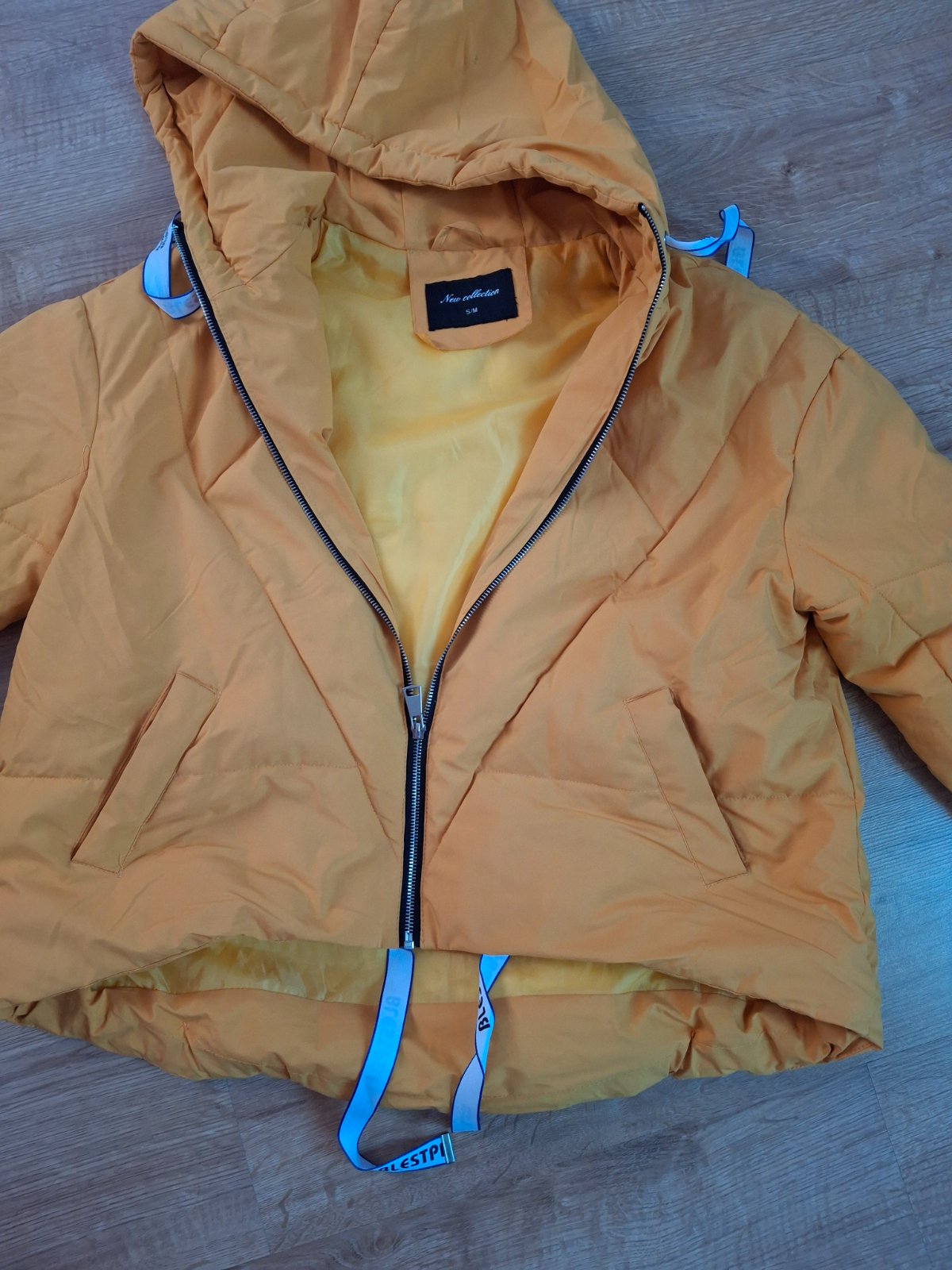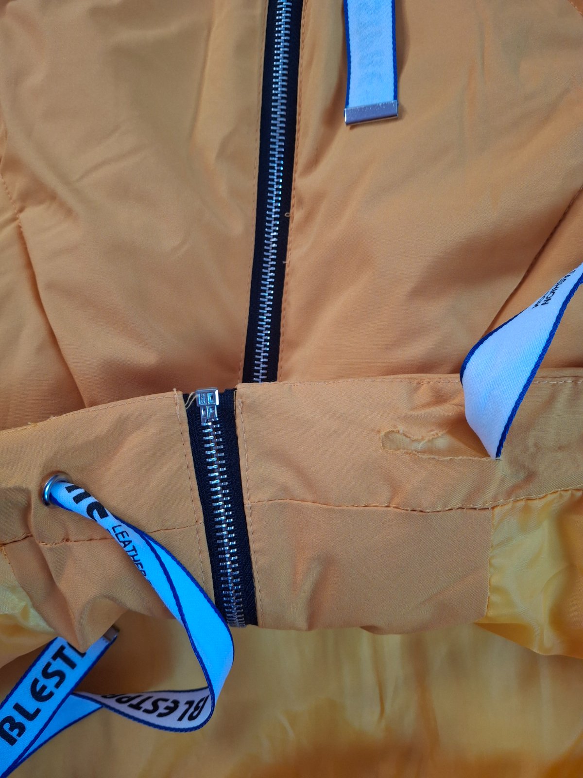 Bunda je v top stave, len z vnútra ako je šnúrka je jedna stana roztrhnutá (viď foto)Veľkosť je uvedená S/M . Farba žlto oranžová.