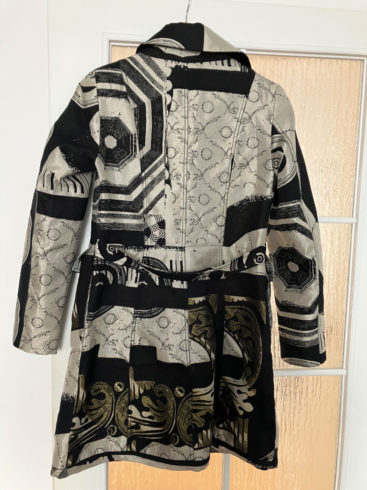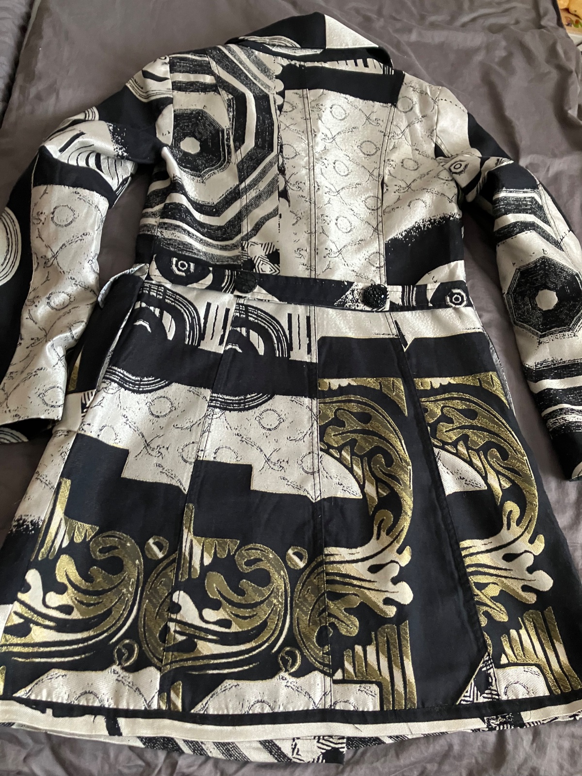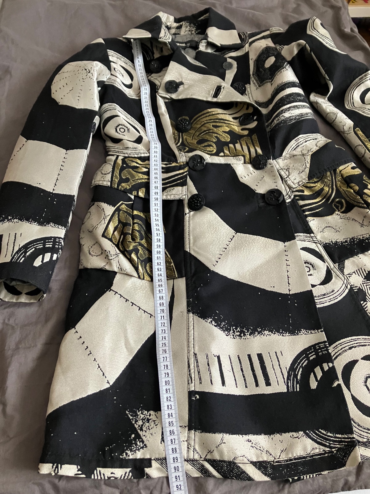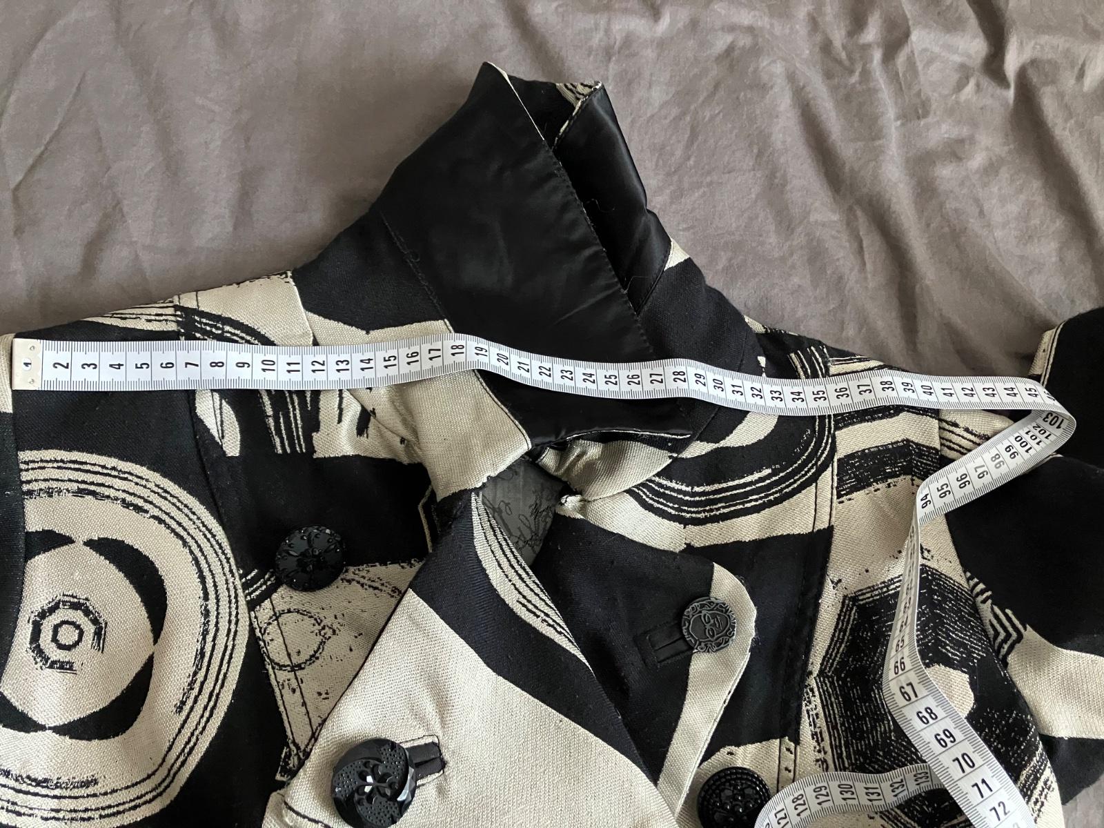 Vzadu má opasok, našité vrecká a v páse je strihaný.