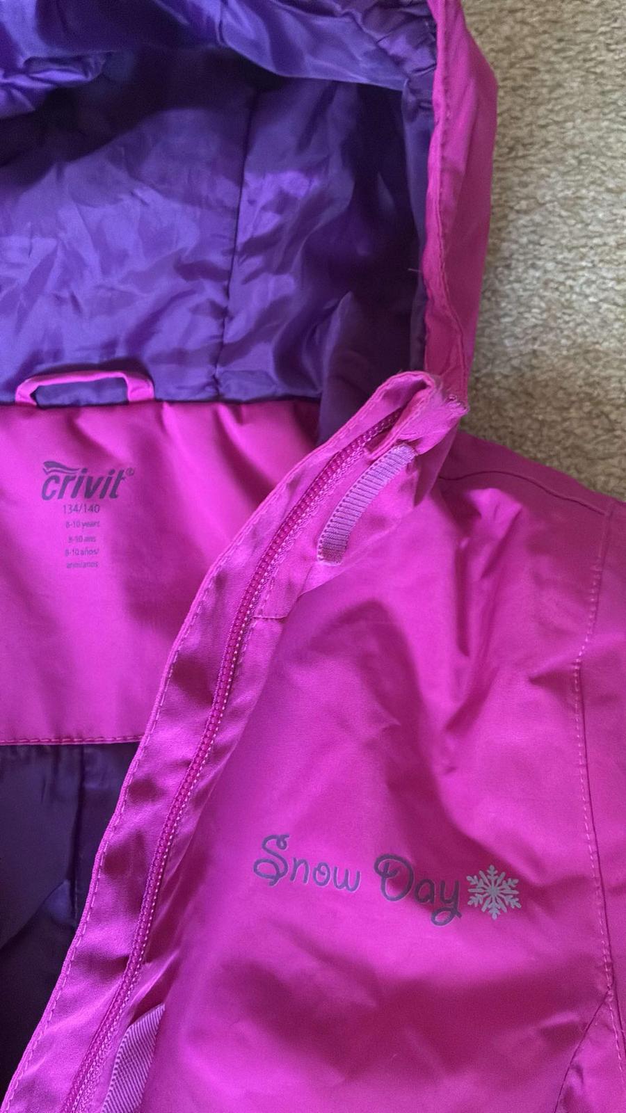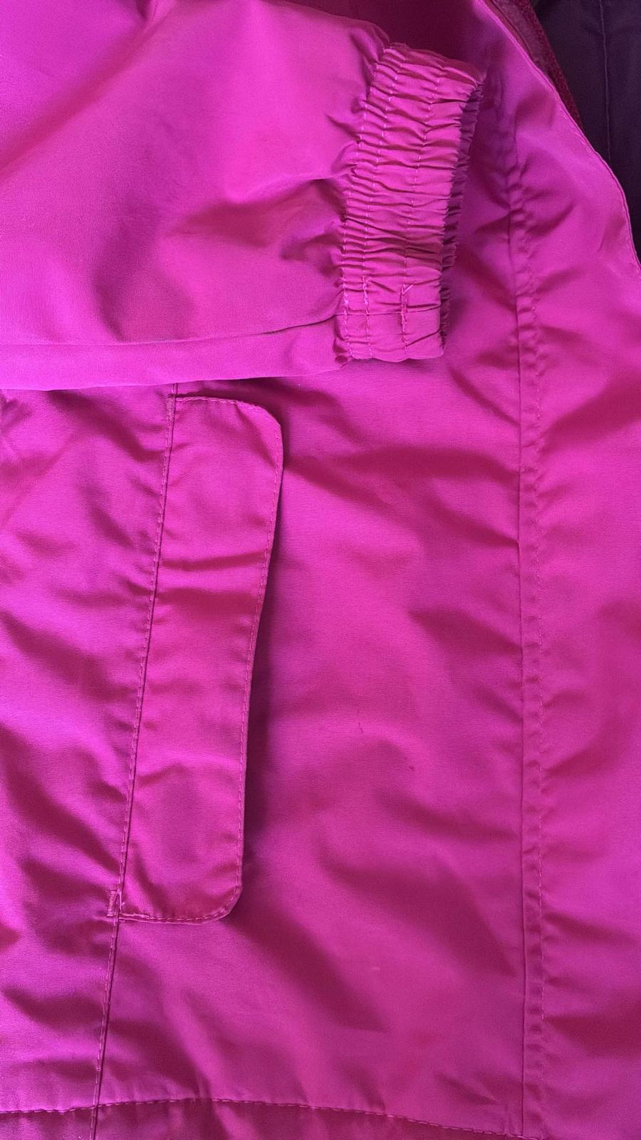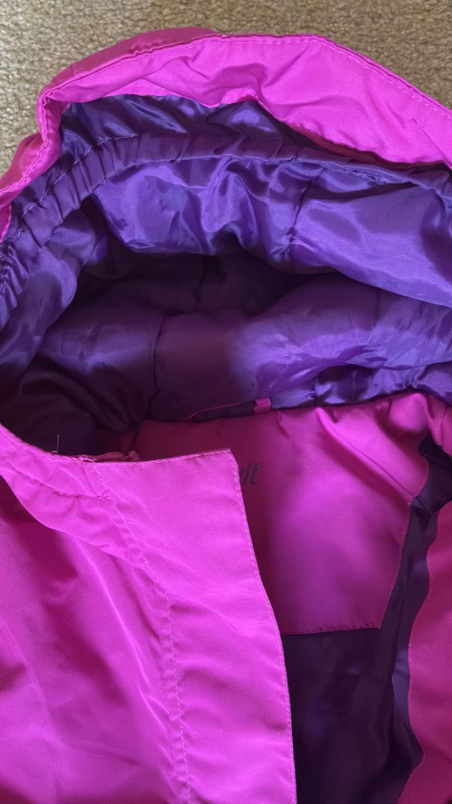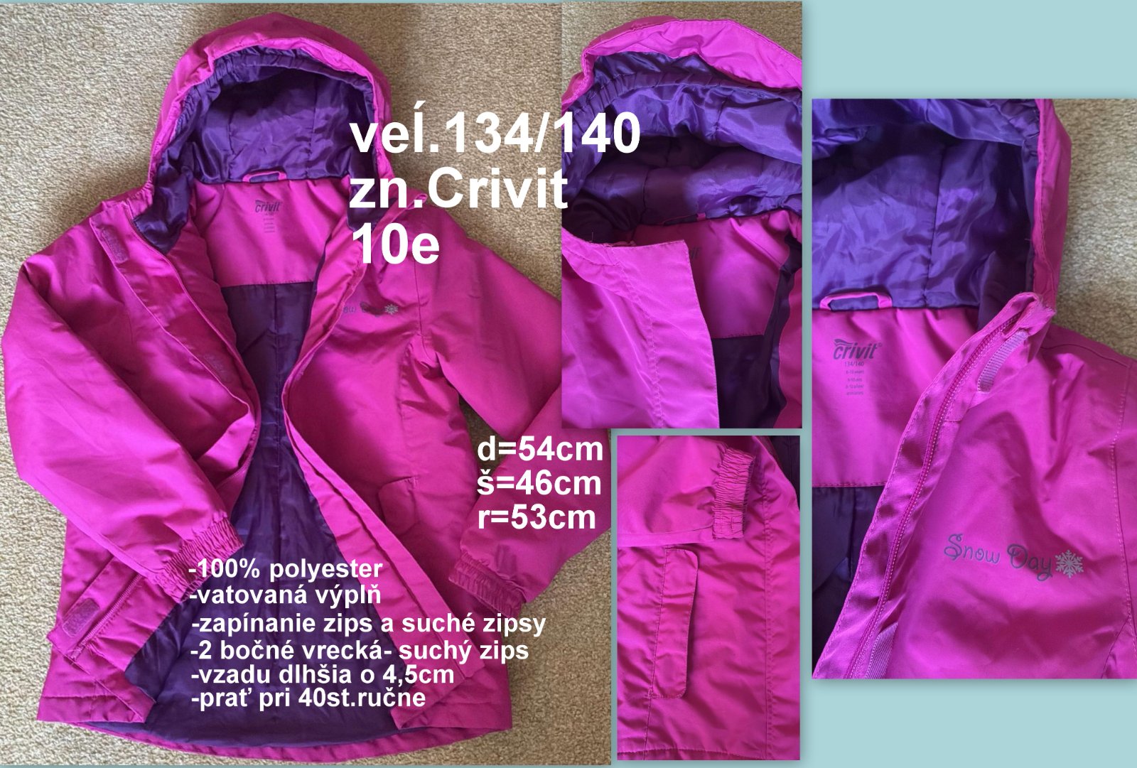 tenšia výplň, kapucňa má vpredu stojačik a suchý zips, futro kapucne fialové, okolo tváre šilt a gumička, vzadu dlhšia o 4,5cm, prať pri 40st ručne, zapínanie zips + suché zipsy, top stav