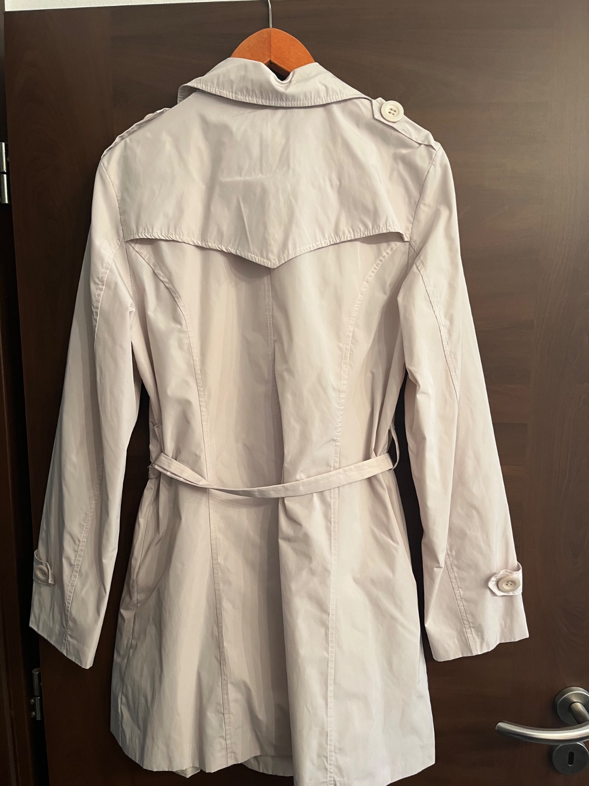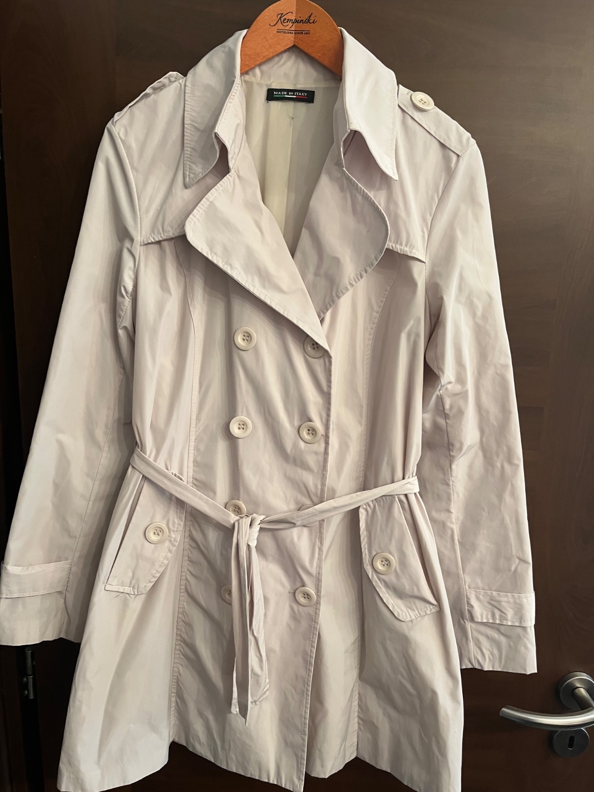 Elegantny trenčkot bežovej farby s podšivkou, vhodny aj do mierneho dažďa, material je pogumovany. Dovoz Taliansko, značka Made in Italy. Velkost xl na vSku asi 175cm.