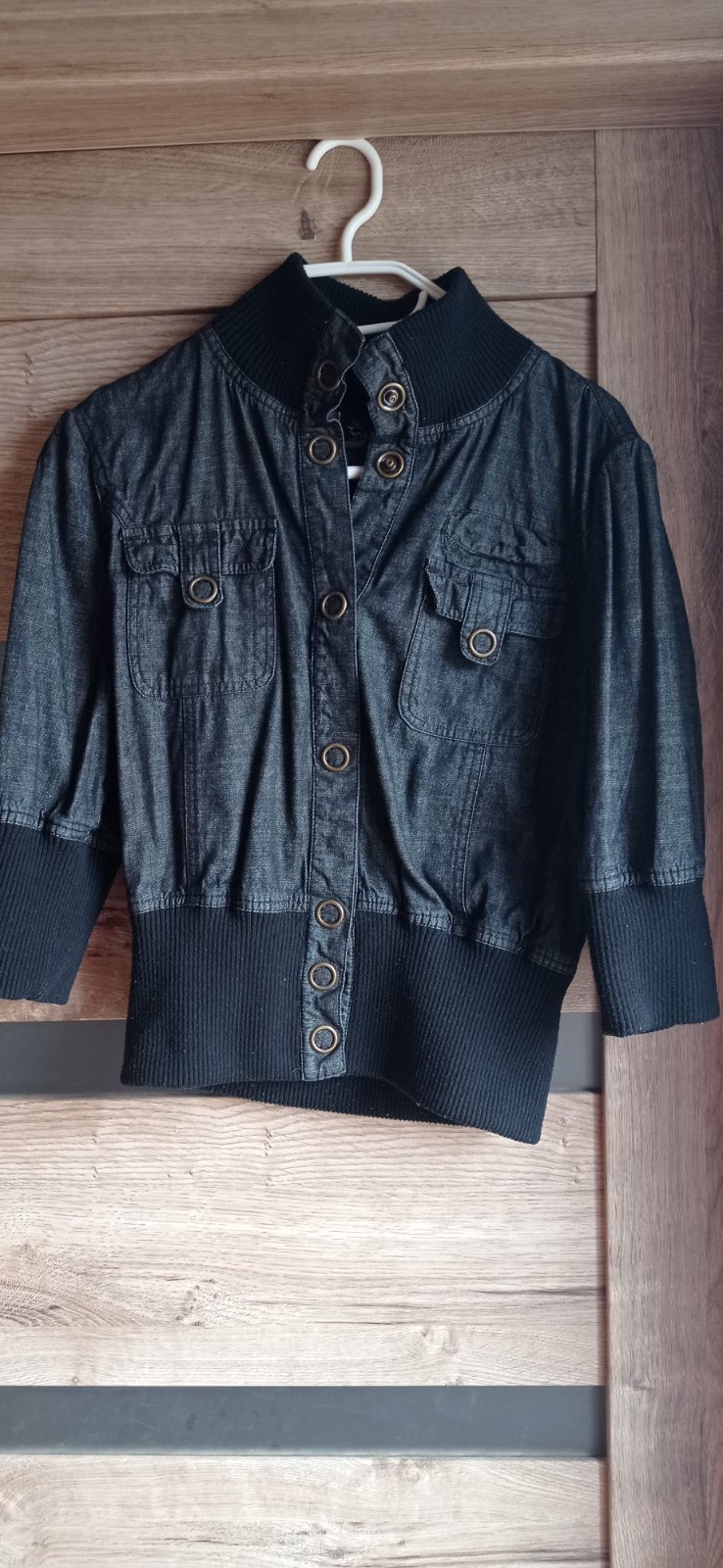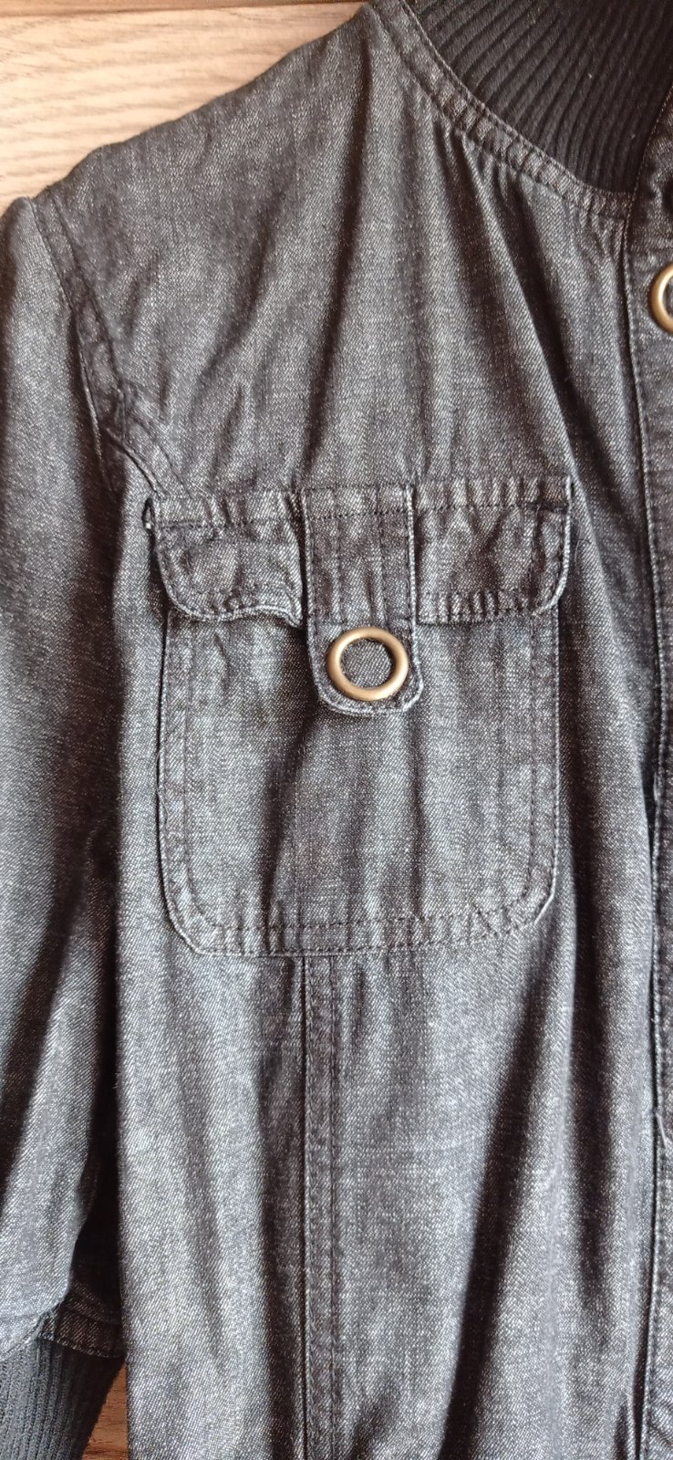 Predám bundičku z tenkej akoby rifloviny. Nosený stav. Písaná veľkosť L. Rozmery prsia 2x 53cm. Dĺžka cca 54 cm. Rukavy su akoby tristvrtove od pleca 41cm. Zaujimavy kusok 🙂