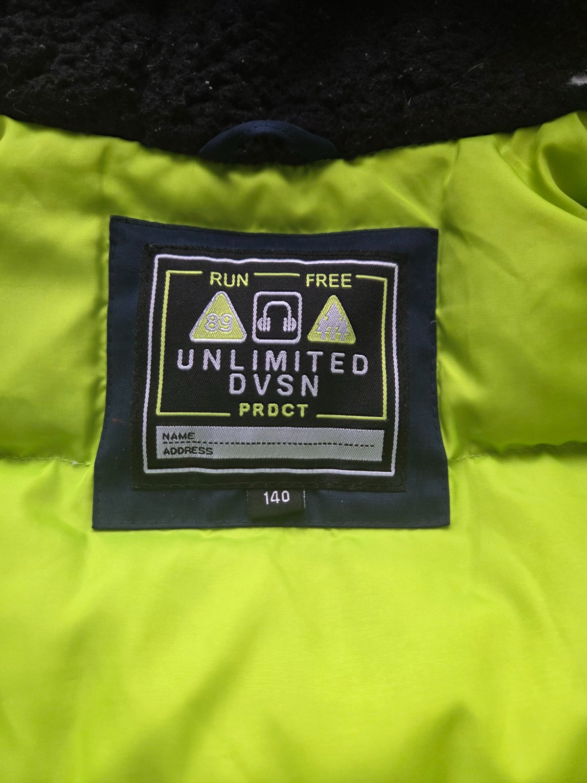 Bunda zimná,vel.134/140, bez poškodení,reflexné prvky,snežné pásy rozmery: sirka pod pazuchami 48 cm, dlzka rukava od krku 61 cm, dlzka chrbata 62 cm