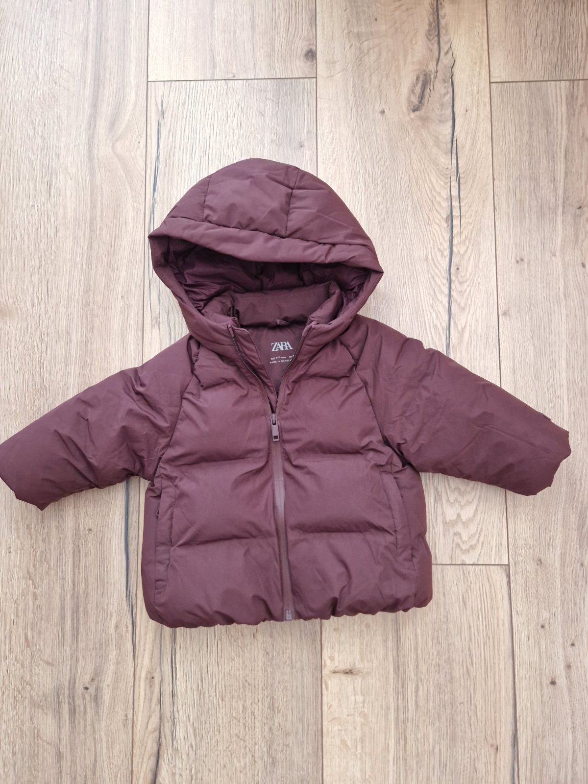 Veľmi pekná predĺžená bundička, farba taká bordovo-fialová-rmavšia ako na fotkách. Je to taký lesklý materiál, na svetle sa "premieňa".Na malom kúsku vzadu zašívaná,pri nosení to nevidieť.