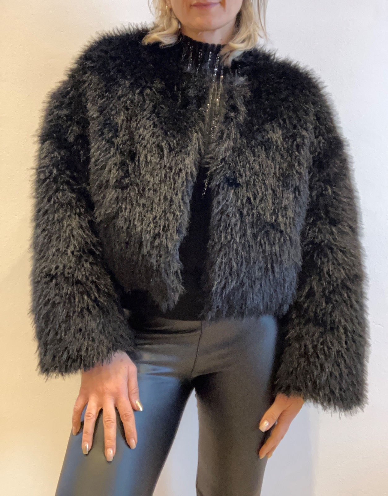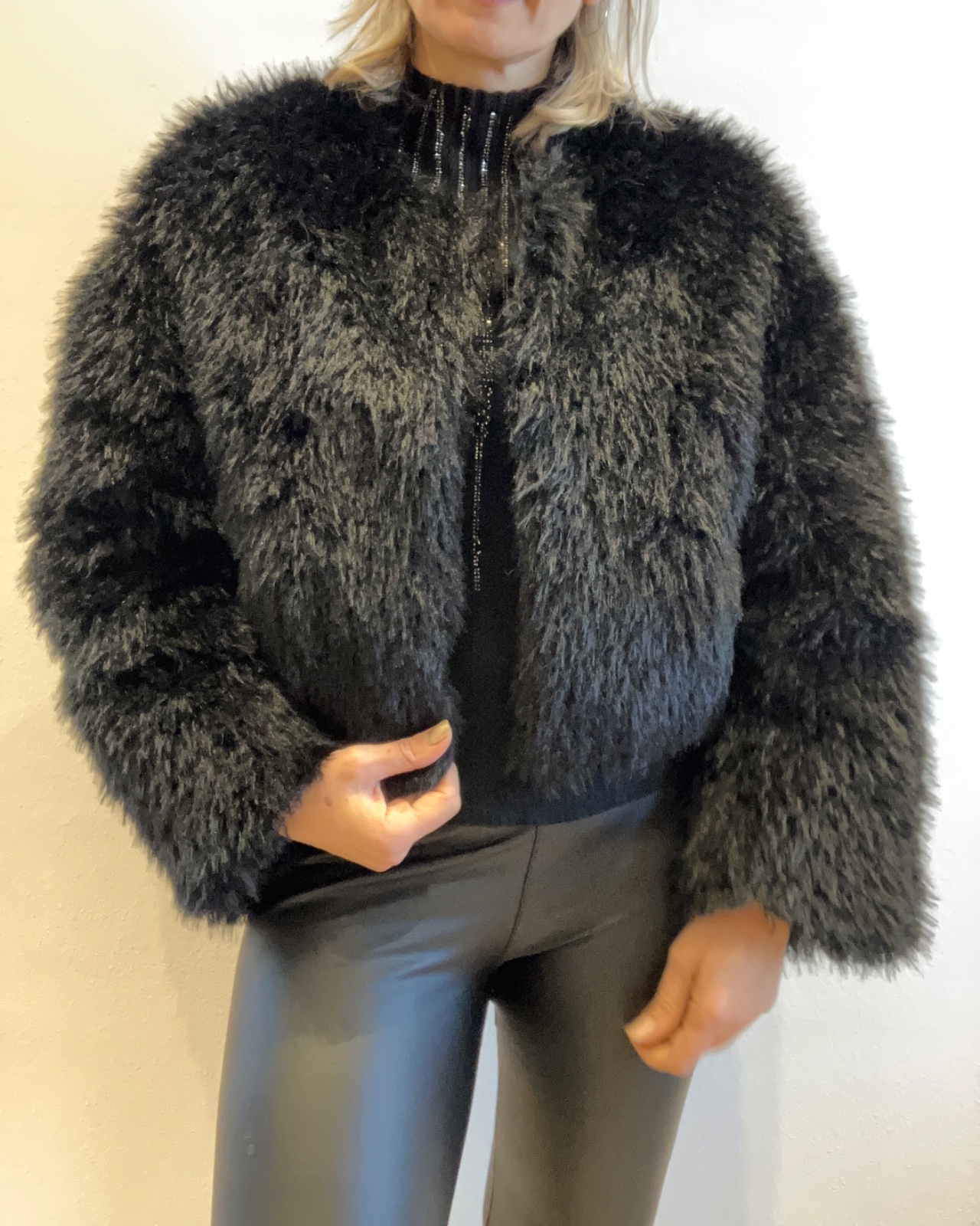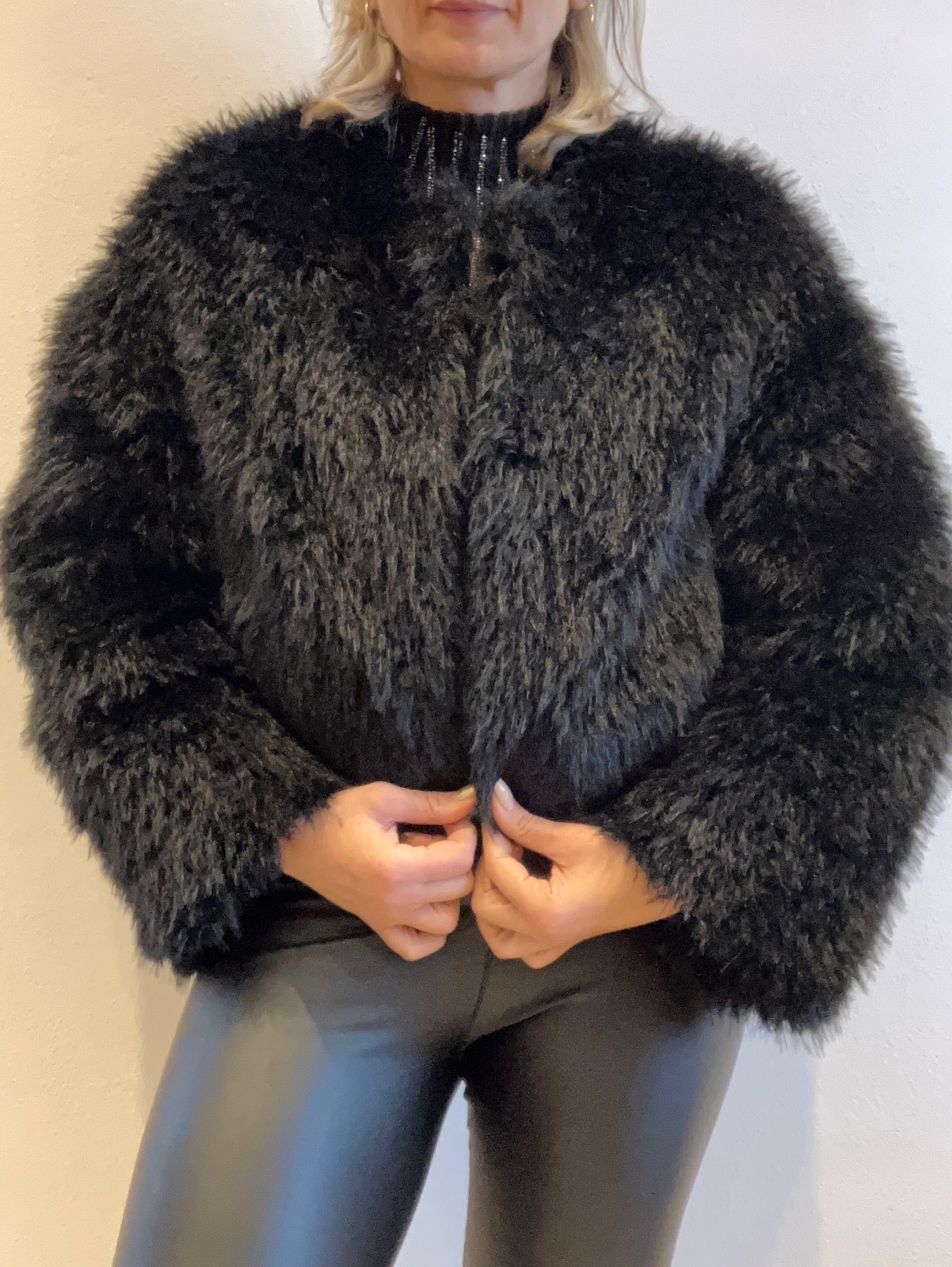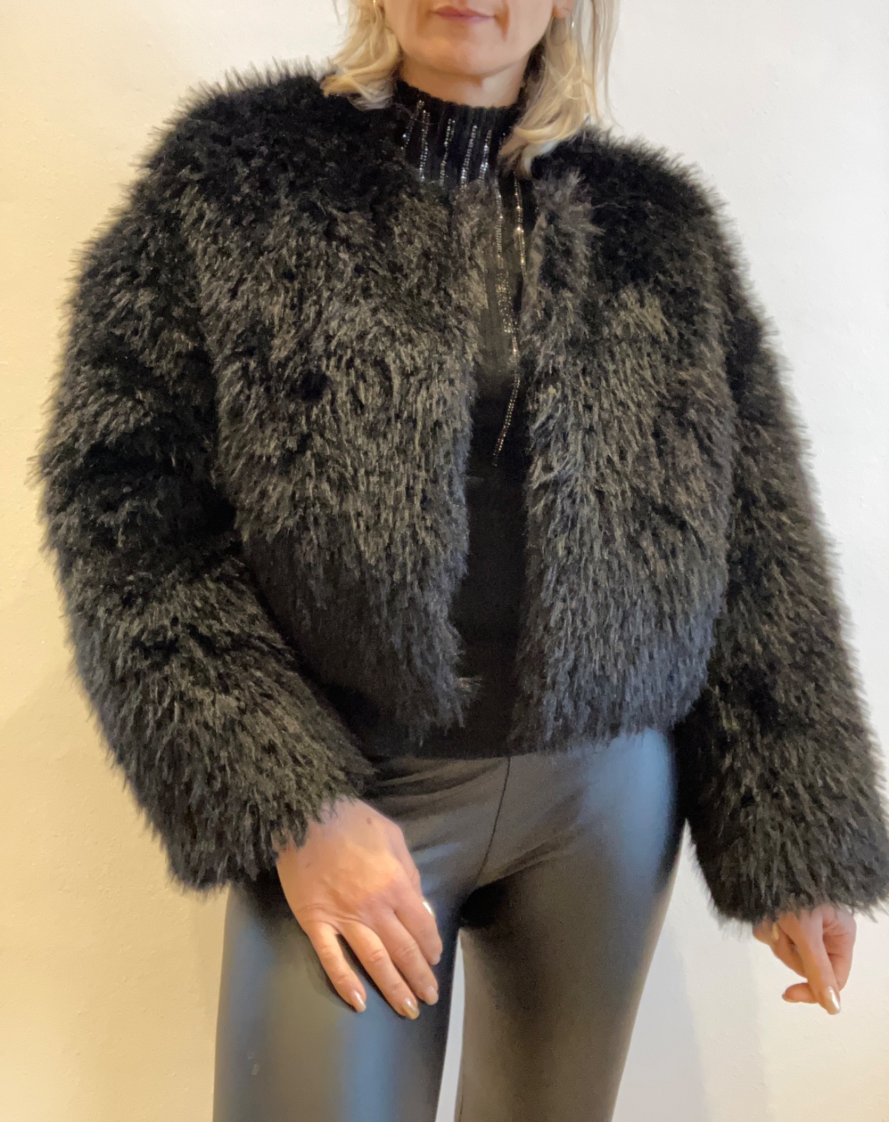 Dámsky čierny huňatý kabátik. Elegantný ale je vhodný aj na bežné nosenie. Zapínanie na tri cvoky. Podšitý. Hrubý. Materiál: 100% polyester. Krajina pôvodu: P.R.C.