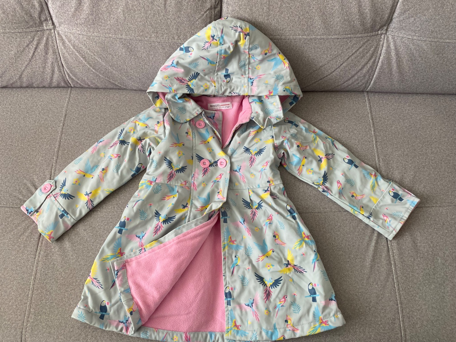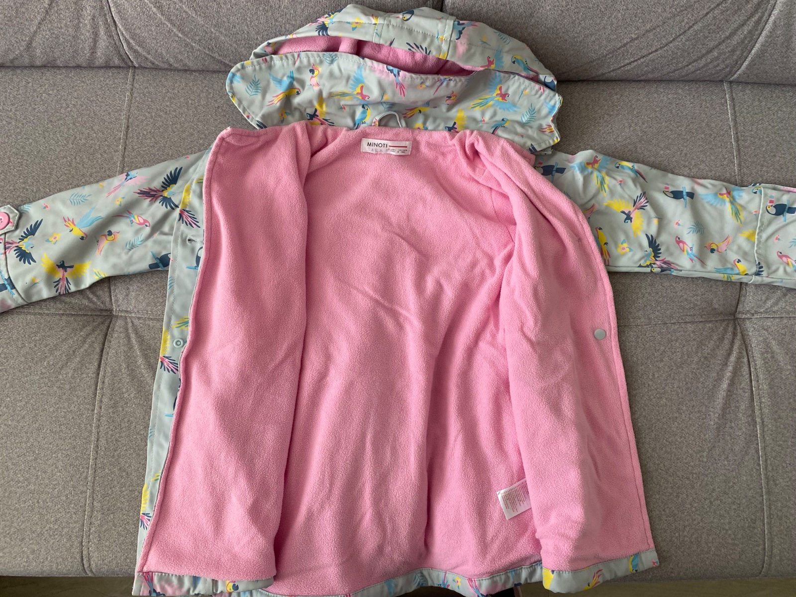 Zvonku je kabátik nepremokavy, nie je to softshell, ale taká pogumovana látka, vo vnútri podsity látkou. Zapínanie na gombíky. Odnímateľná kapucňa. Nosenie vidno len na podsitej látke vo vnútri.