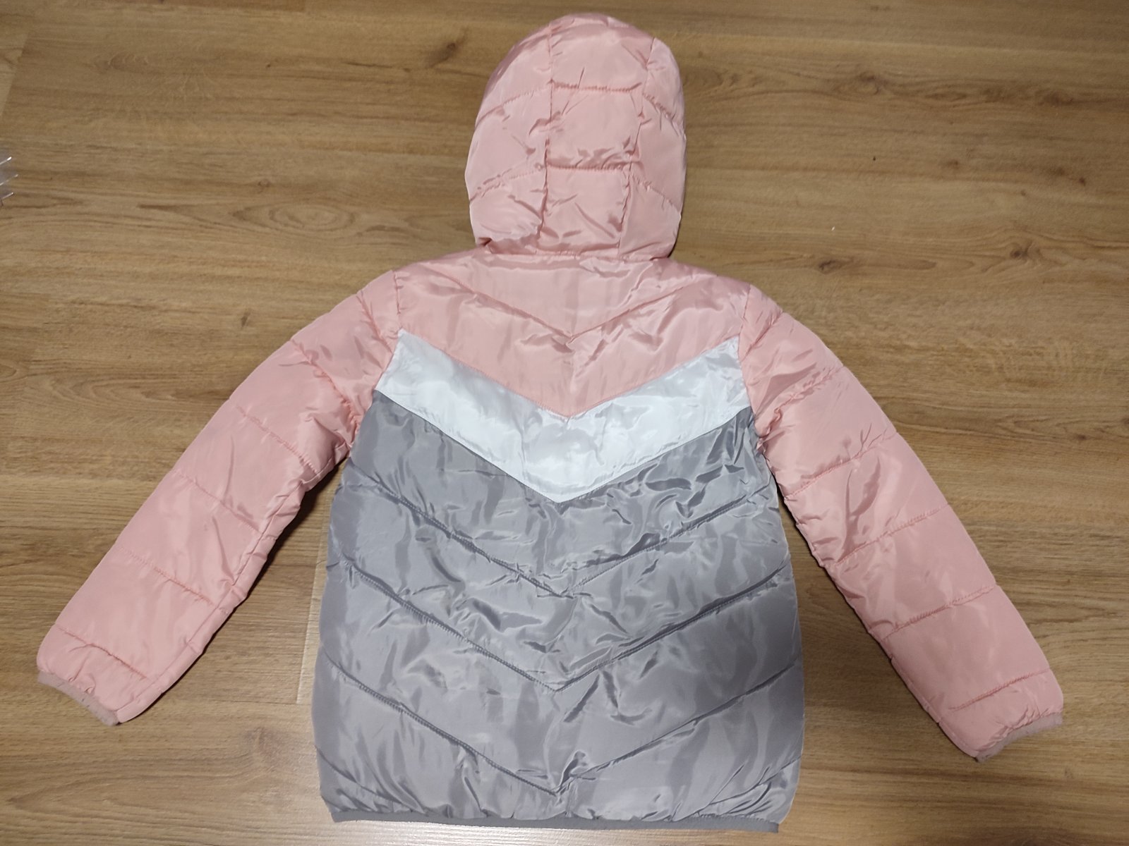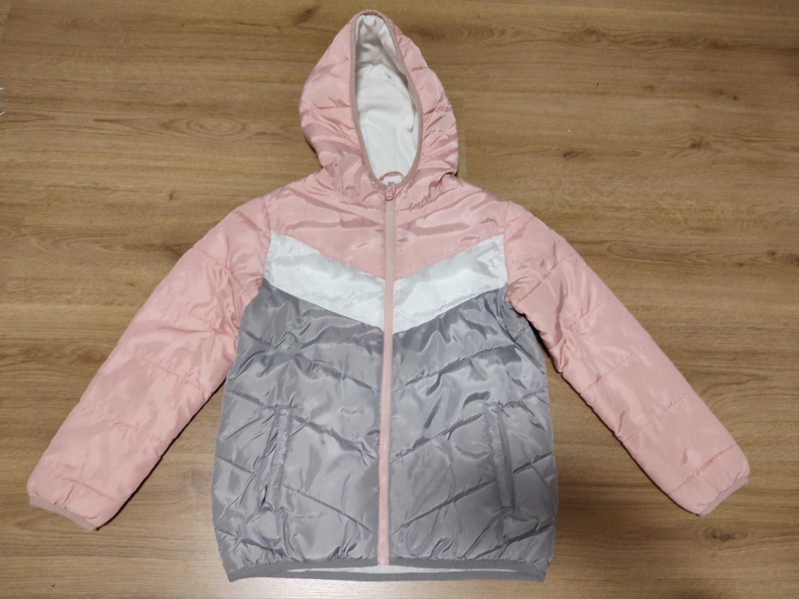 Šedá bundička s ligotavými hviezdičkami, celá je z reflexného materiálu (foto s bleskom v detaili). Rukávy sú ukončené patentom, vpredu má dve vrecká, dole je gumička na stiahnutie. Vnútri sú dva p...