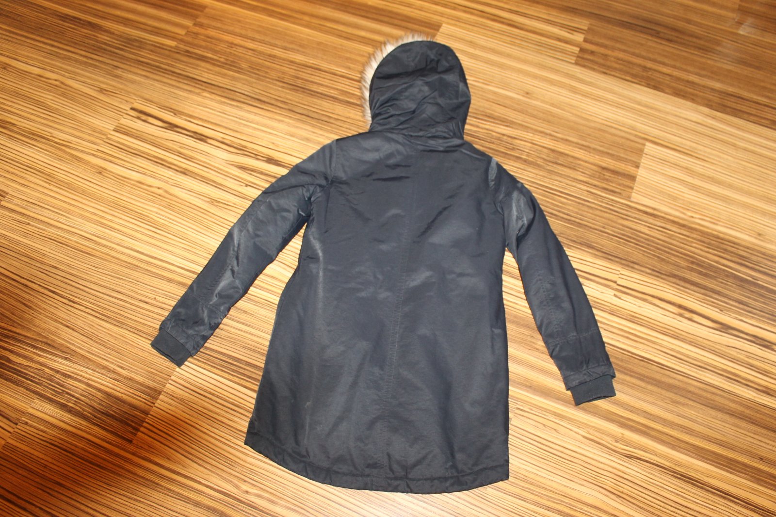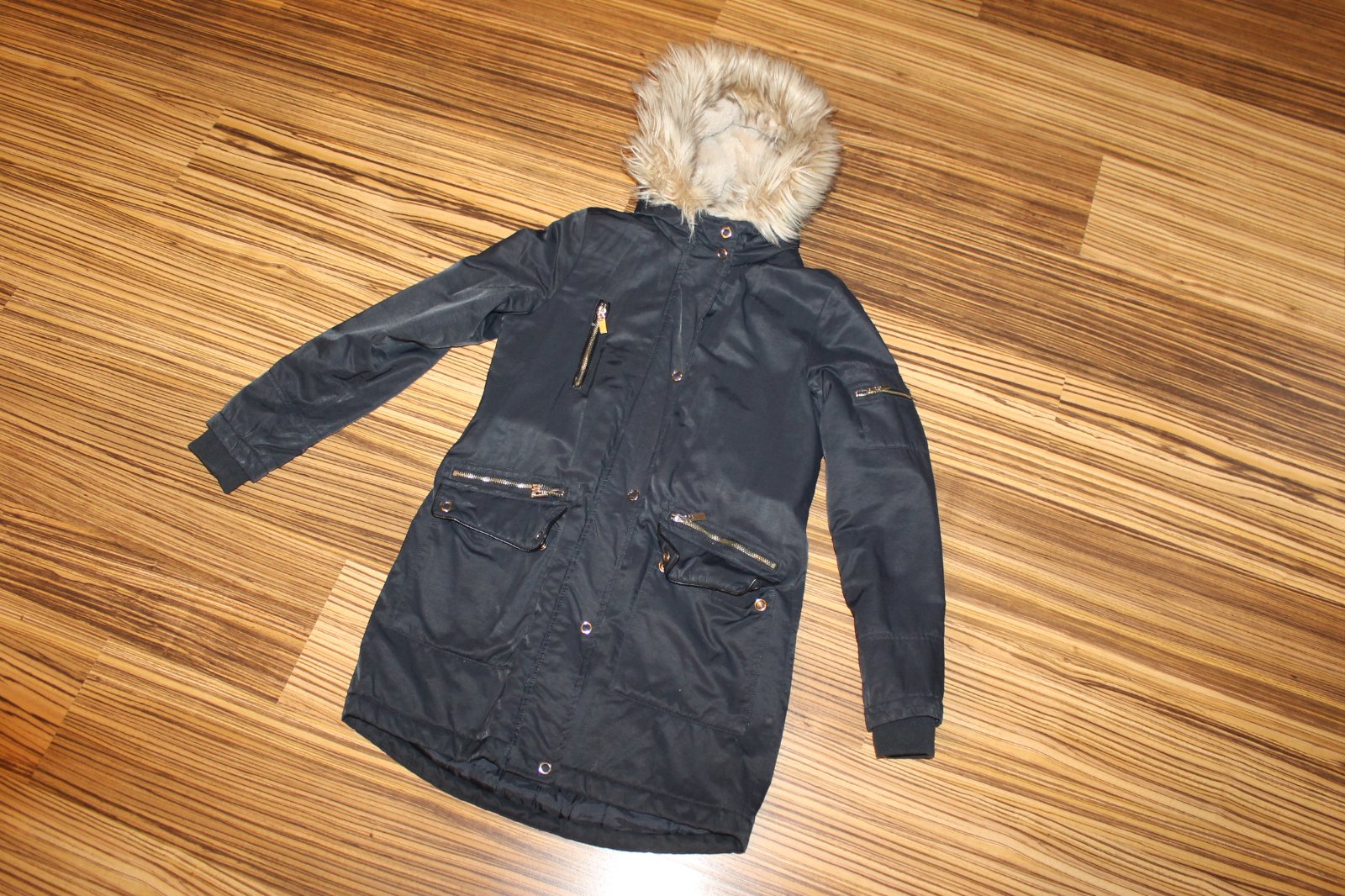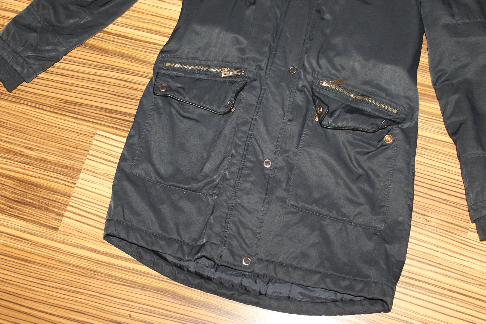 Dámska Zimná bunda/parka so sťahovaním v páse. V super nosenom stave, bez vážnych poškodení, teplučká. Tmavomodrá mierne lesklá tkanina. Veľ. XS, RO: š cez prsia 2x 47 cm, pás 2x 44 cm, boky 2x 53 cm, dl. 75 cm, rukáv od krku 72/49 cm spod pazuchy. Váha 1 130 g.