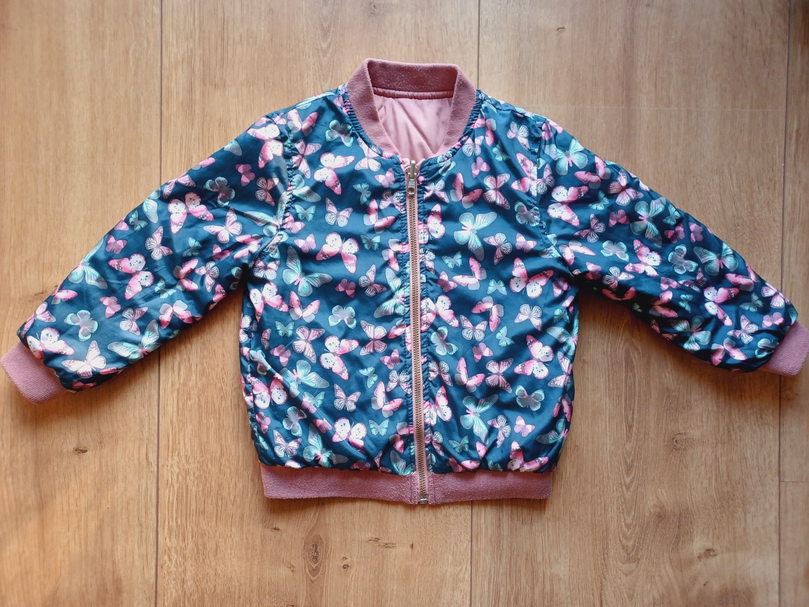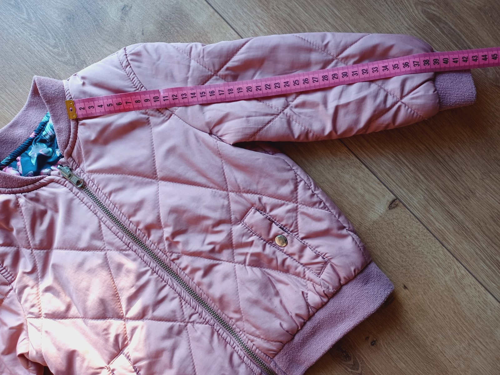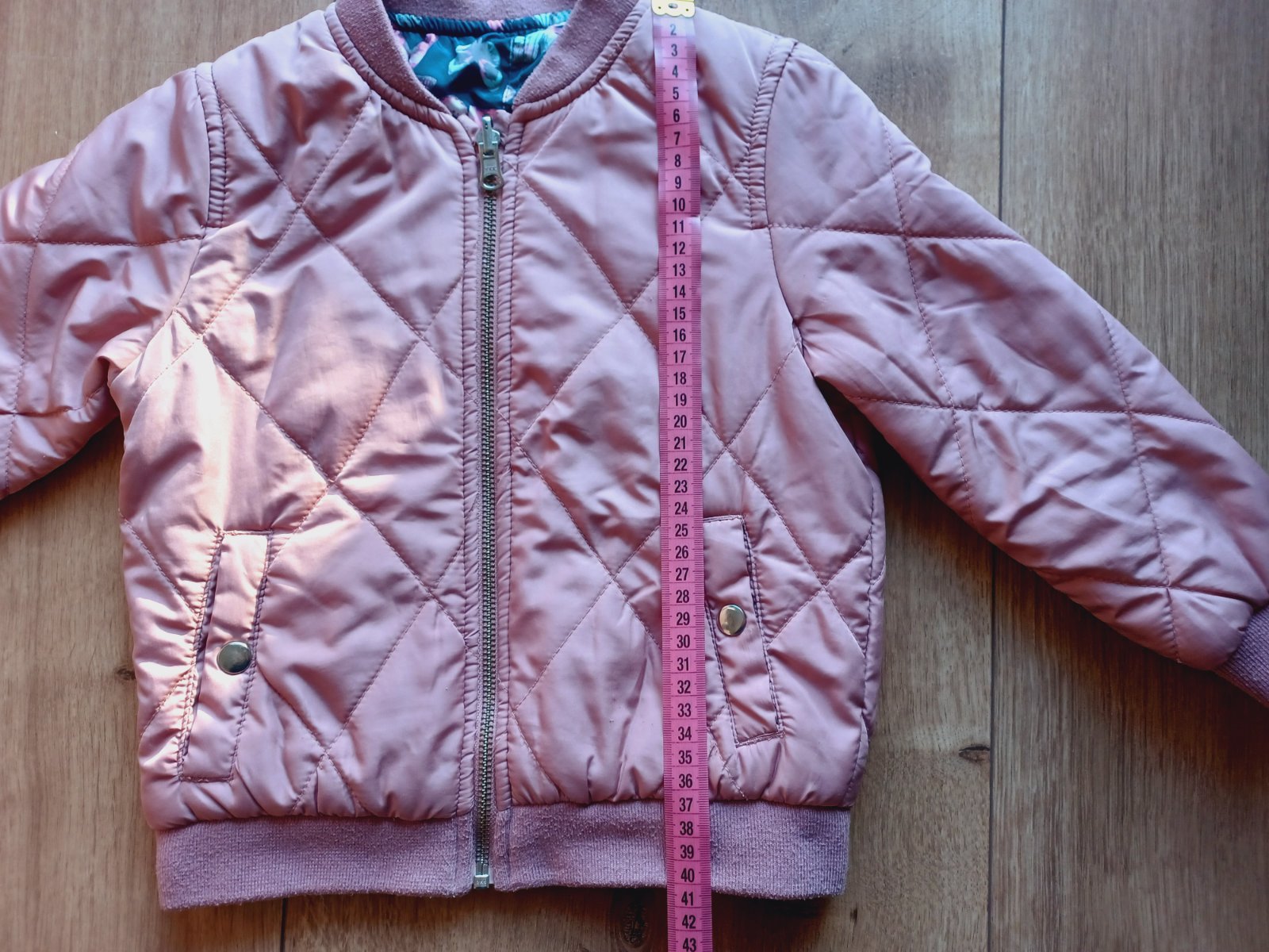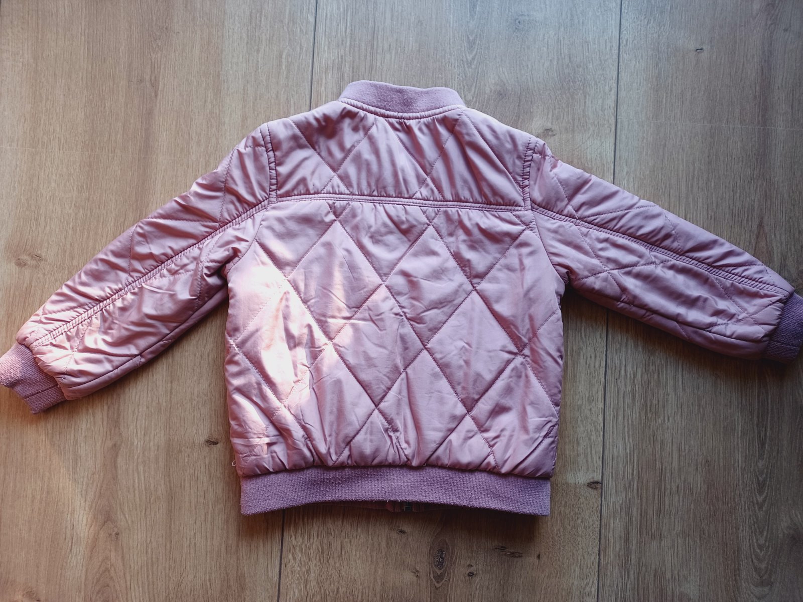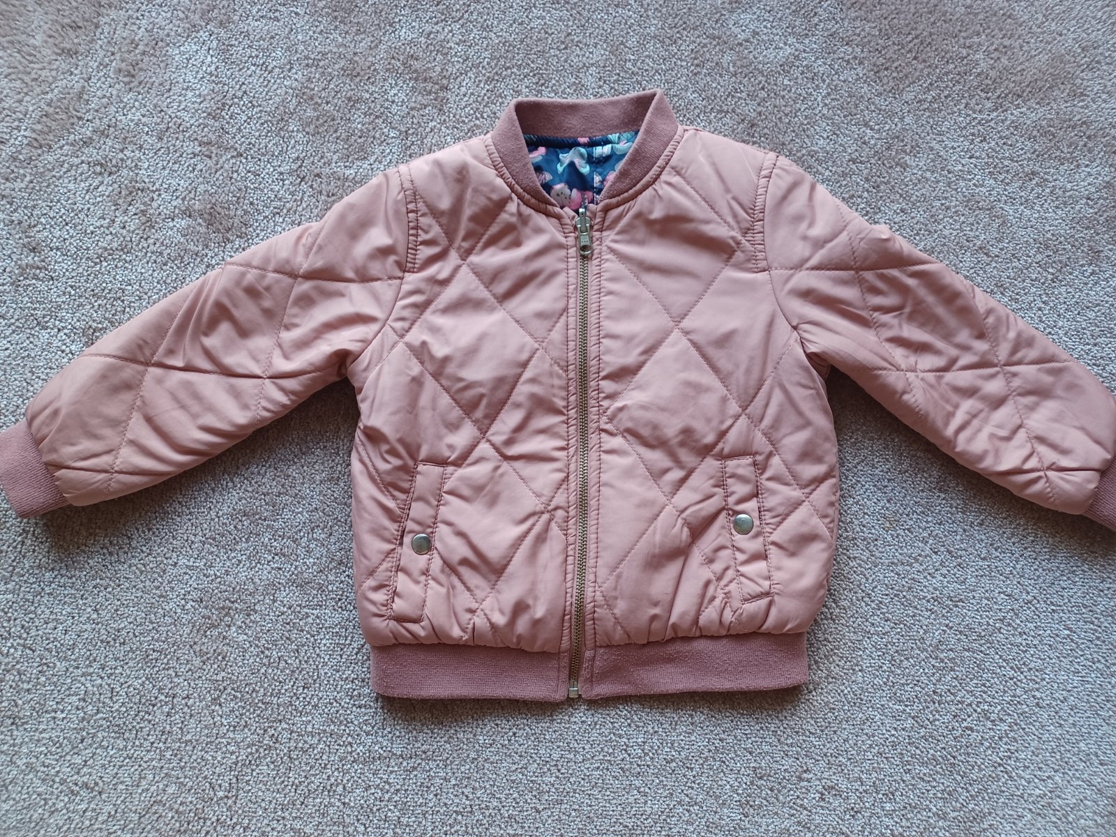 Pekná prešívaná bunda, vpredu má zatiahnutie, viď foto, inak je vo veľmi peknom stave. Je obojstranná. Farba ako na úvodnej foto.