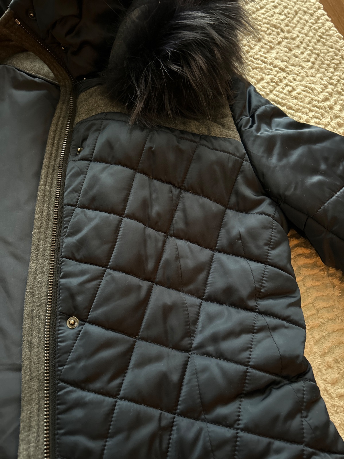 Kvalitná značka, pc vysoká, výplň ťavia srsť, sivý materiál vlna, pravá kožušina, množstvo funkčných detailov, super cena, dole viete dať kapucňu aj kožušinu