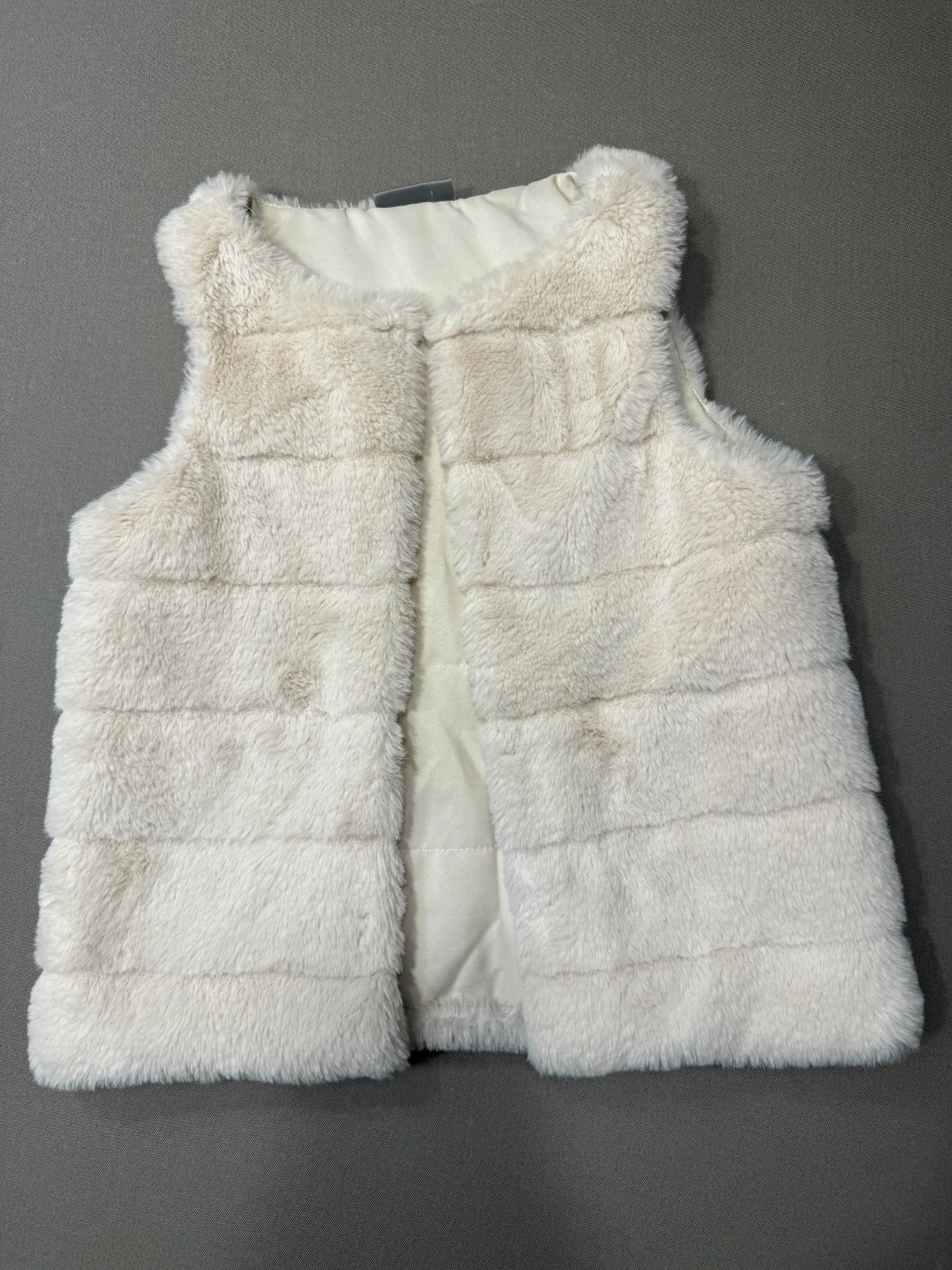 Kožušinova vestička veľkosť 134. Vhodná ako v prechodnom obdobi, tak aj v zime pod bundu. Jemná, veľmi malo nosena. Dá sa aj zapnut cezbhrudnik na háčik. Sirka cez hrudnik 41cm, celková dĺžka 49cm.