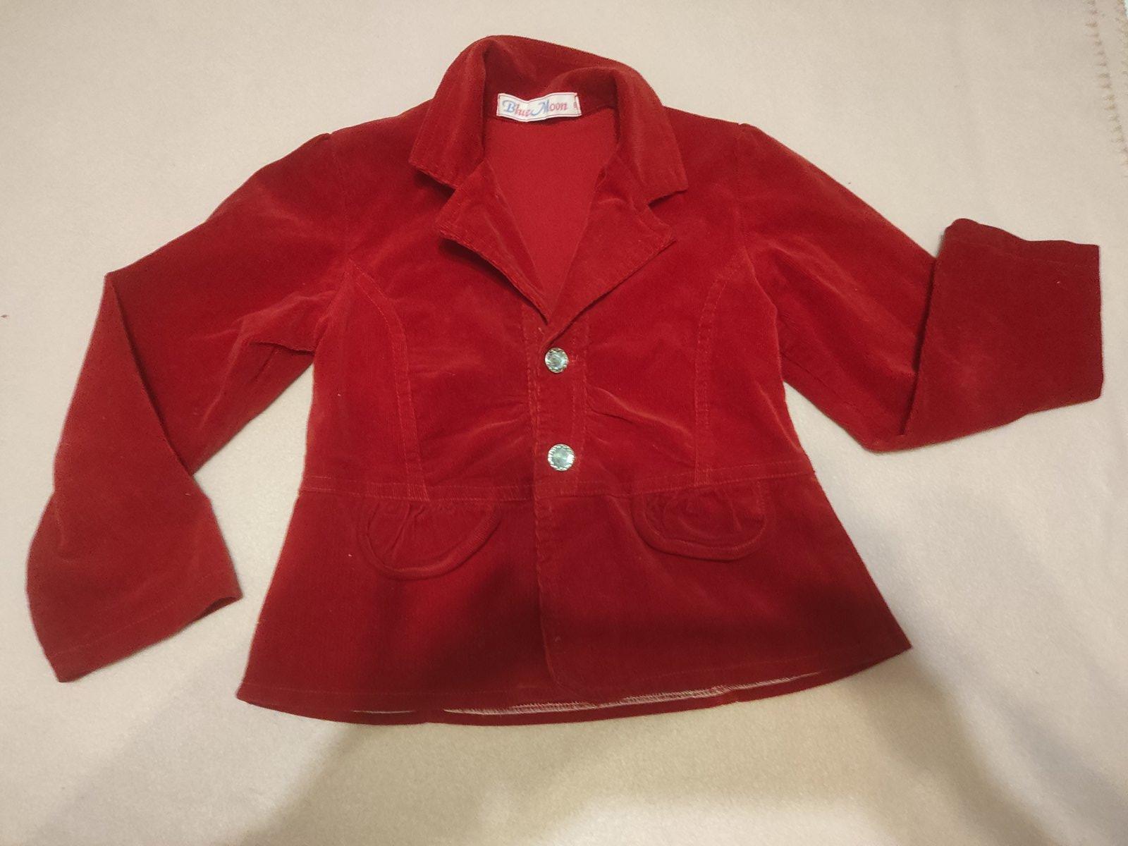 Červený kabátik s kapucňou. Má praktické zapínanie na patenty a jeden ozdobný gombík. Kabatik je vhodný k sukničkám i k nohaviciam. Celková dĺžka je 55 cm,šírka na hrudniku je 34 cm. Vonkajšia dĺžk...