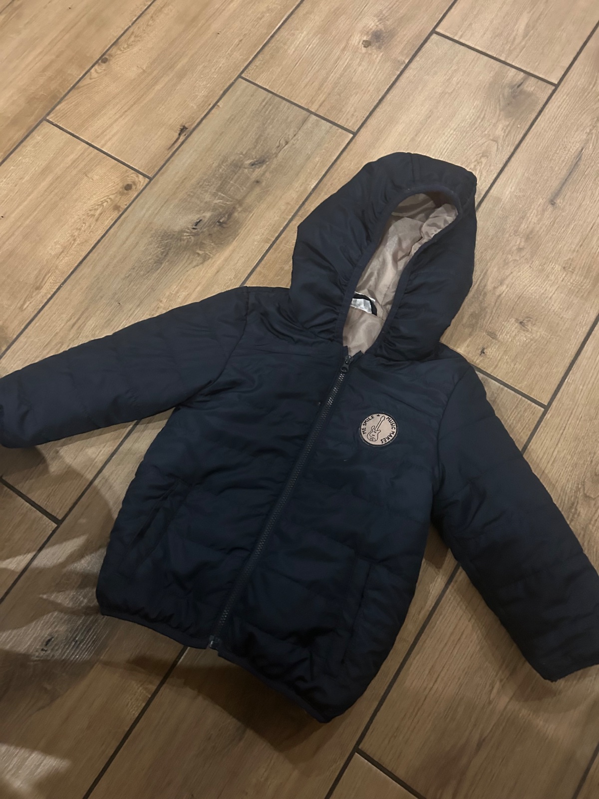 Pekná prechodná bundička, vhodná aj do dažďa, my sme ju mali ako rezervnu a maximálne 2 krát sme ju mali na sebe. Farba tmavomodrá s modrou a šedou, značka So Cute, veľkosť 92.