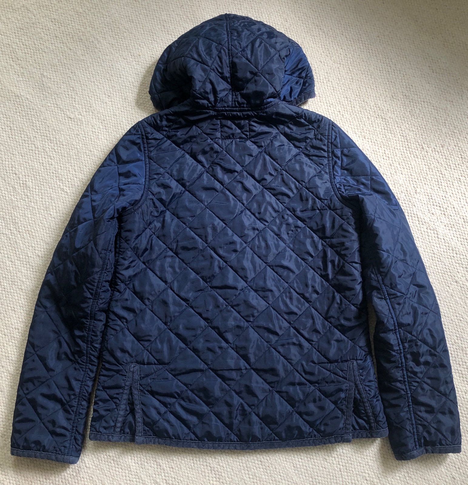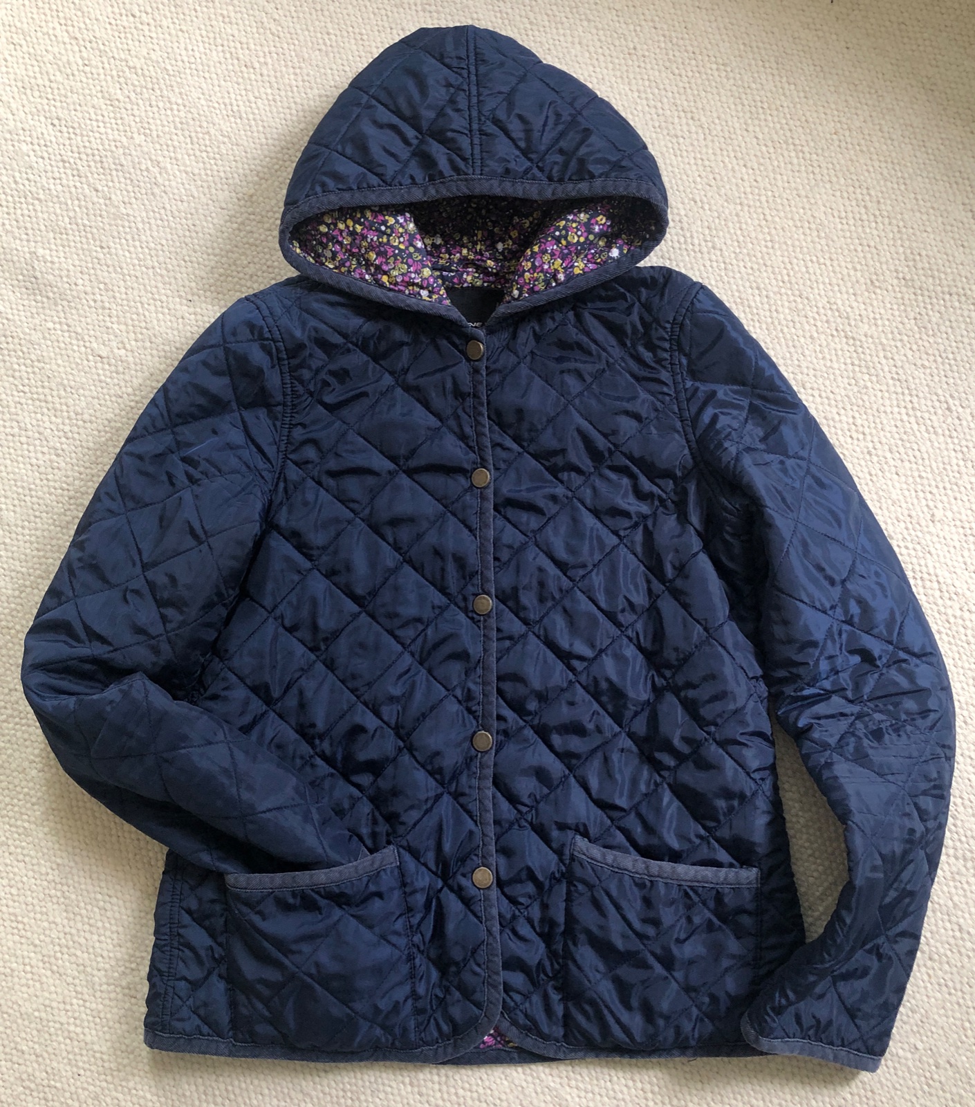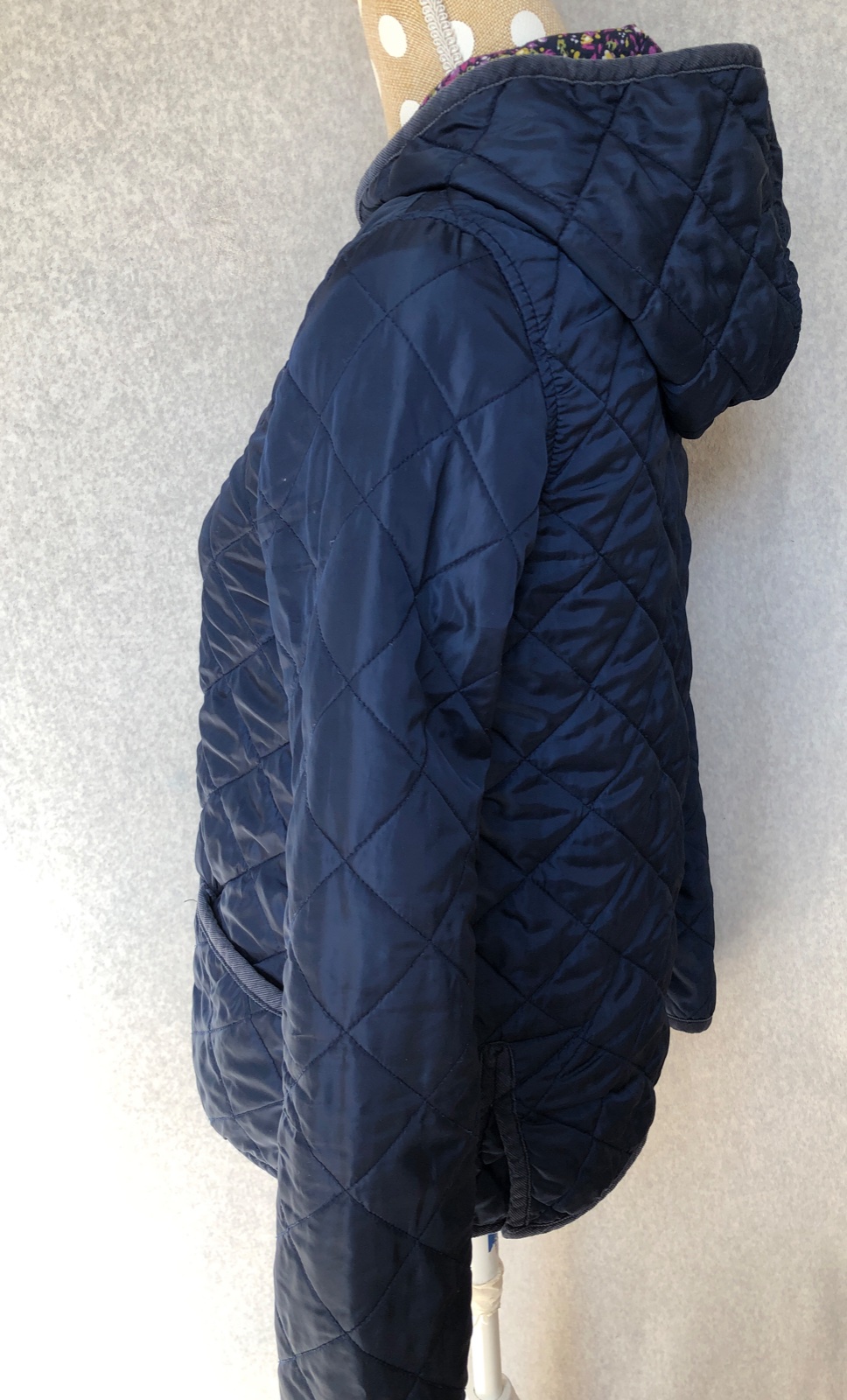 Prešívaná štýlová bundička na štýl Barbour. Vhodná na prechodné obdobie alebo aj teplejšiu zimu. Lemovanie bundy je z menšestrákovej látky, zapínanie na patentky v zlatej farbe s patinou, predné vrecká, kapucňa, vnútro je z farebnej kvetinkovej bavlnenej látky, vzadu sú po stranách rozparky.