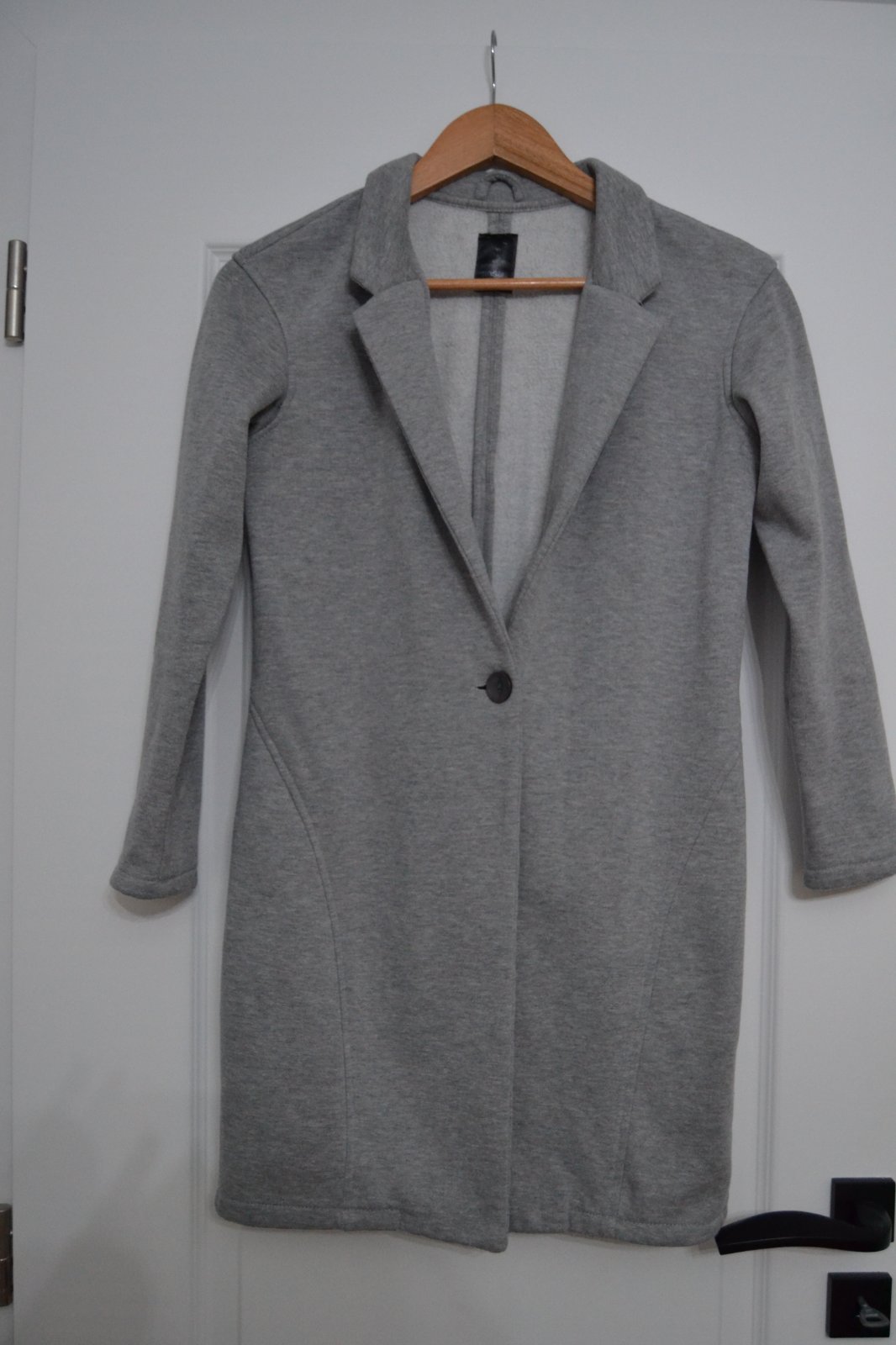 Predĺžené úpletové sako 'Carrie' vo farbe Sivá, veľkosť M, zapínanie na jeden gombík, obvod cez prsia 45x2 cm, rukávy 48 cm, dĺžka saka 78 cm.