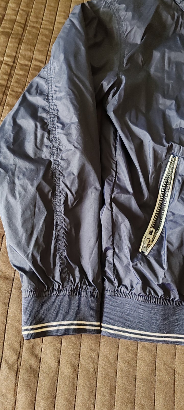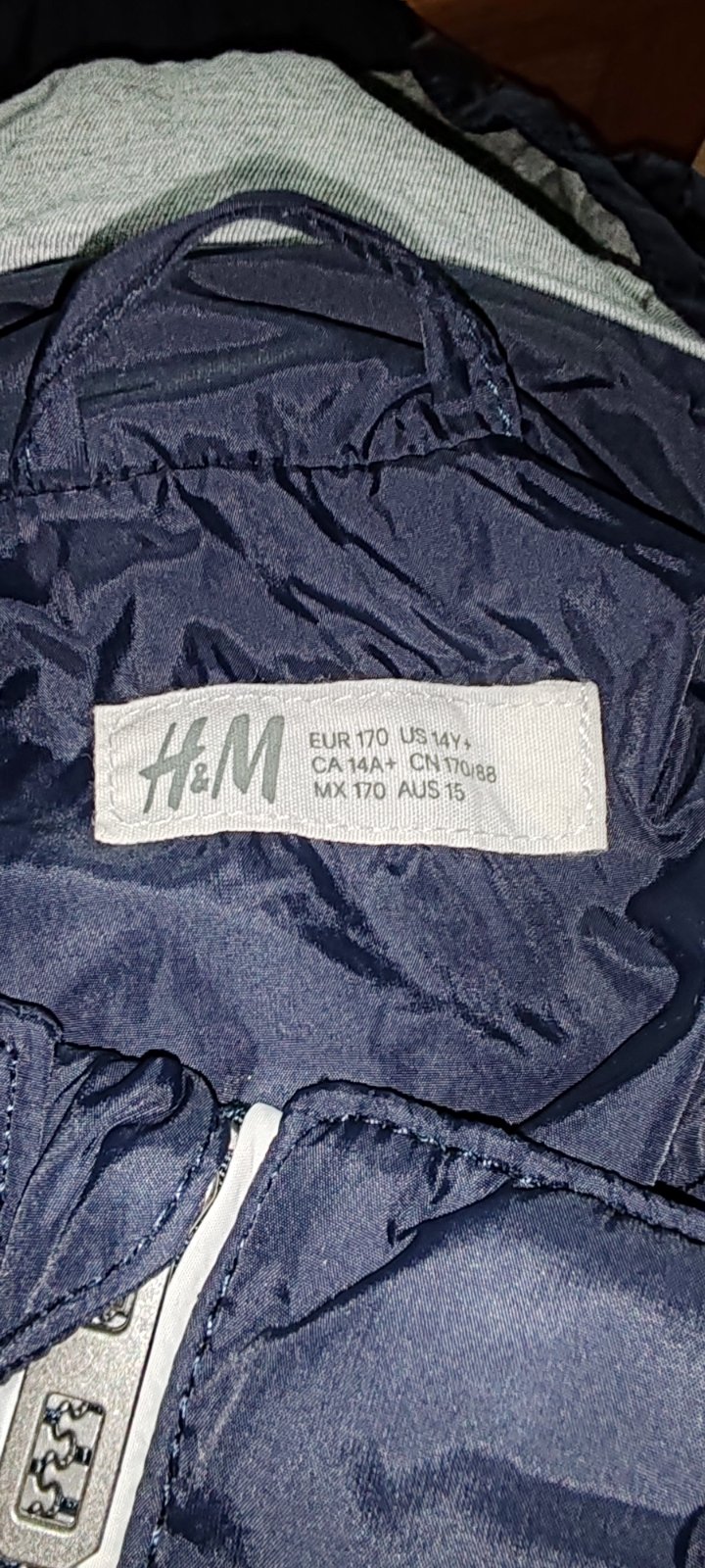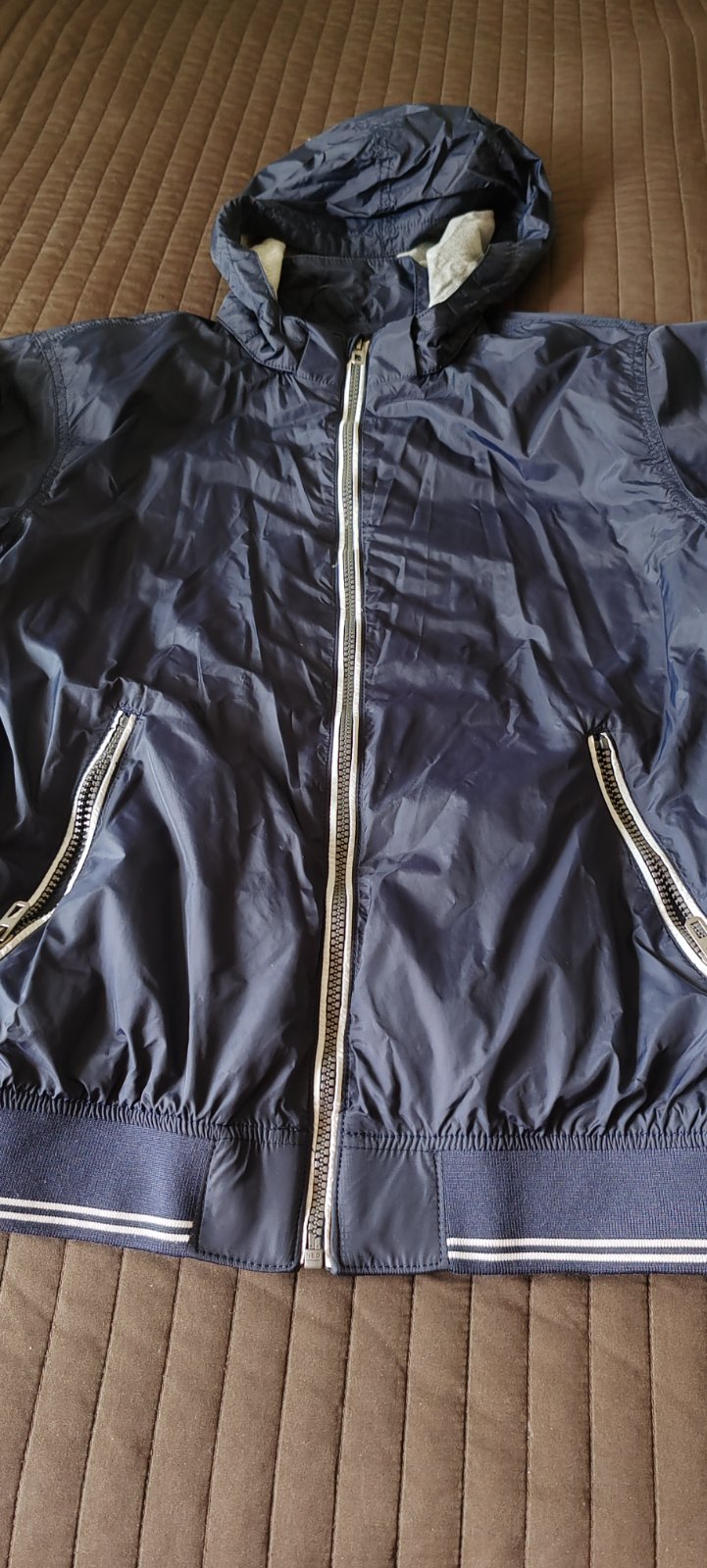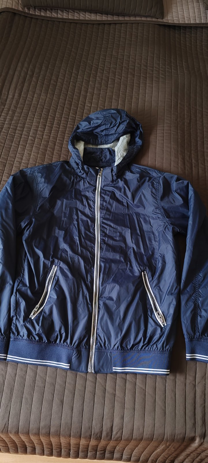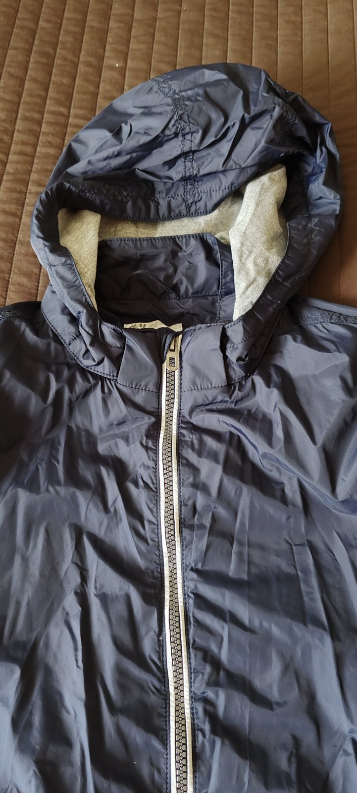 Šuštiaková bunda s kapucňou znacky H&M. Dole všitá guma. Kupovaná nová a nosená veľmi málo. Veľmi dobrý stav. Farba je tmavo modrá ako na prvej foto.