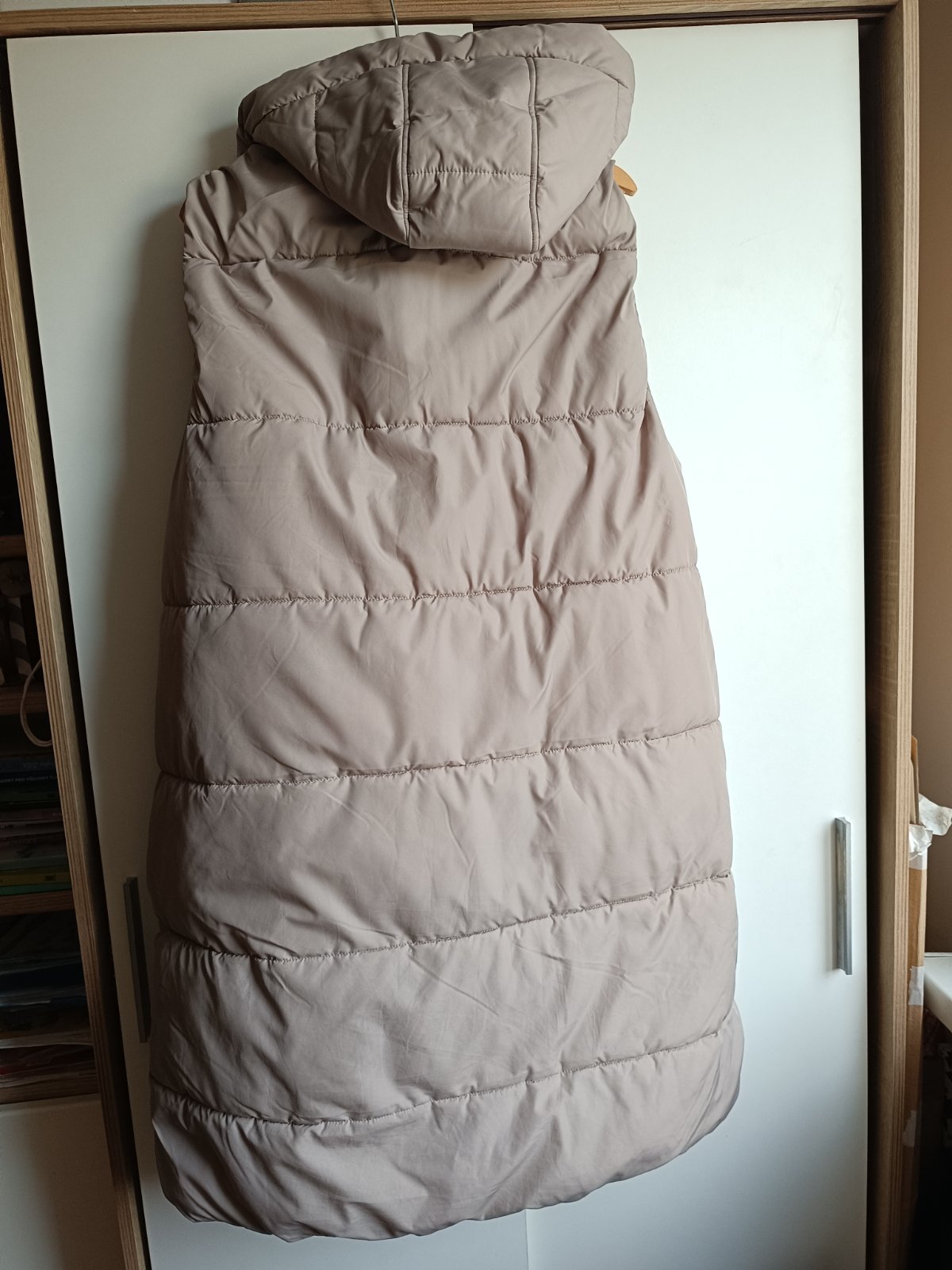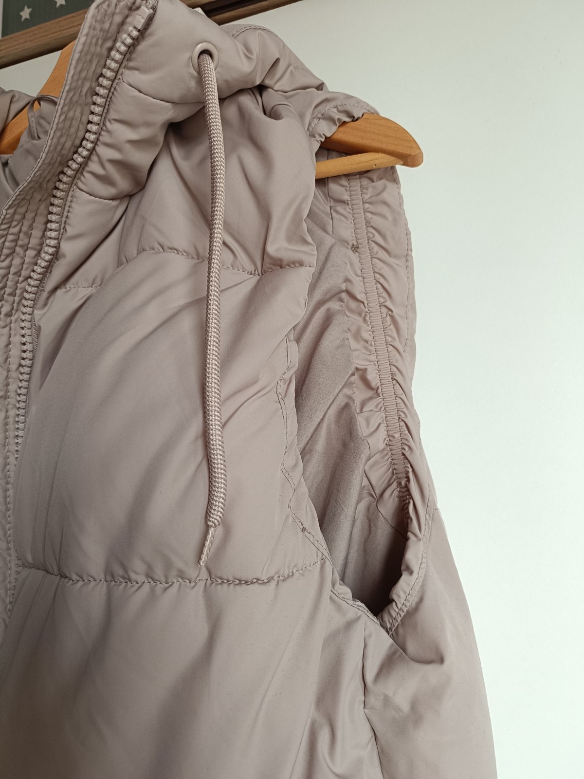 Béžová prešívaná vesta z bavlny a polyesteru. Má 5 vačkov (dva po bokoch, jeden na hrudi). Na bokoch má aj stiahnutie v páse. Značka Cecil