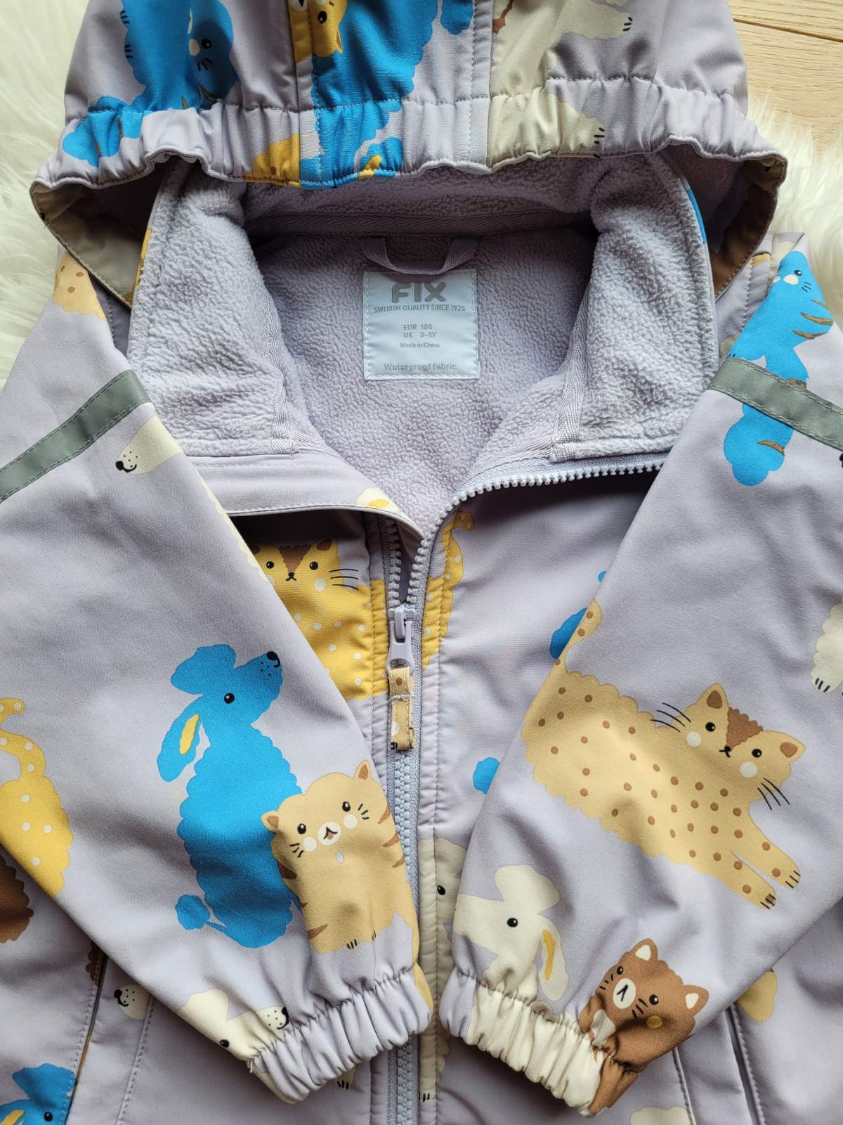 Krasna kvalitna dievcenska zimna bunda s kvetinovymi motivmi, s odnimatelnou kapucnou, pre vek 3-4 roky, velkost 104. Velmi pekna syta fialova farba. Na jednom rukave zozadu je asi milimetrovy pas...