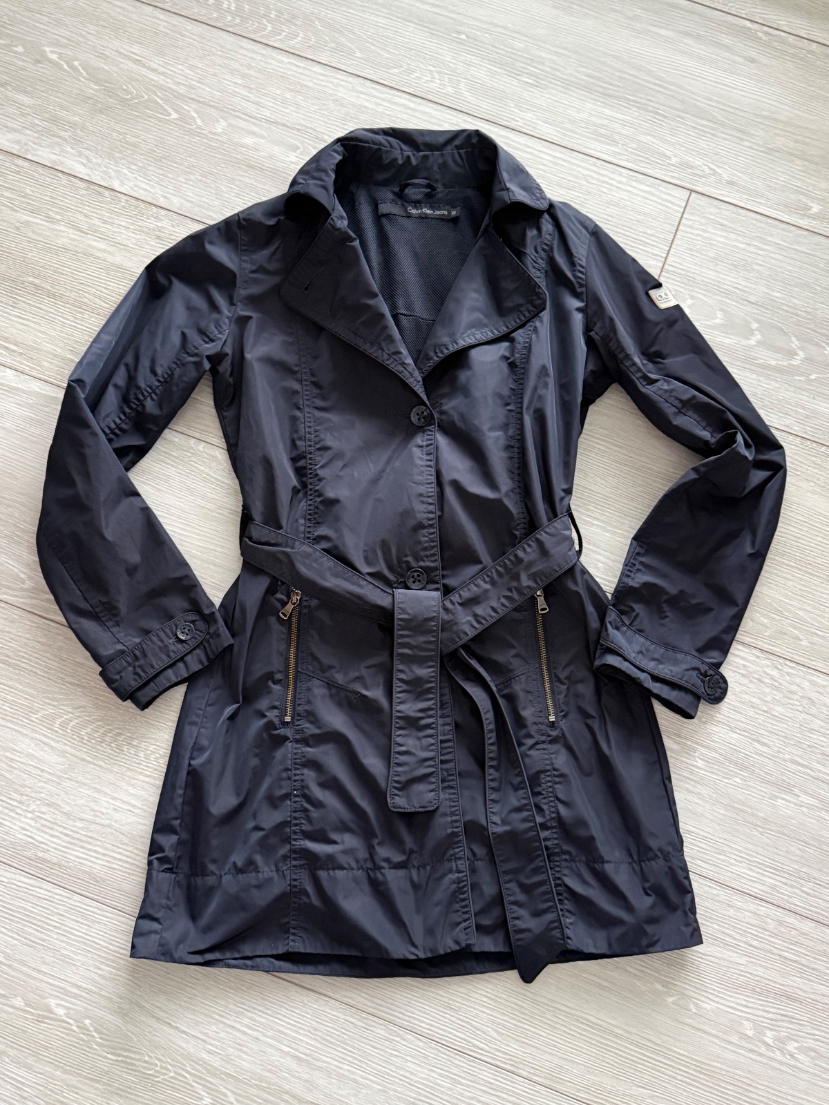 Krásny tenší tmavomodrý kabát Calvin Klein. Velkosť XS. Nový, len skladovaný. Rozmery: šírka prsia 48, dĺžka 78 cm.