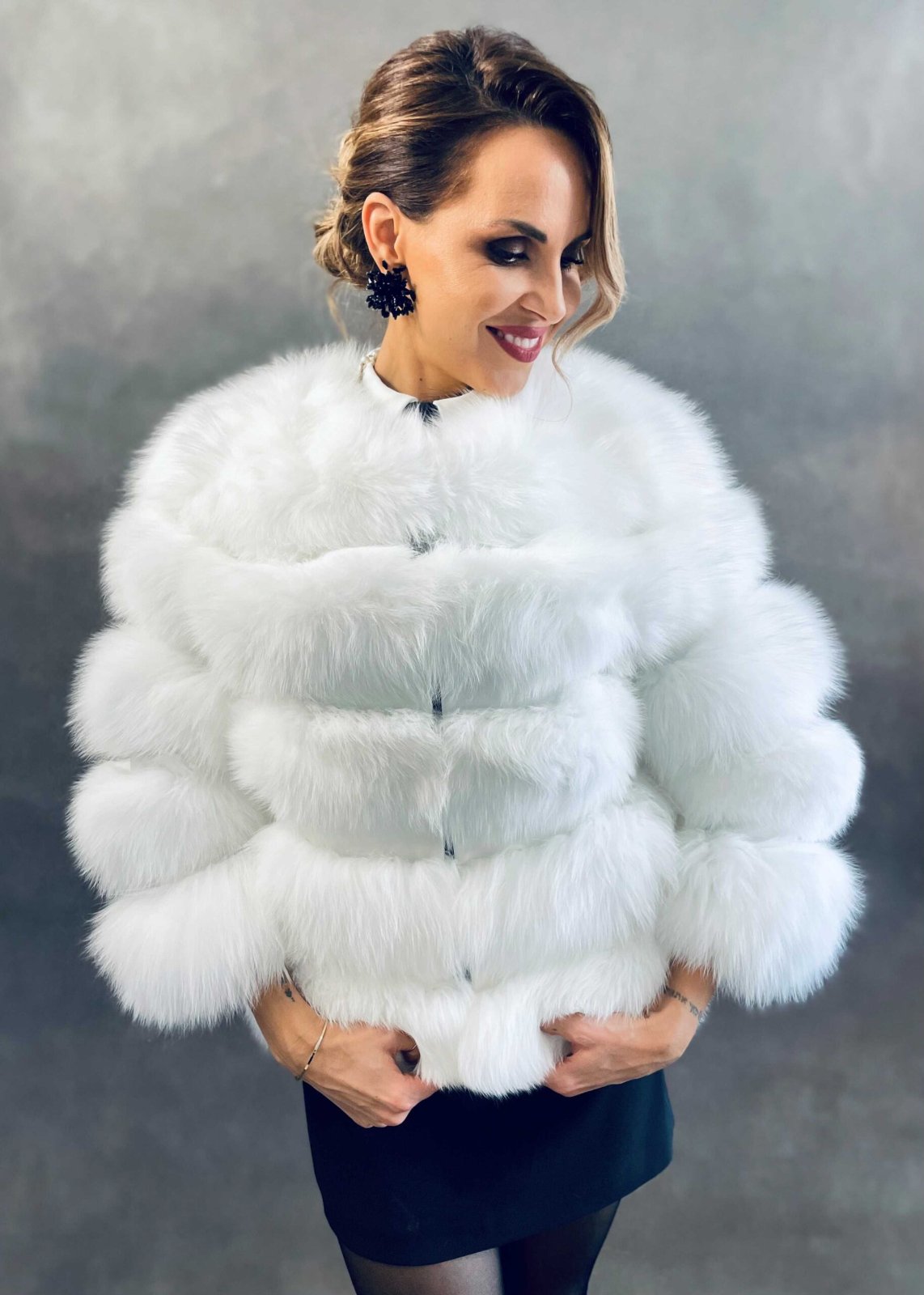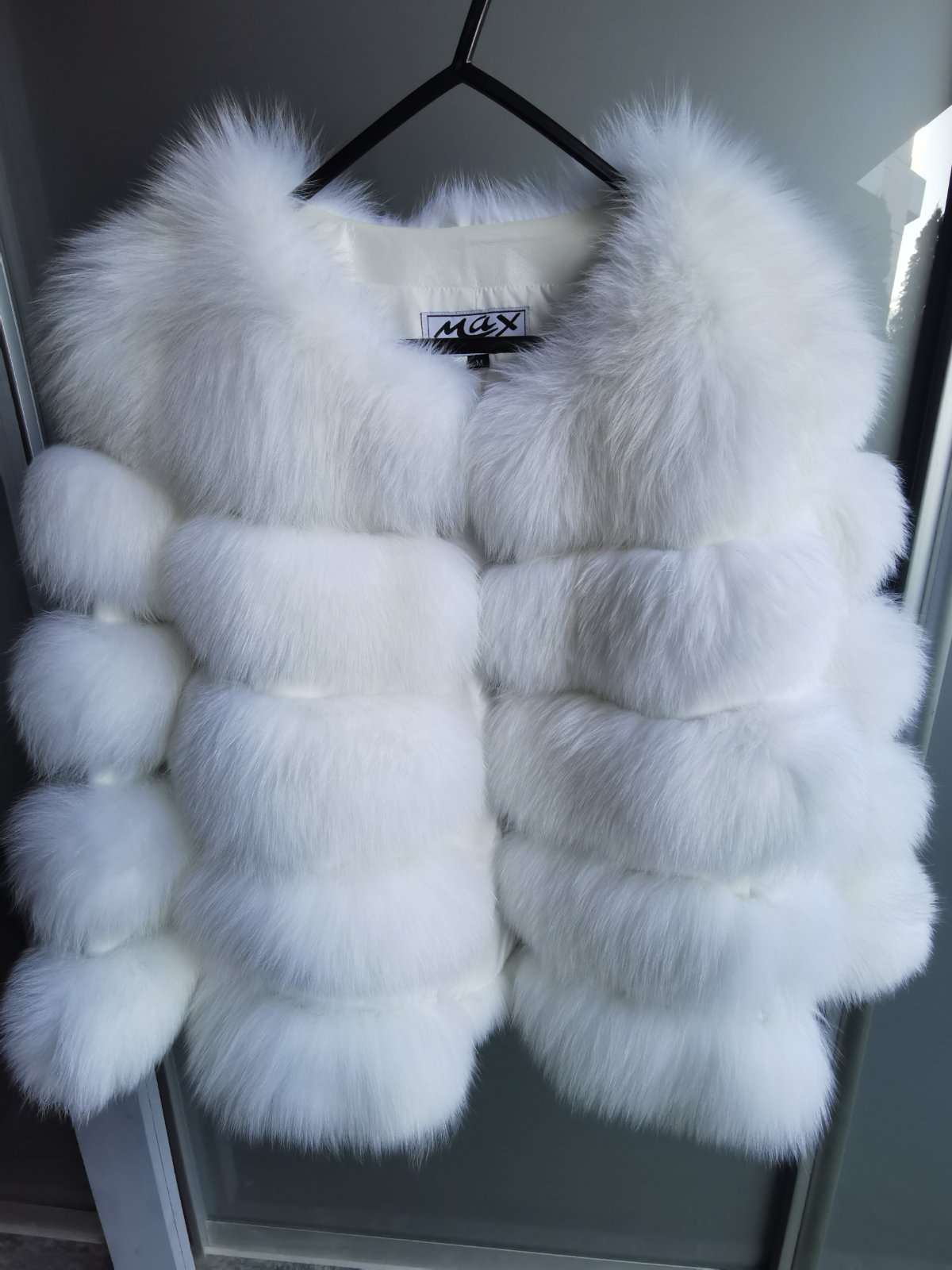 s visackou vyuzity len na 1 fotenie, veľkosť M, kratsi rukav 50cm, znacka Max original leather, zapinanie na háčiky. Cez prsia 50cm, dlzka 57cm. Pôvodná cena 700€, v obchode stoji teraz cez 800€