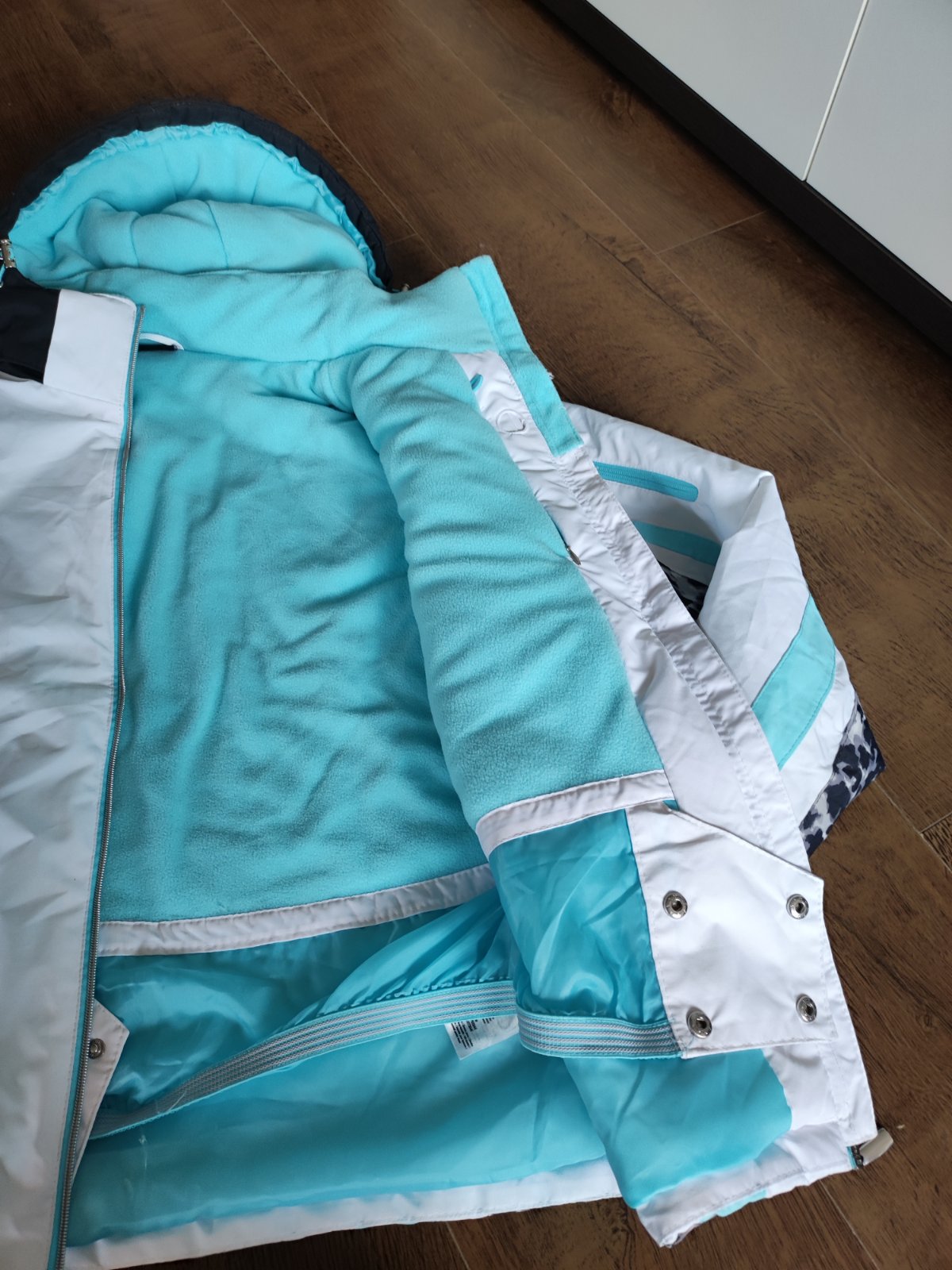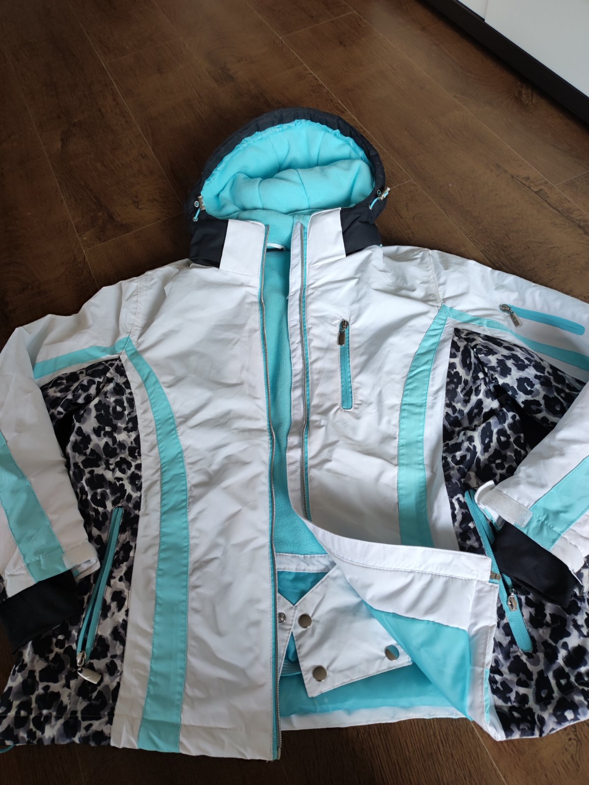 Pekný nosený stav, snežný pás, zábrany na rukávoch proti vzniknutou snehu, vela vreciek, bez dier, iba na svetlej farbe vidno nosenie okolo vreciek, na rukávoch z vnútornej strany poslúži, dlzka 64...