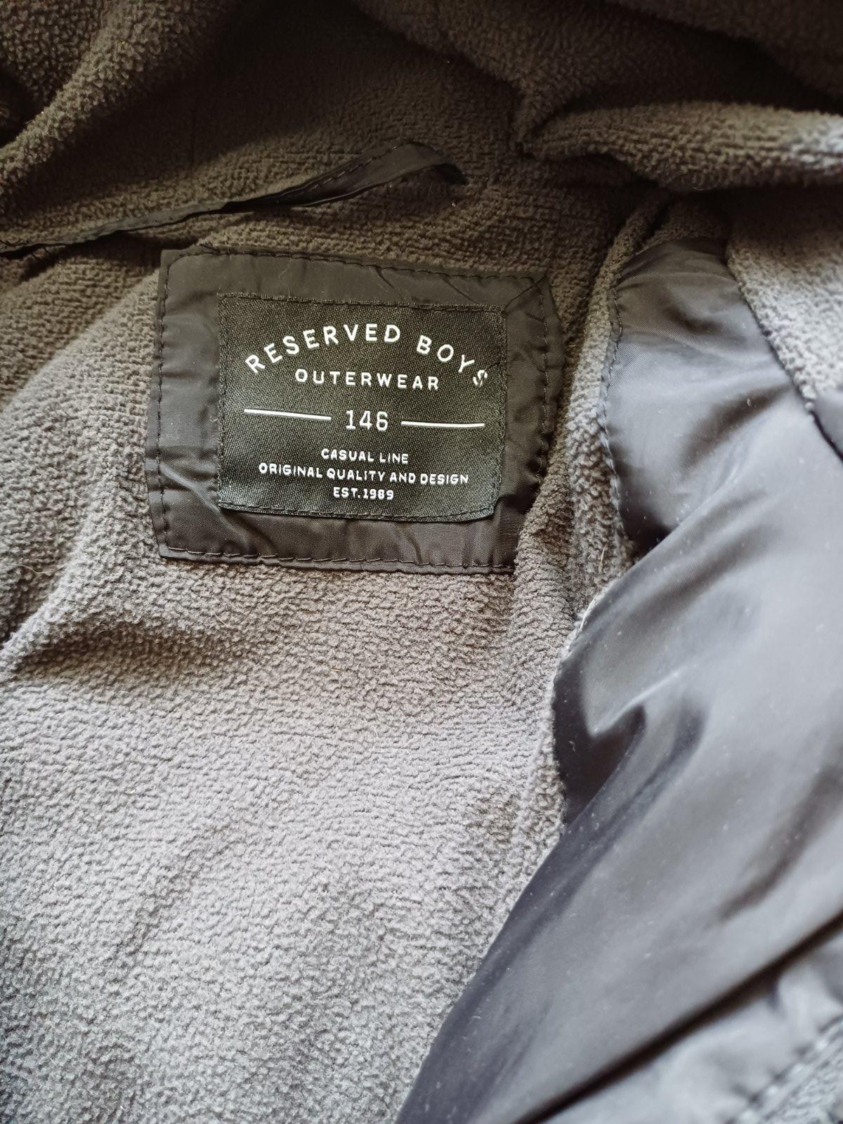 Zimná bunda zn. Reserved, veľ. 146. Čierna, zapínanie na zips + gombíky pukačky, kapucňa, 2 bočné vrecká + 1 náprsné (všetky zapínanie na zips), podšitá fleece-om. Bundička má poškodenie - na rukáve a na chrbte má maličké trhlinky (spolu 3) - detail na foto, zohľadnené v cene. Rozmery: dĺžka od ramena po spodný okraj 60 cm, dĺžka rukáva 53 cm, šírka cez hrudník 47 cm.