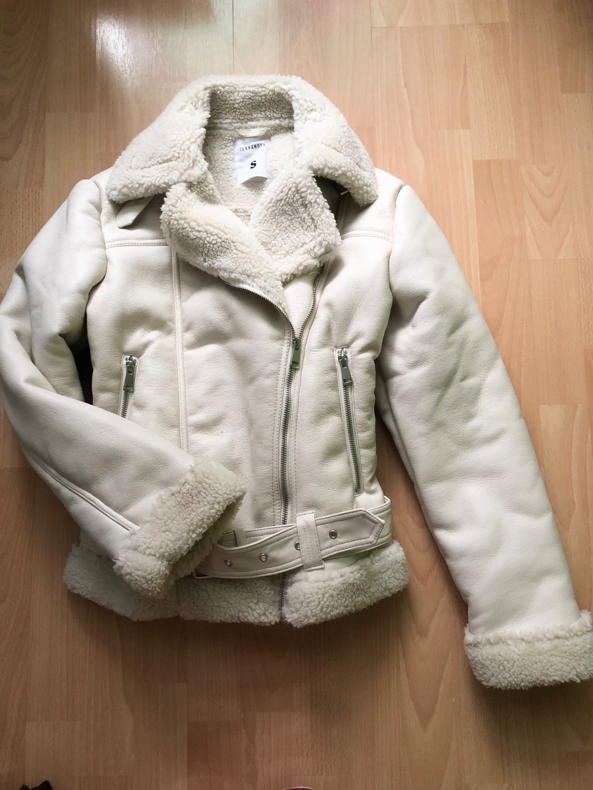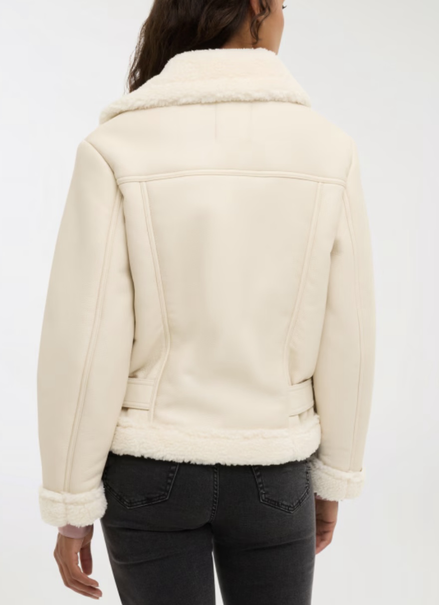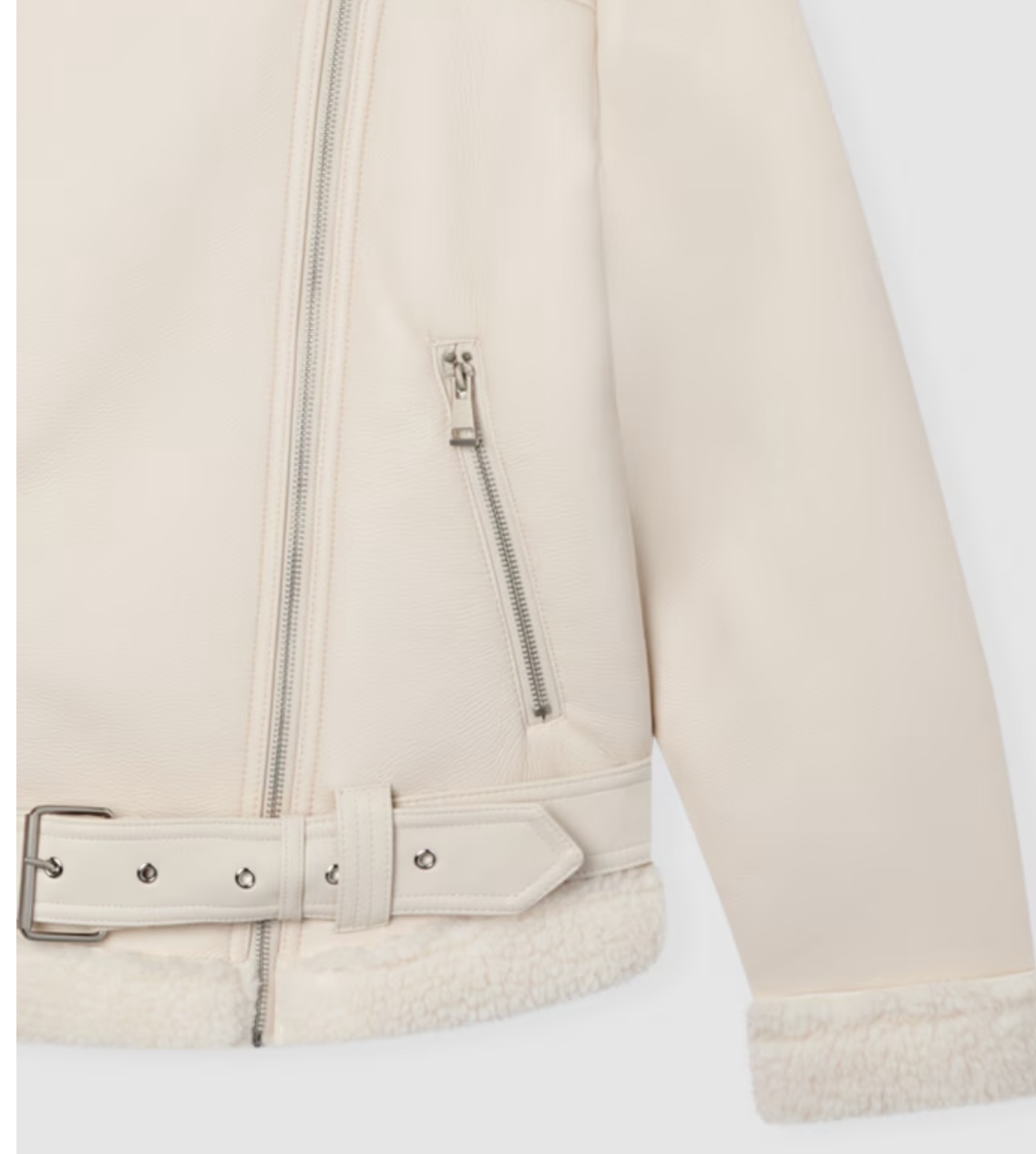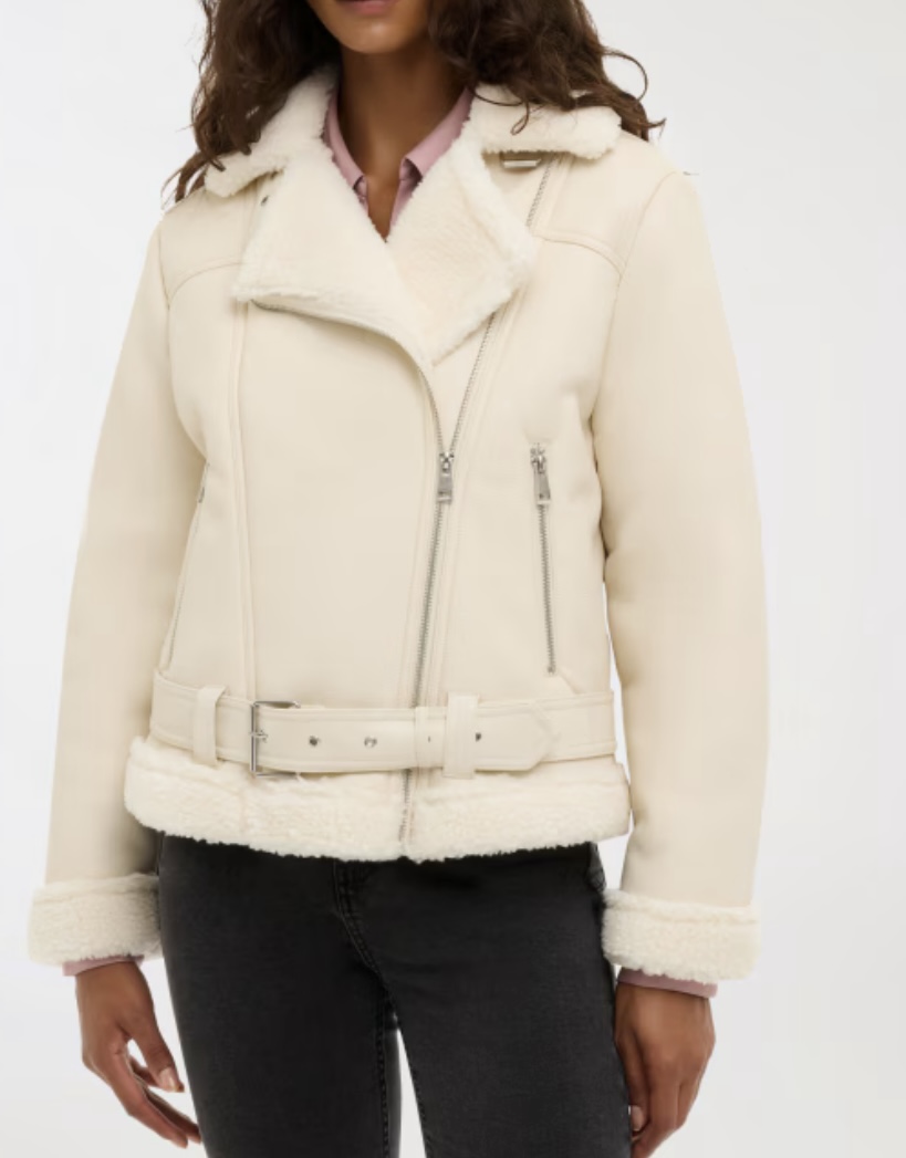 Dámska bunda z umelého ovčieho rúna, ideálna pre mestský a moderný vzhľad. Perfektná na chladné dni, táto bunda sa vyznačuje bikerským štýlom s detailmi na zips a nastaviteľným pásom. Regular fit ju robí pohodlnou a všestrannou, vhodnou na kombinovanie s džínsami alebo voľnými nohavicami. Kúsok, ktorý spája praktickosť a štýl pre trendy outfit.