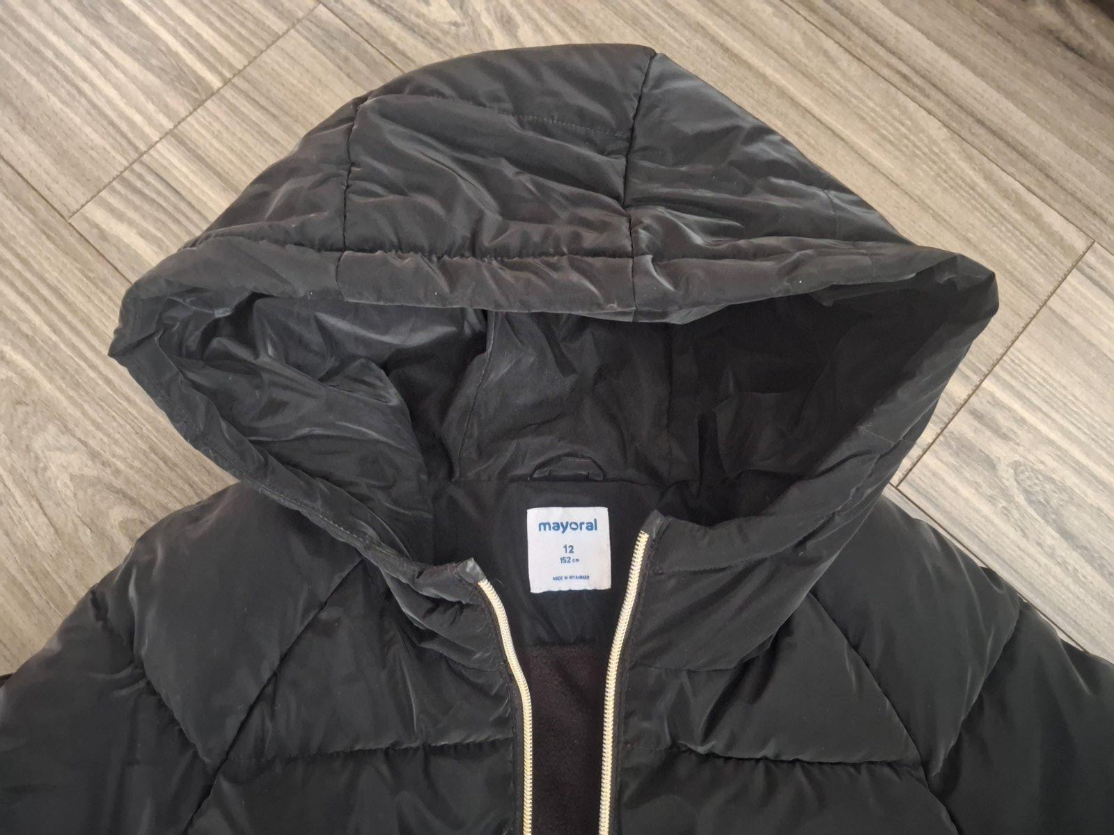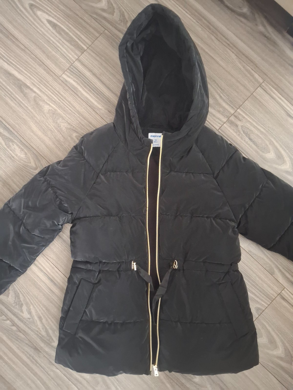Parádna čierna zimná bunda Mayoral, z akoby pogumovaného materiálu, veľmi príjemný na dotyk. Podšitá teplým flaušom. V páse sa dá stiahnuť. Zlatý kovový zips, dve vrecká a kapucňa.