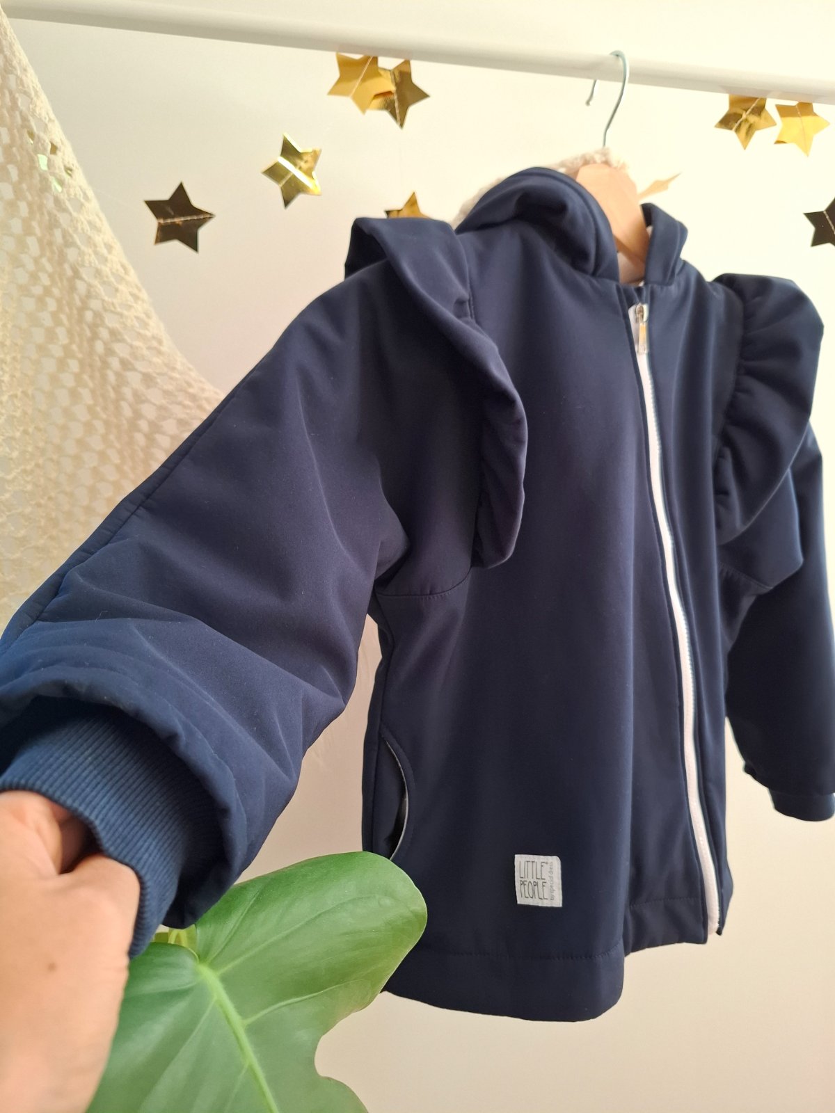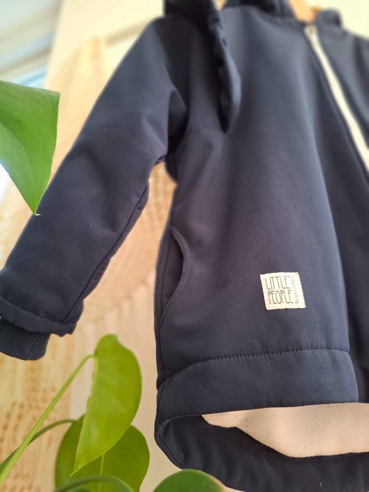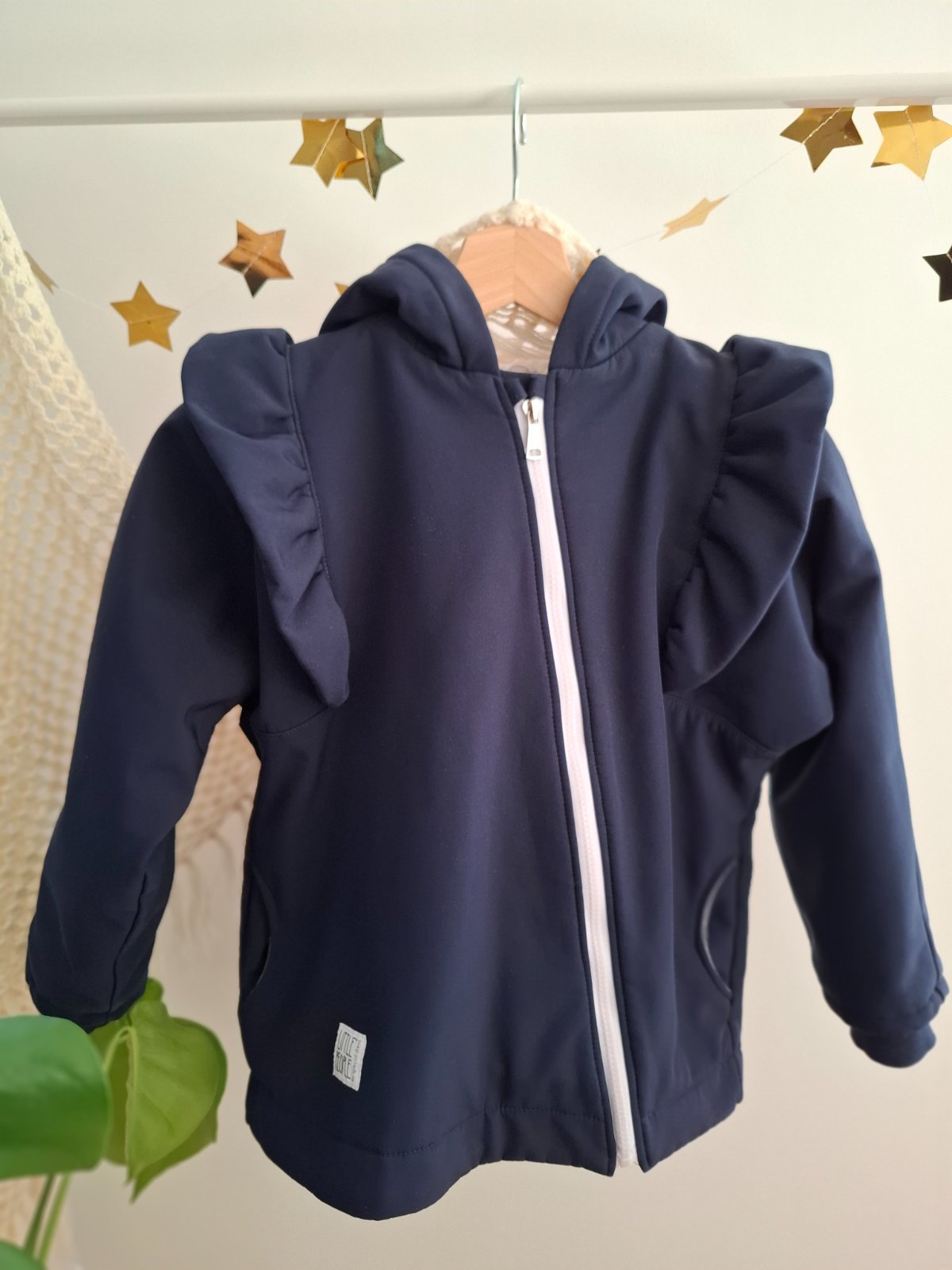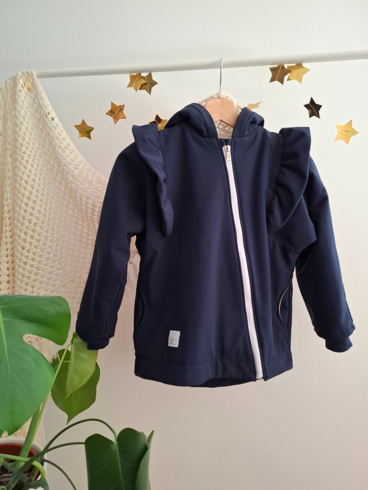 Asymetrický zips, volány na rukávoch, pevná kapucňa