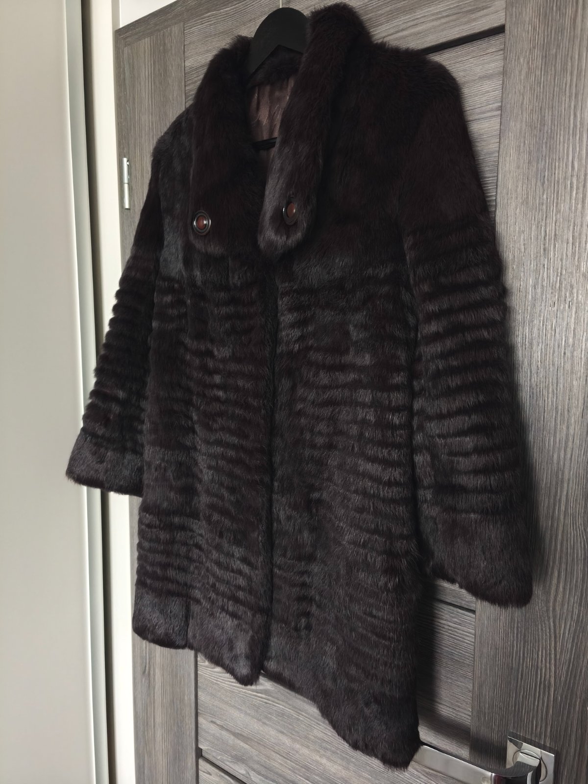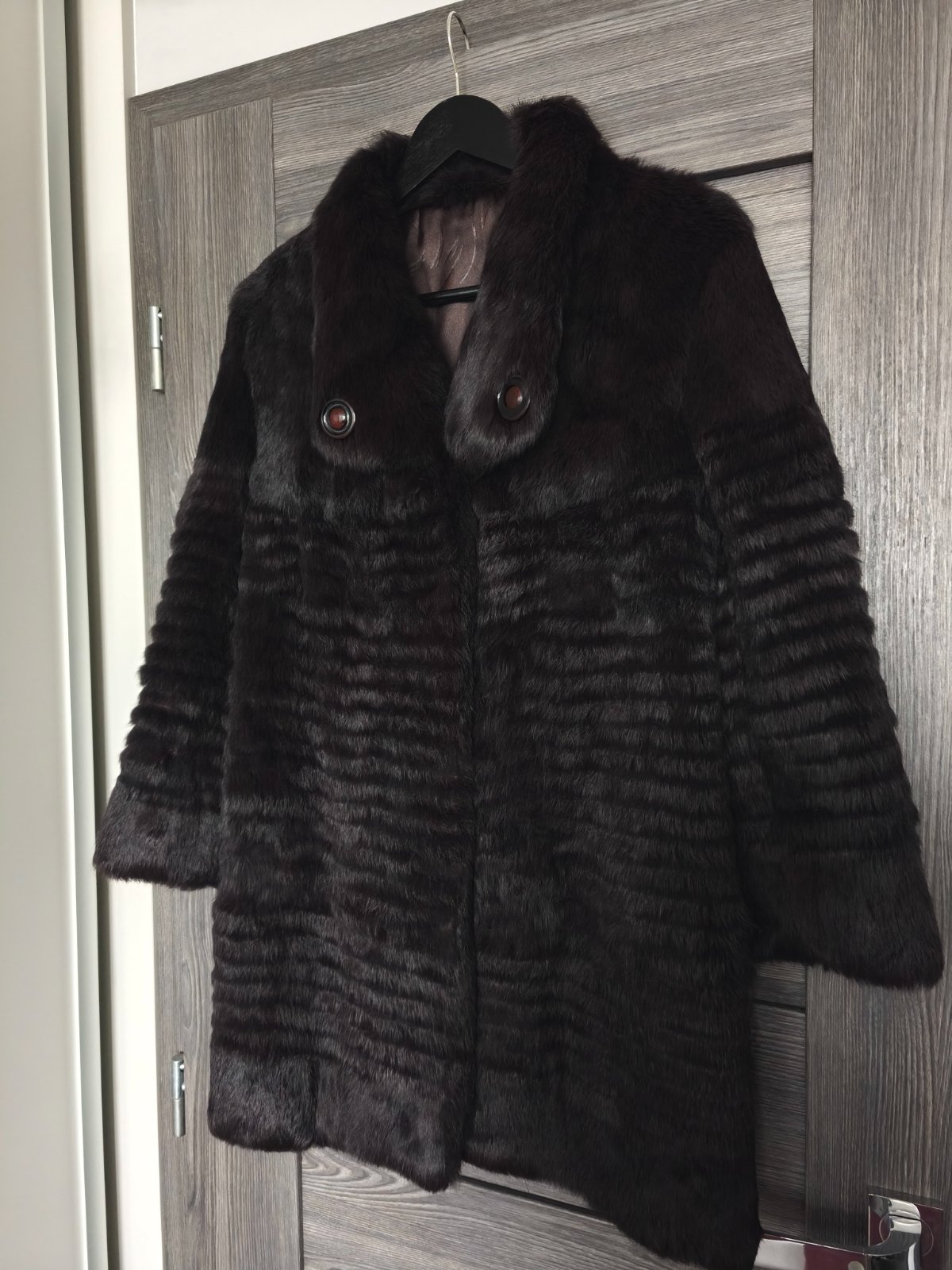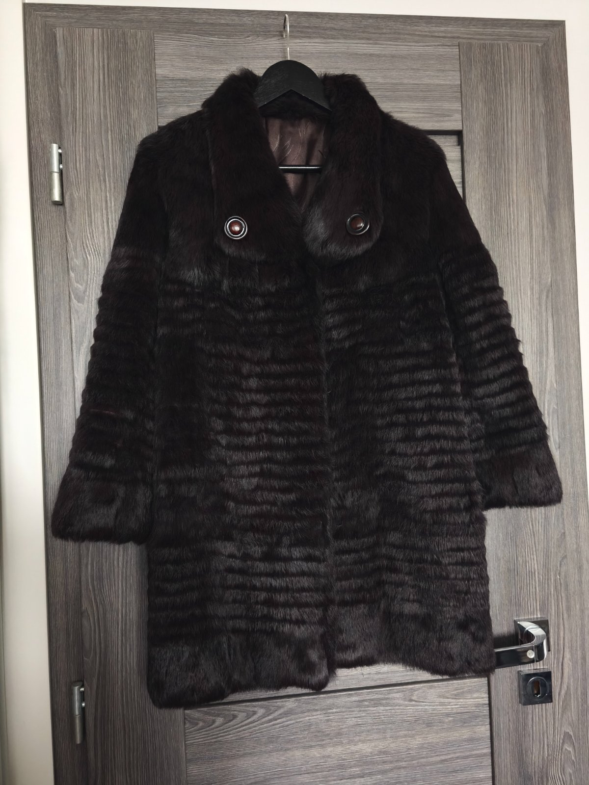 Nadherny vysokokvalitny luxusny kozuch z premiovej kvalitnej kozusiny z norky sity precizne v tenkych pasoch, jemnucky na dotyk, farba nadherna dymovohneda saphir/iris nazivo omnoho krajsia ako na fotke. Zapina sa na zacvakavacie haciky. Krasne sedi od XS po S velkost. Obleceny bol doslova 2x na prilezitost tak stav je uplne ako novy. Povodna cena bola 1500€.