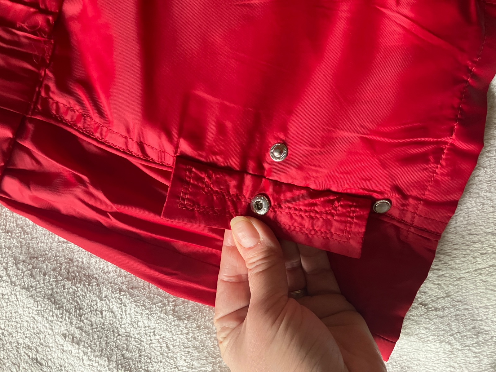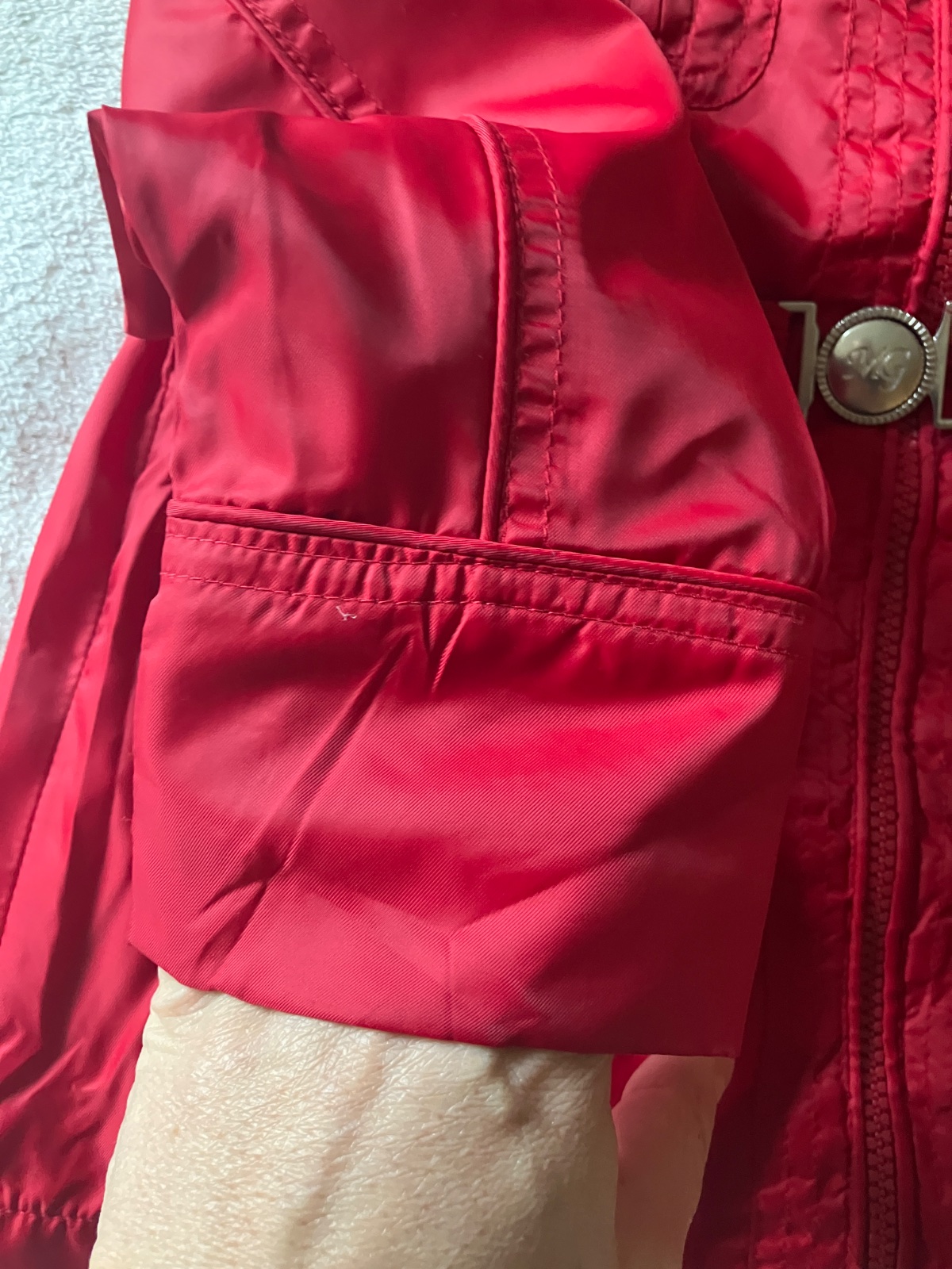 Lahka prechodna bunda s upletovou podsivkou zn. Mayoral. Velkost 134, rozmery na foto. Rukav sity tak, aby sa dal zahnut, vdaka tomu je nositelna dlhsie. V pase opasok, pekne ukaze na postave. Vrecka s cvockom su falosne. Farba syta cervena. Zips funkcny. Nosena prilezitostne, bez poskodeni.