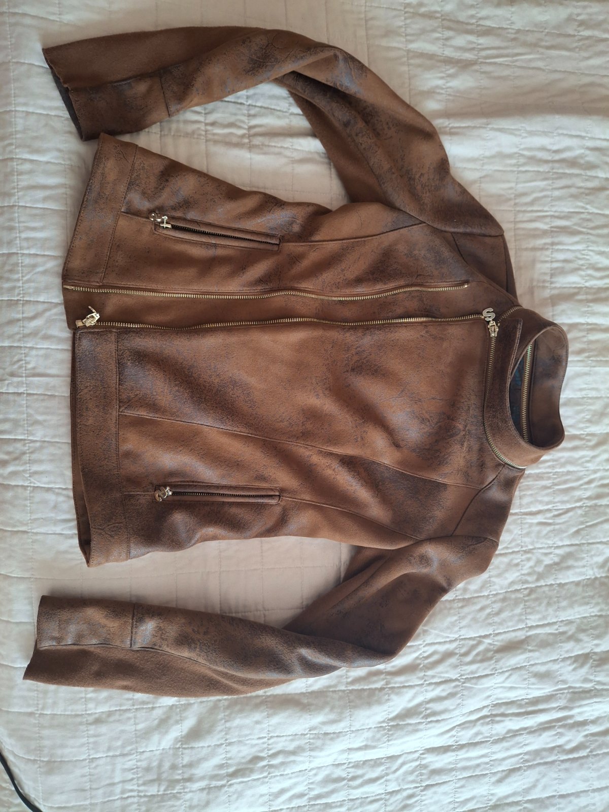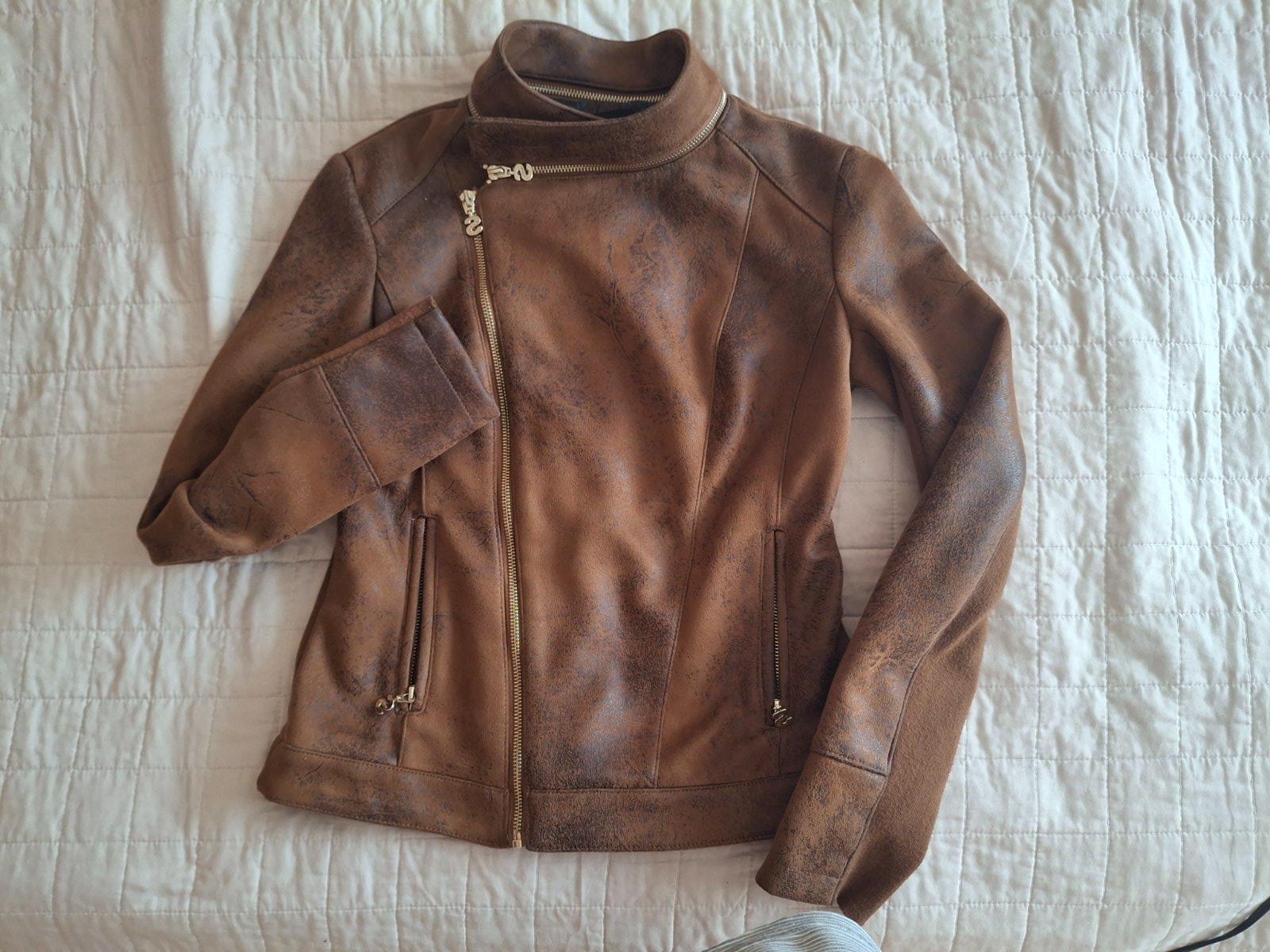 Štýlová bunda do pásu na vyššiu a štíhlejŝiu postavu ( ja mám 176 cm). Veľmi príjemný materiál podobný brúsenej koži, bunda má pekné detaily. Málo nosená, vhodná k dlhej sukni alebo jeansom. Možnosť vyskúšania v Petržalke alebo Ružinove ( BA) .