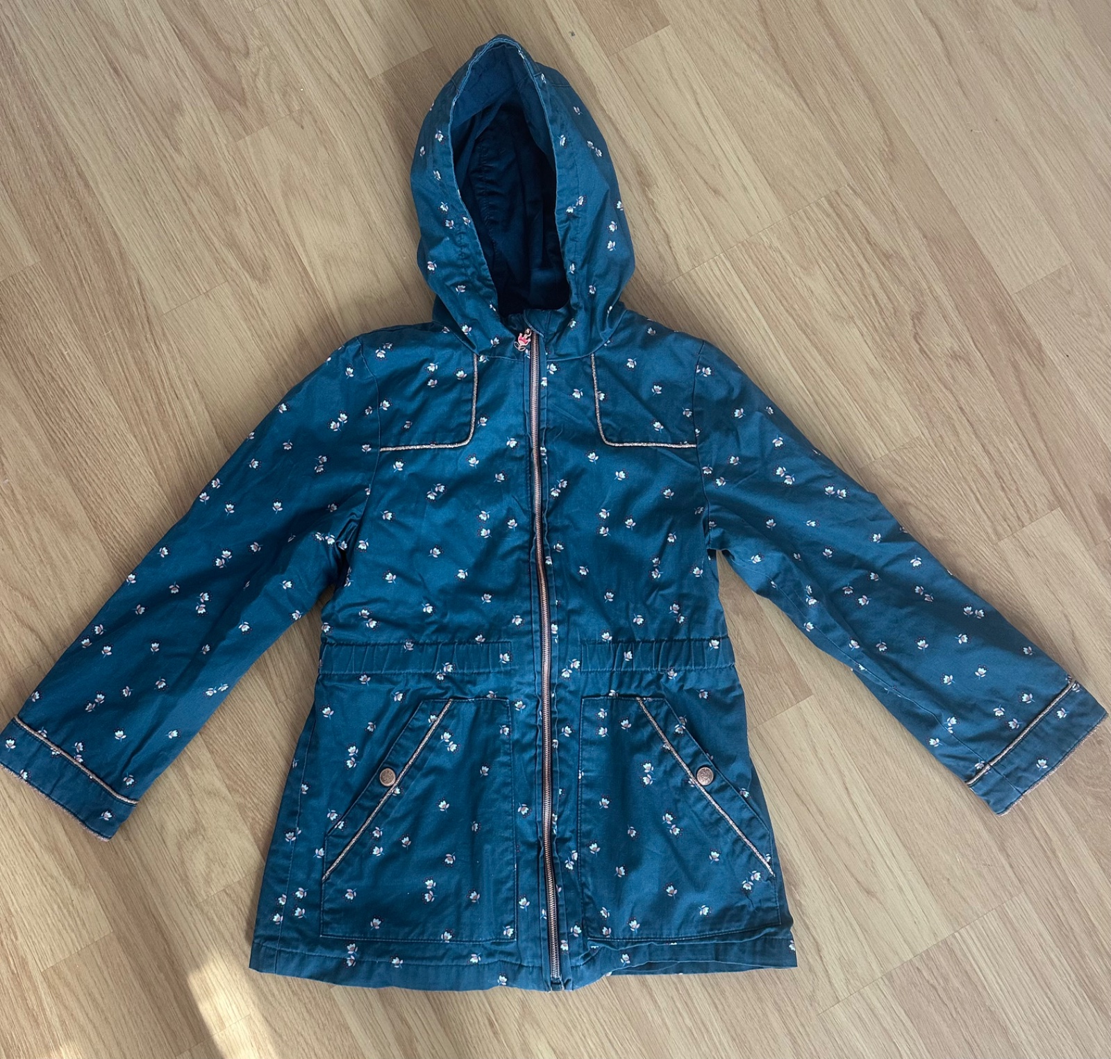 Krásna prechodná bunda, top stav , na zips, s neodnimatelnou kapucnou, velkost pisana 128, ale mensia. Sirka pod pazuskami 35 cm, celkova dlzka 47 cm a dlzka rukava od krku 46,5 cm.
