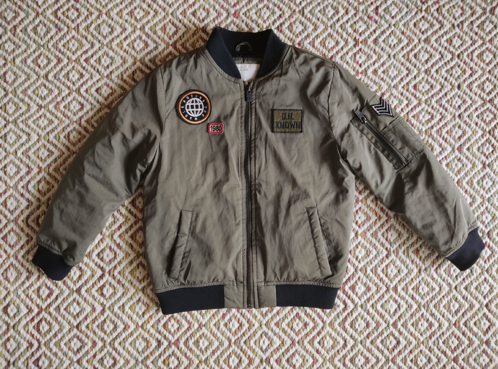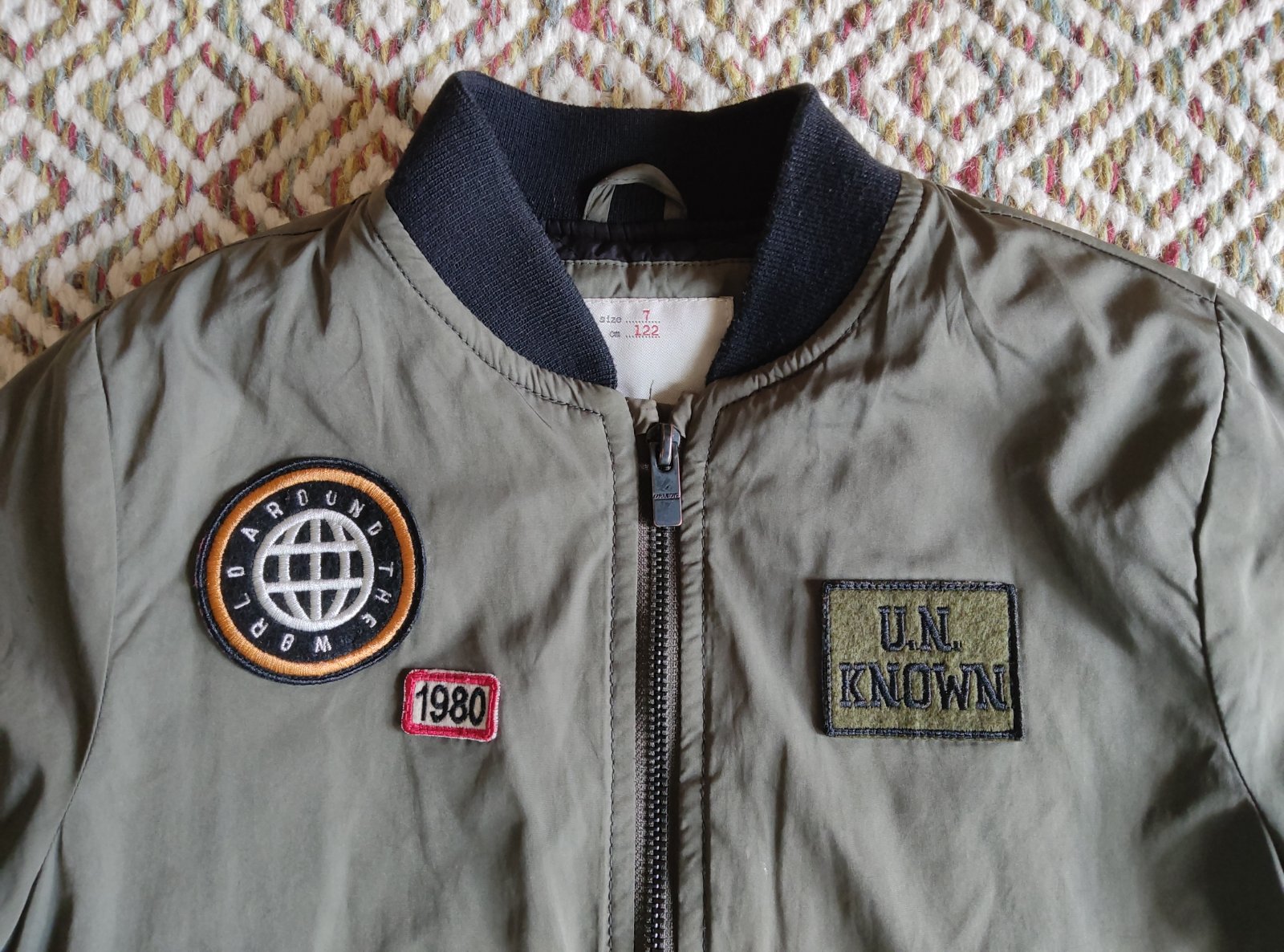 Nosená bomberka, stav nafotený: žmolky na patentoch, šuchnuta na jednom rukáve (nie je tam diera iba ošuchané). Farba vojenská zelená Dlzka od ramena: 47cm Sirka pod pazuchami: 40cm Rukav od ramena...