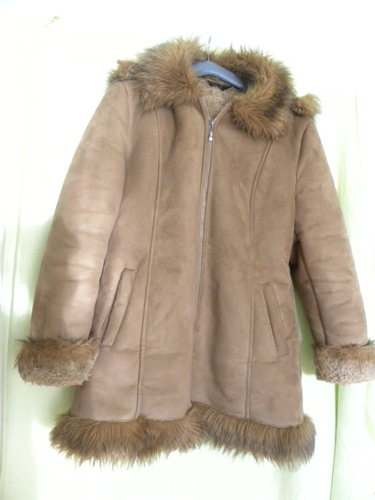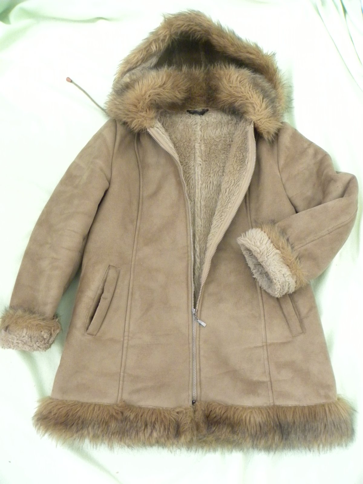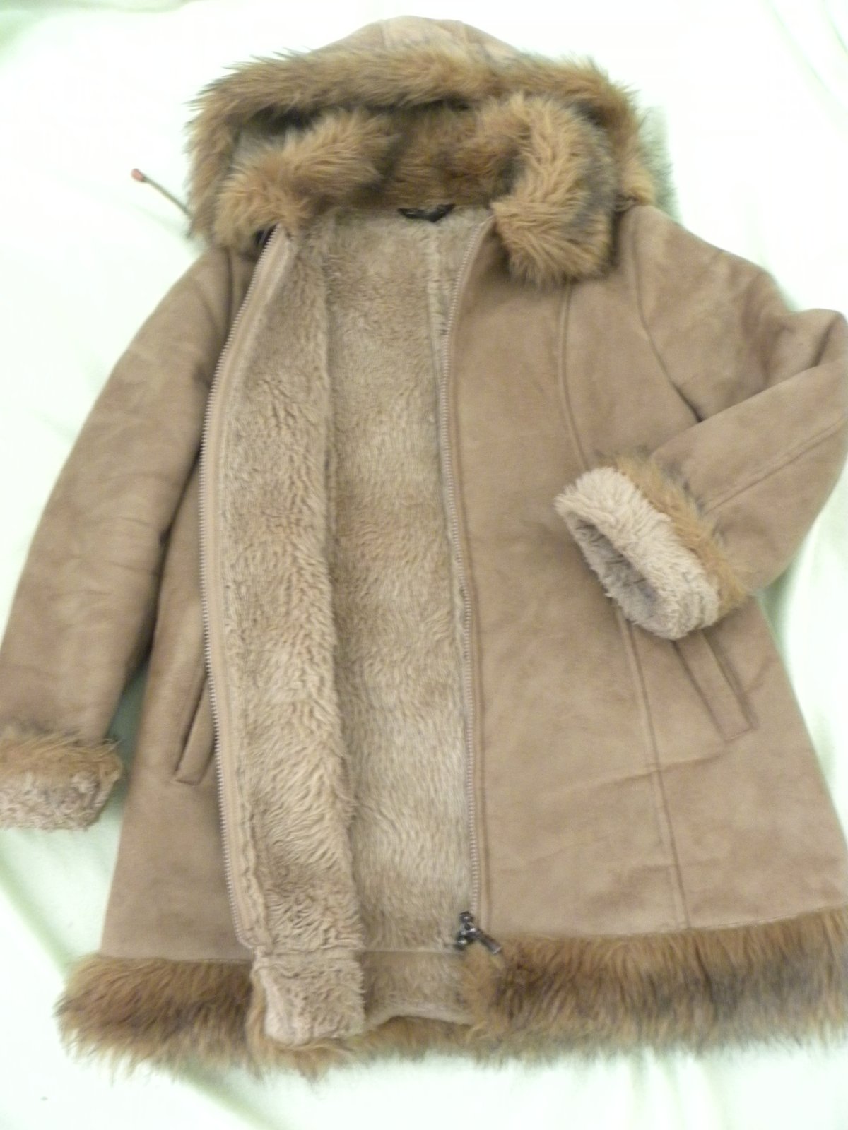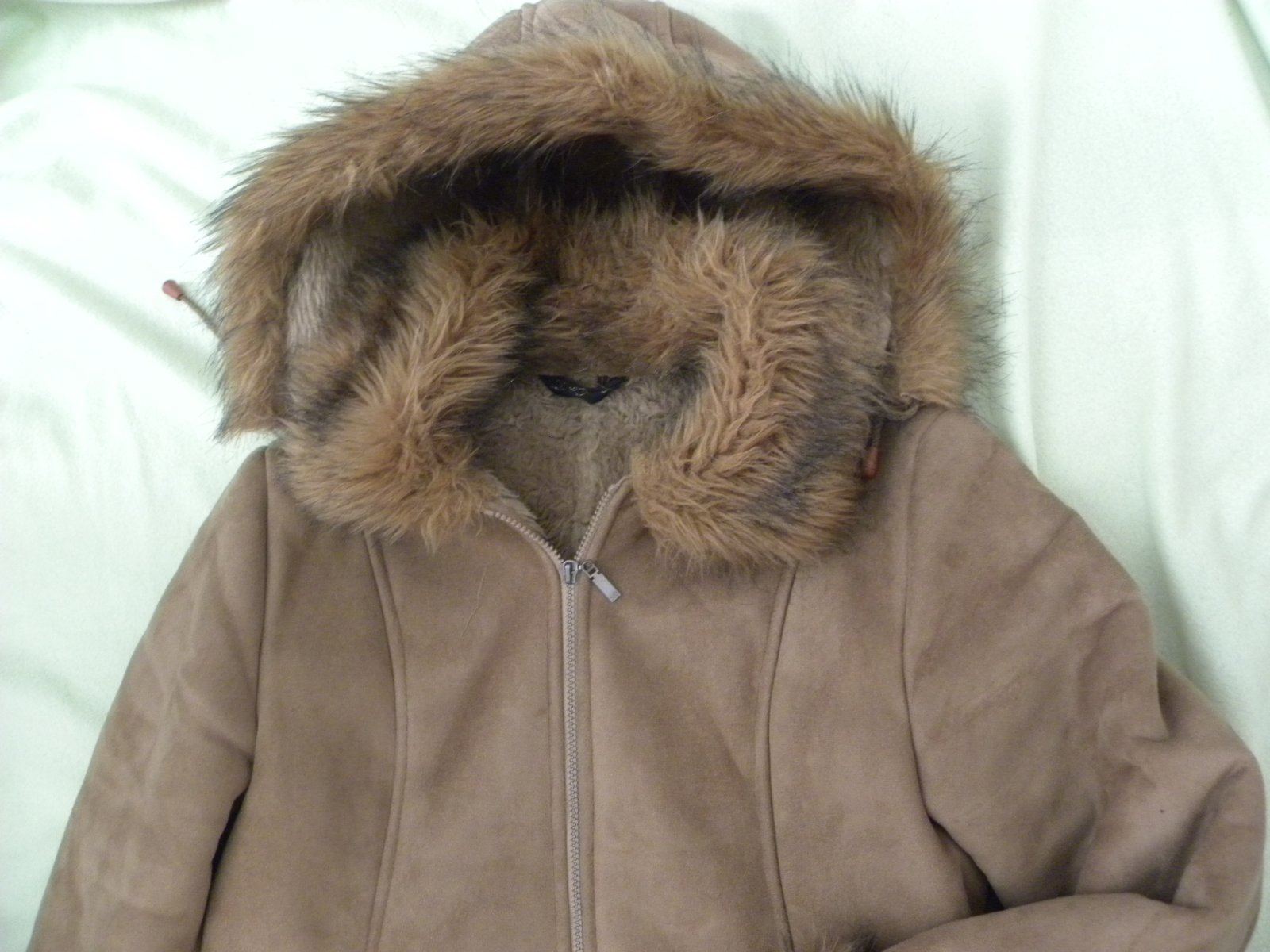 Teplá bunda, elegantná, s kapucňou, zapínanie na gombiky, 2 vrecká.Dlžka 95 cm, šírka pri ramene 48 cm, pod pazuchou 62 cm, dlźka rukavy 64,5 cm.