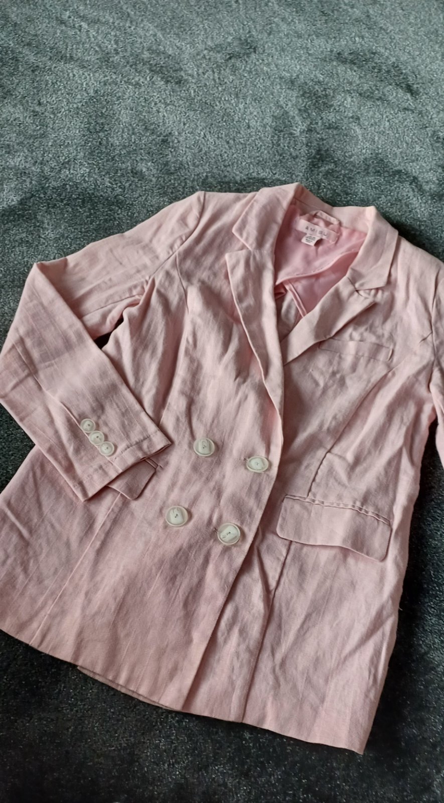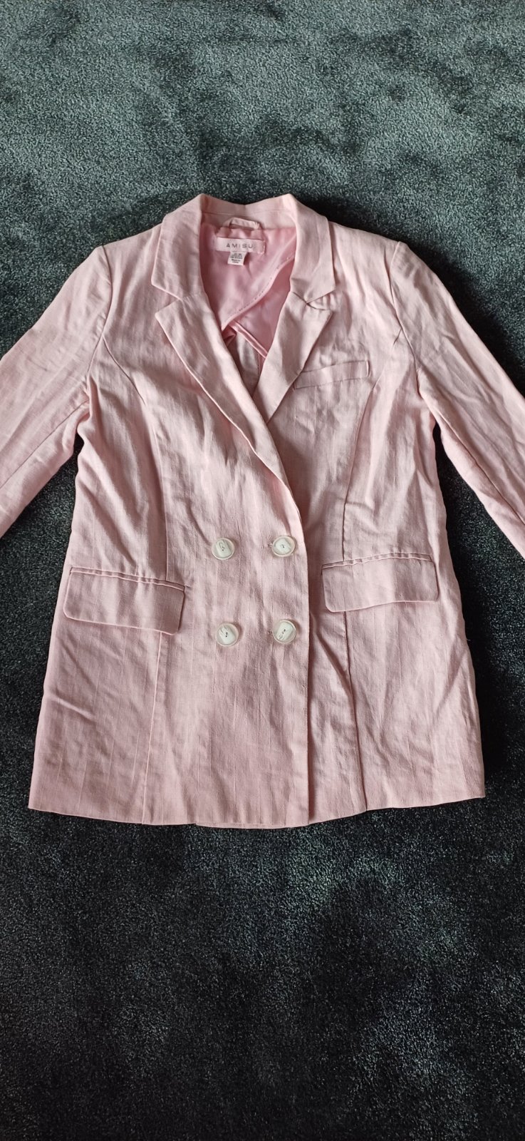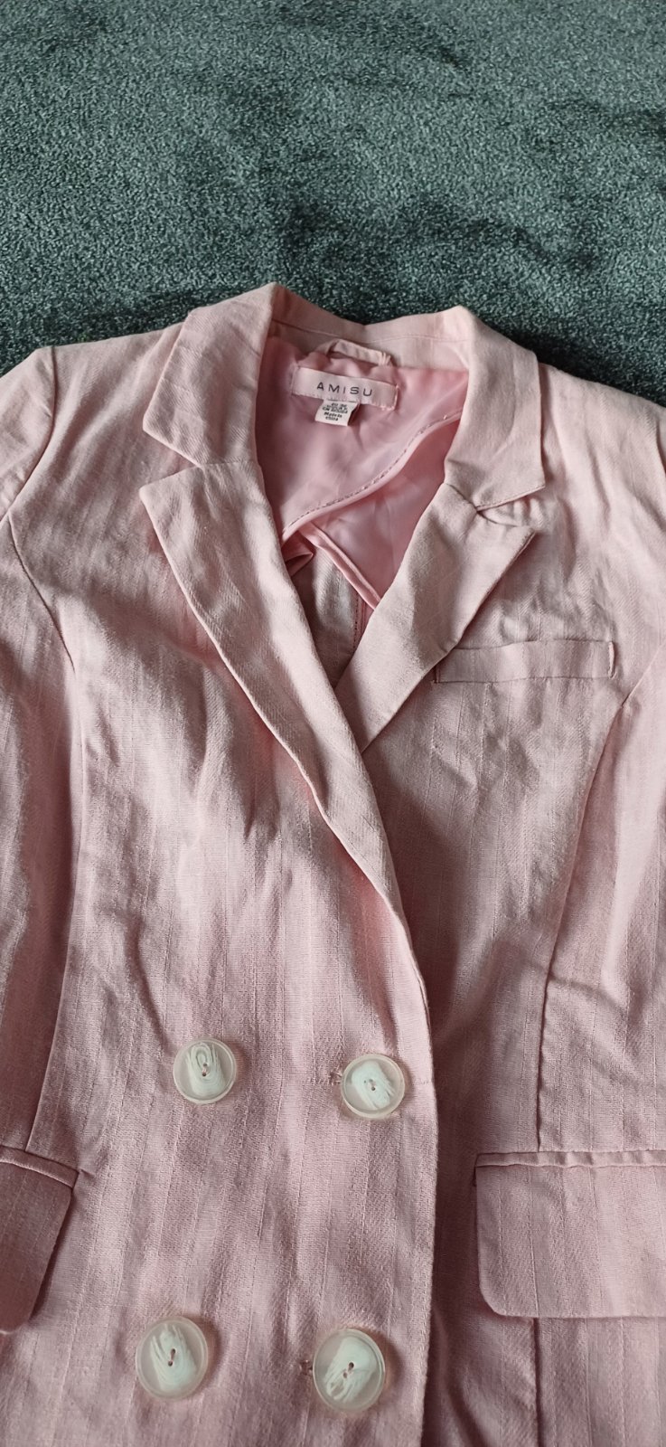 Pudrovoruzovy plášť, veľkosť 36. Značka Amisu. Dĺžka je 75 cm, dĺžka rukáva je 62 cm, cez prsia 90 cm, pás 82 cm, boky 92 cm. Plášť je nepoškodený, bez podšívky. Zapínanie na gombíky a opasok. Zap...