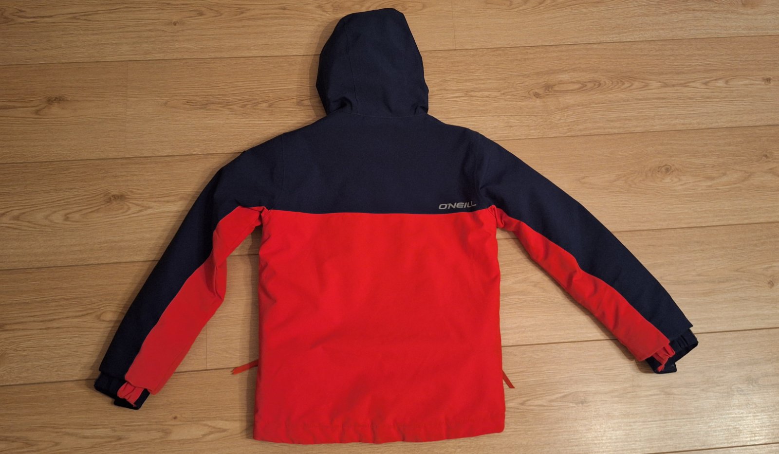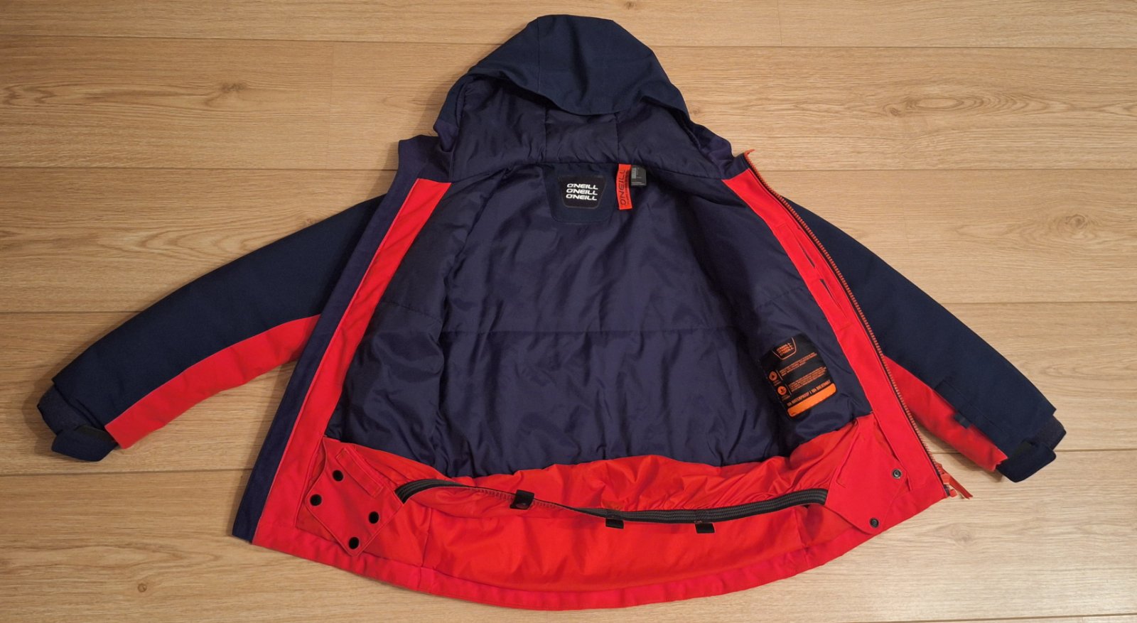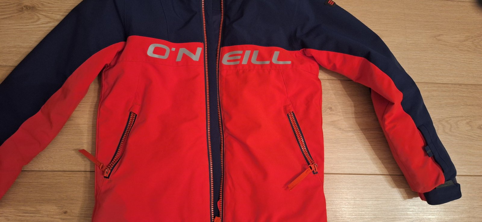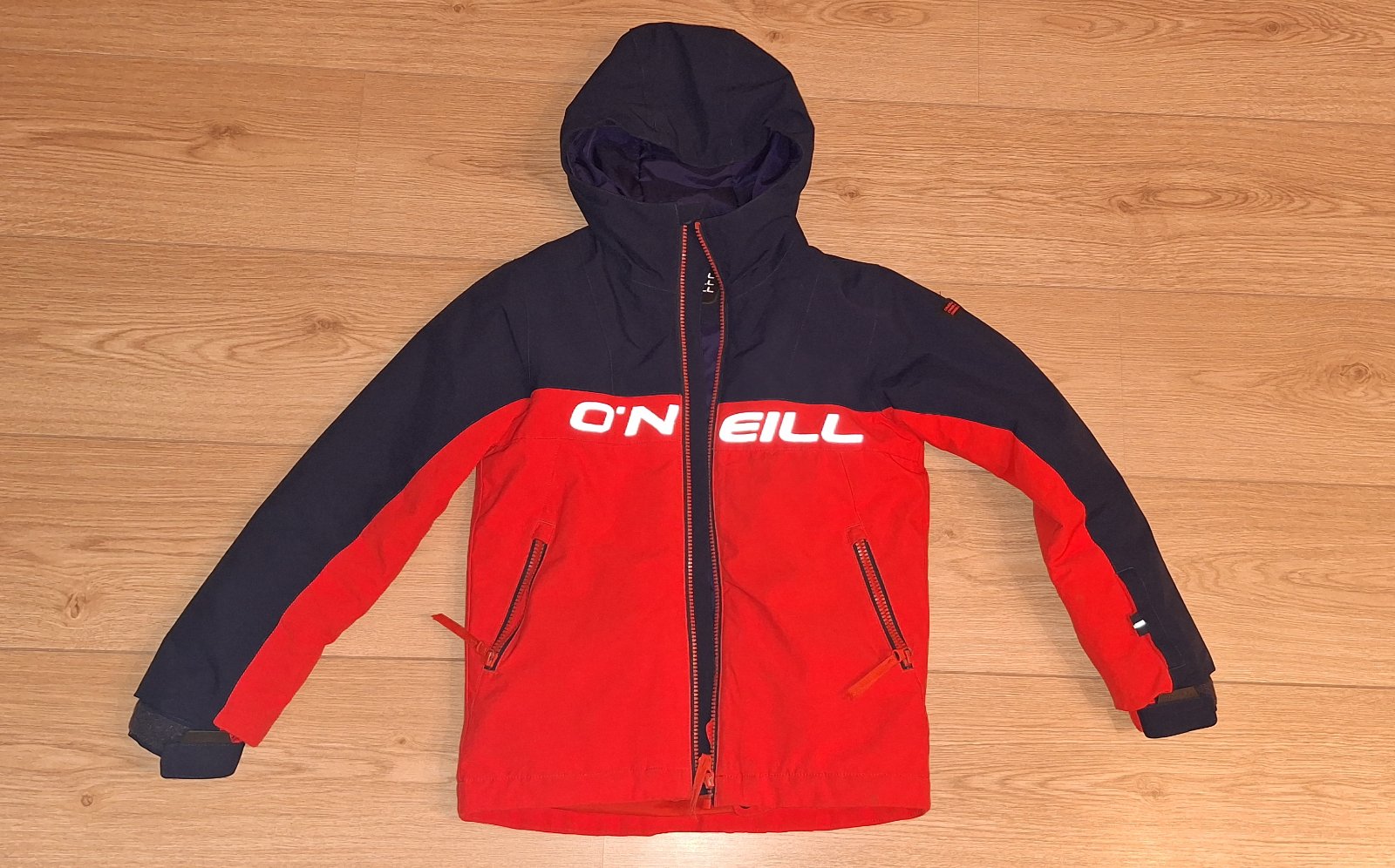 Tmavomodrá a krásna výrazná červená farba, nedá sa presne odfotiť. Nápis je reflexný. Bunda má aj vrecko na rukáve a aj vnútorné vrecko, rukávy sa dajú predĺžiť