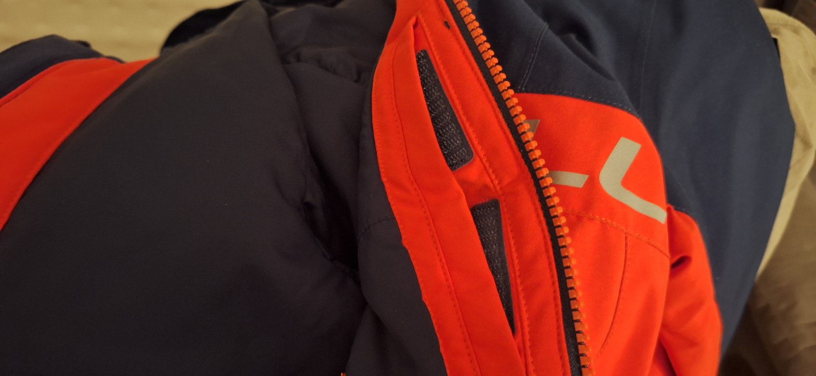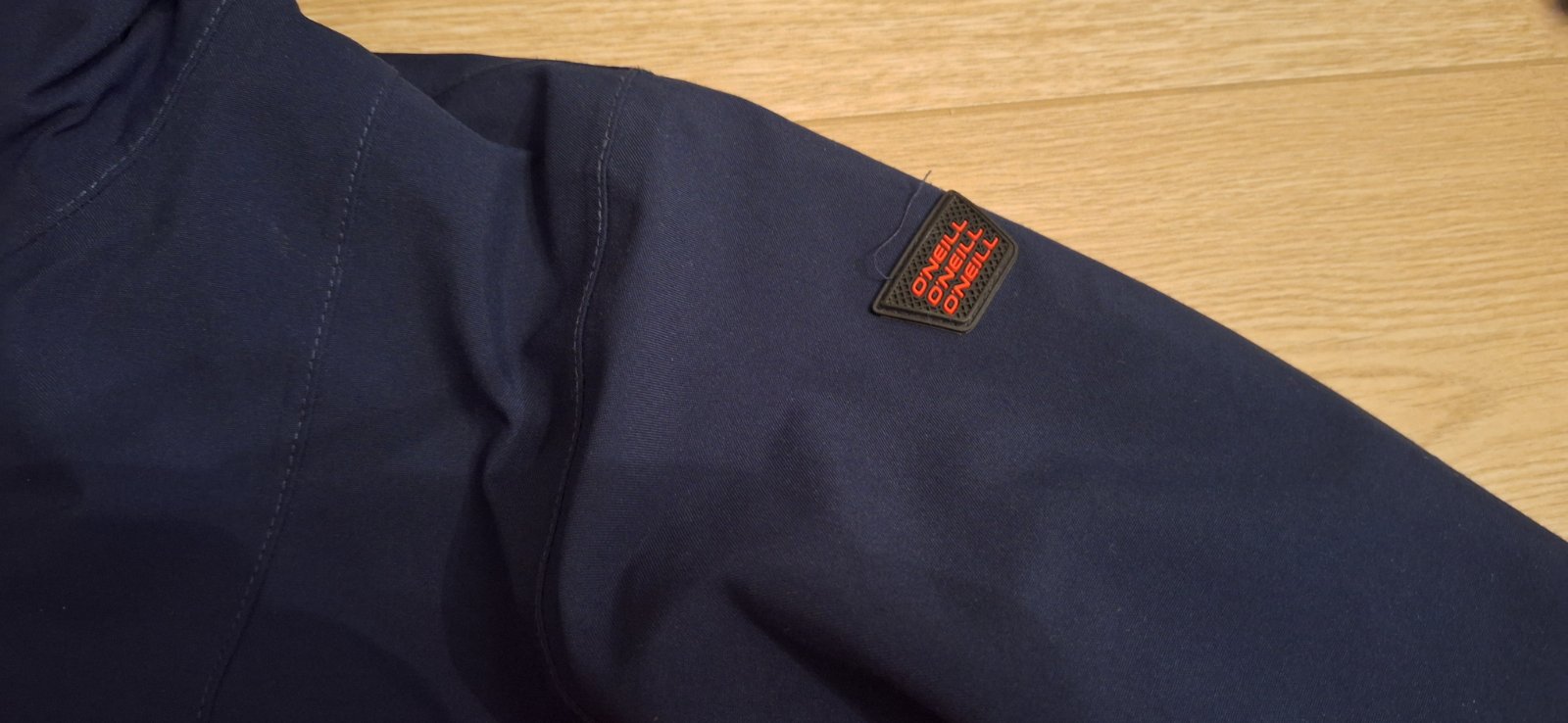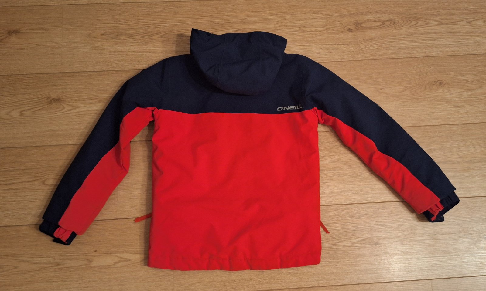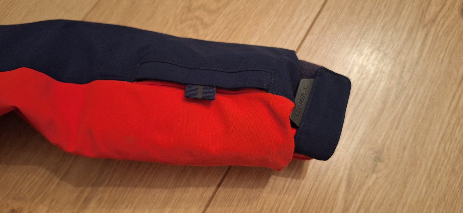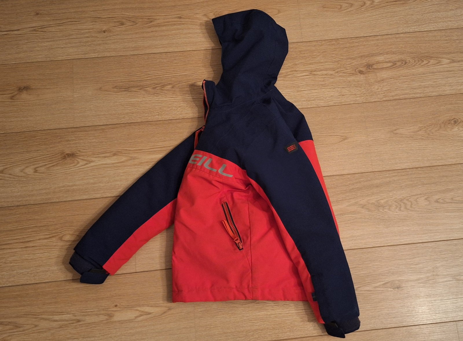 Tmavomodrá a krásna výrazná červená farba, nedá sa presne odfotiť. Nápis je reflexný. Bunda má aj vrecko na rukáve a aj vnútorné vrecko, rukávy sa dajú predĺžiť
