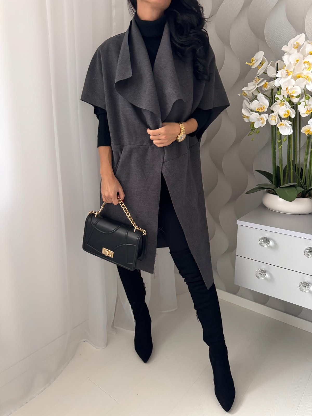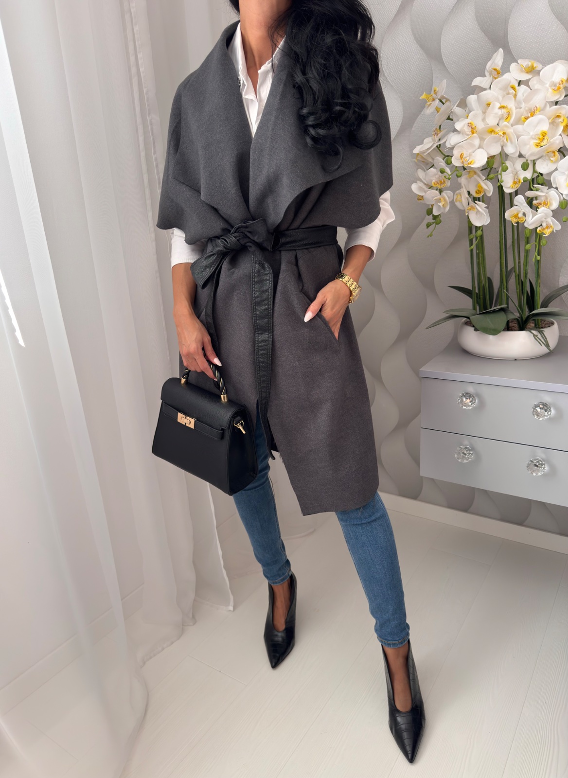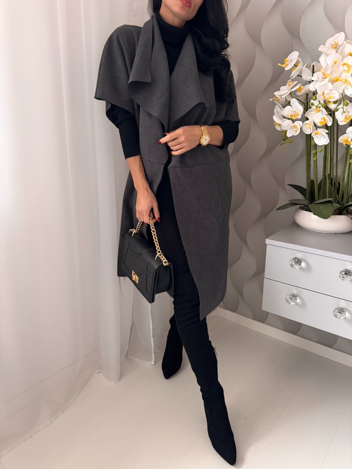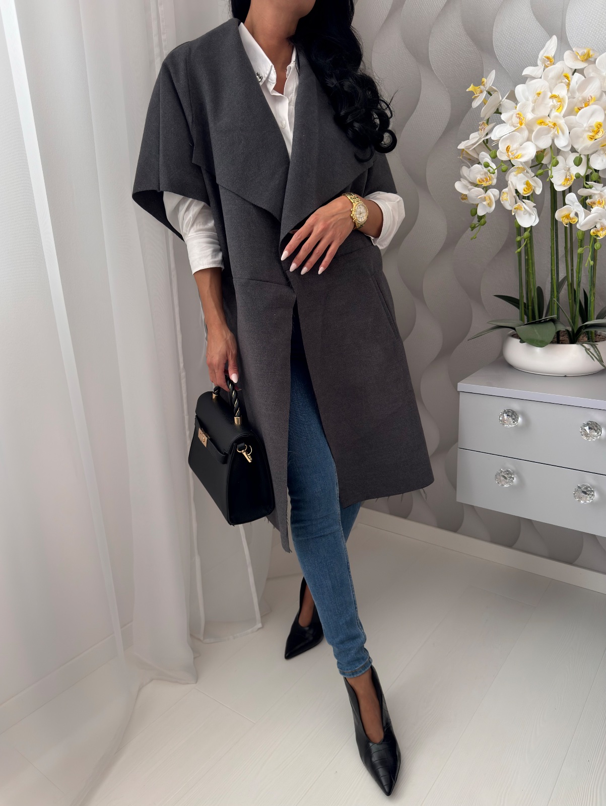 Prechodná predĺžená vesta s podielom vlny.