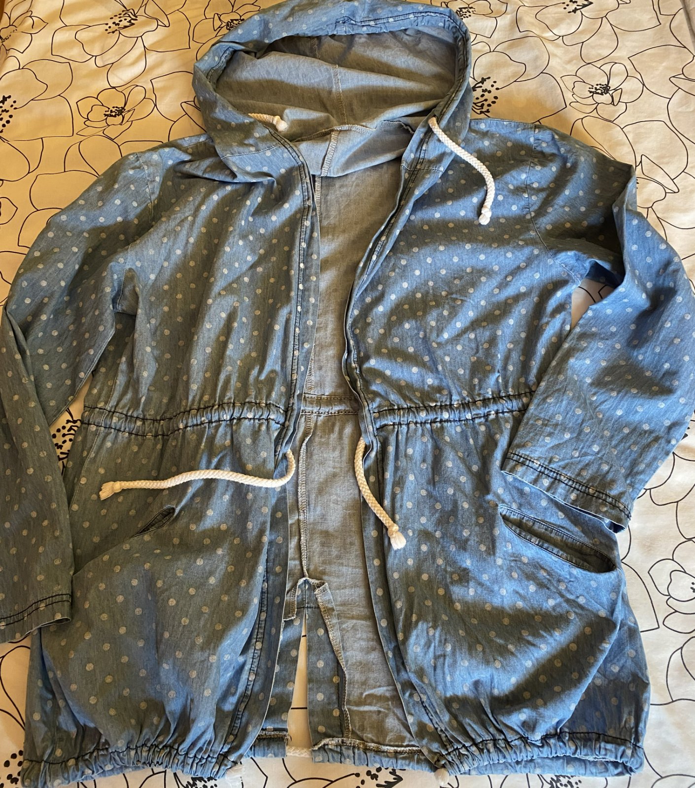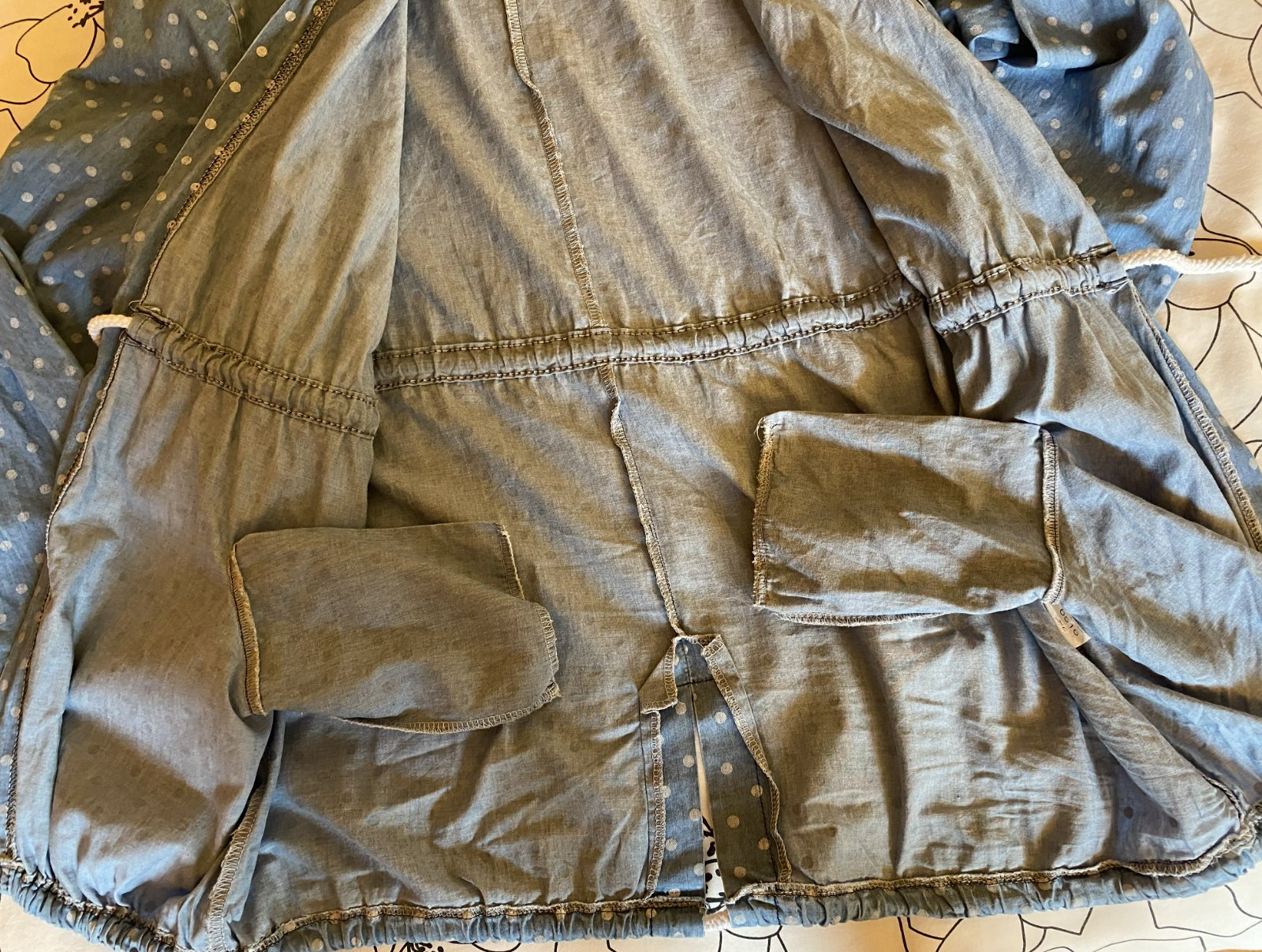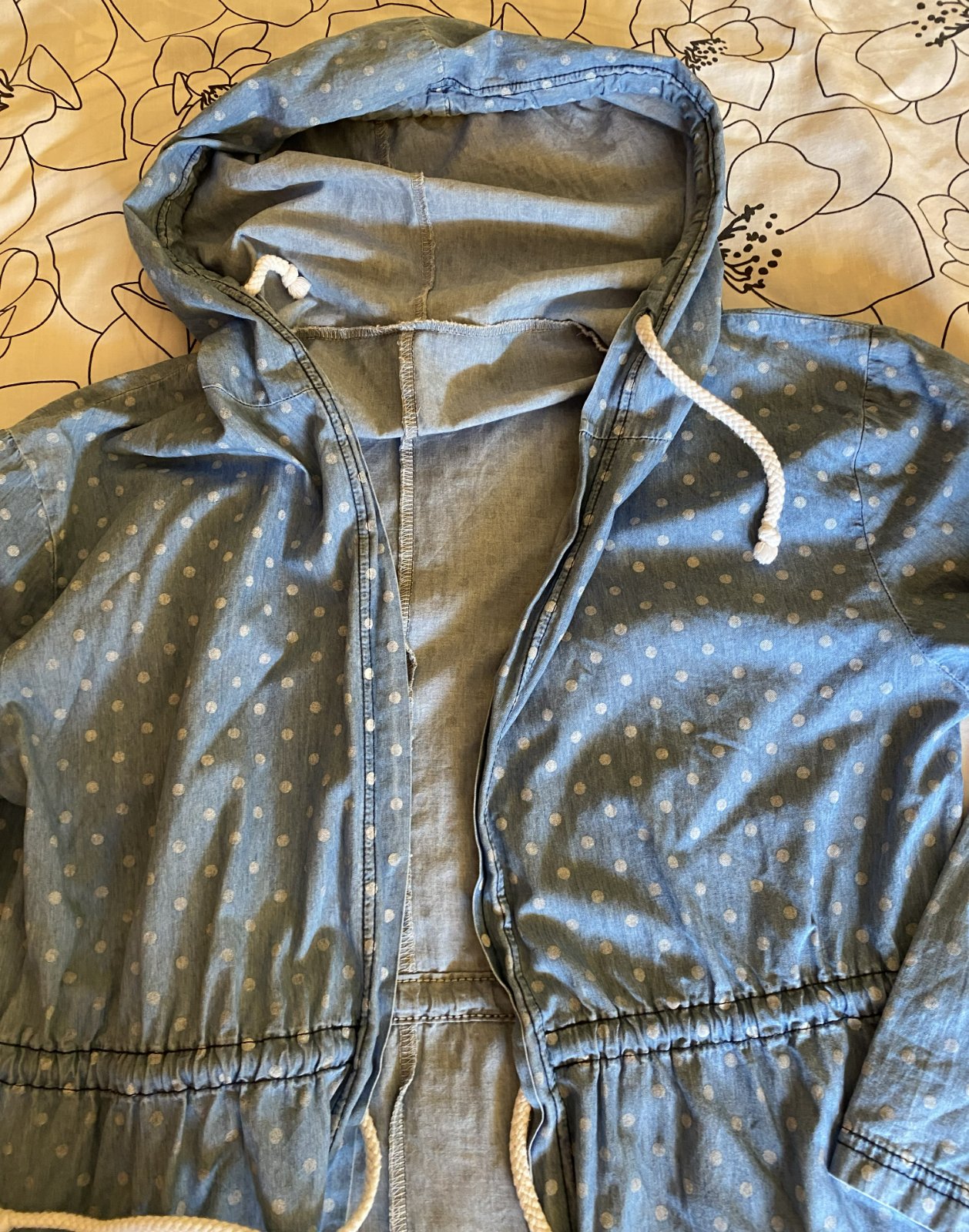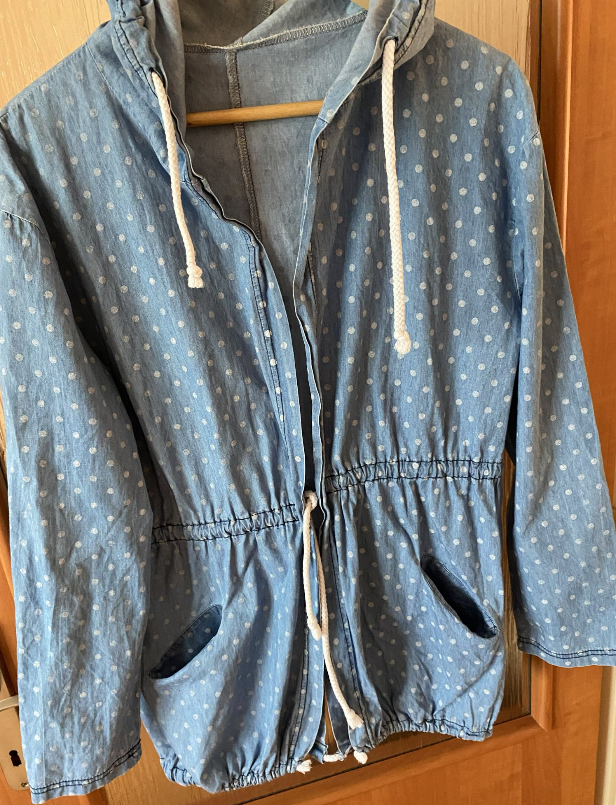 Guličková bunda s kapucou Megi písaná v. XL, je menšia, premerajte, dávam M/L, pekne prepracovaná, materiál 92% bavlna, 8% elastan, pekná bledomodrá farba s bielymi guličkami, bez zapínania - šnúrky, málo nosená na striedačku s inými. Miery:dĺžka od kapucky dolu: 77cm, šírka v podpazuší: 56cmx2, rukáv od ramena: 57cm + 16cm rameno ku kapuce.