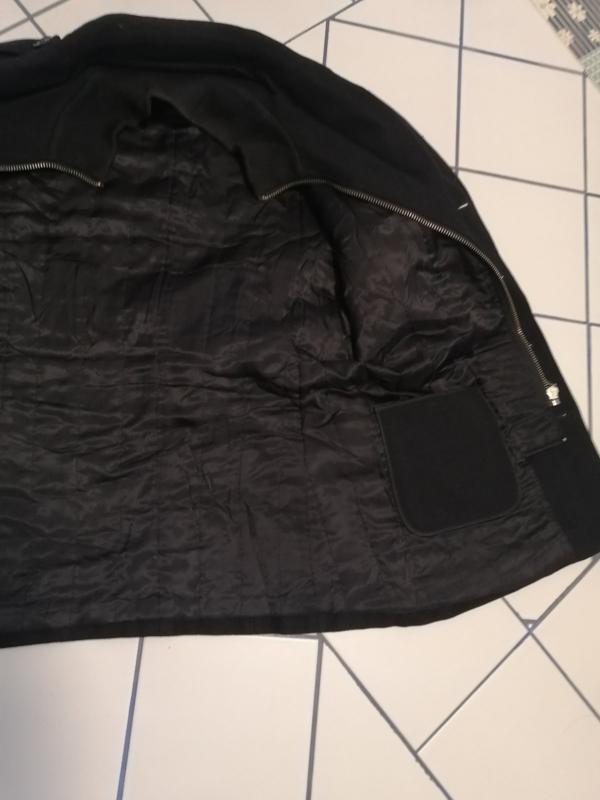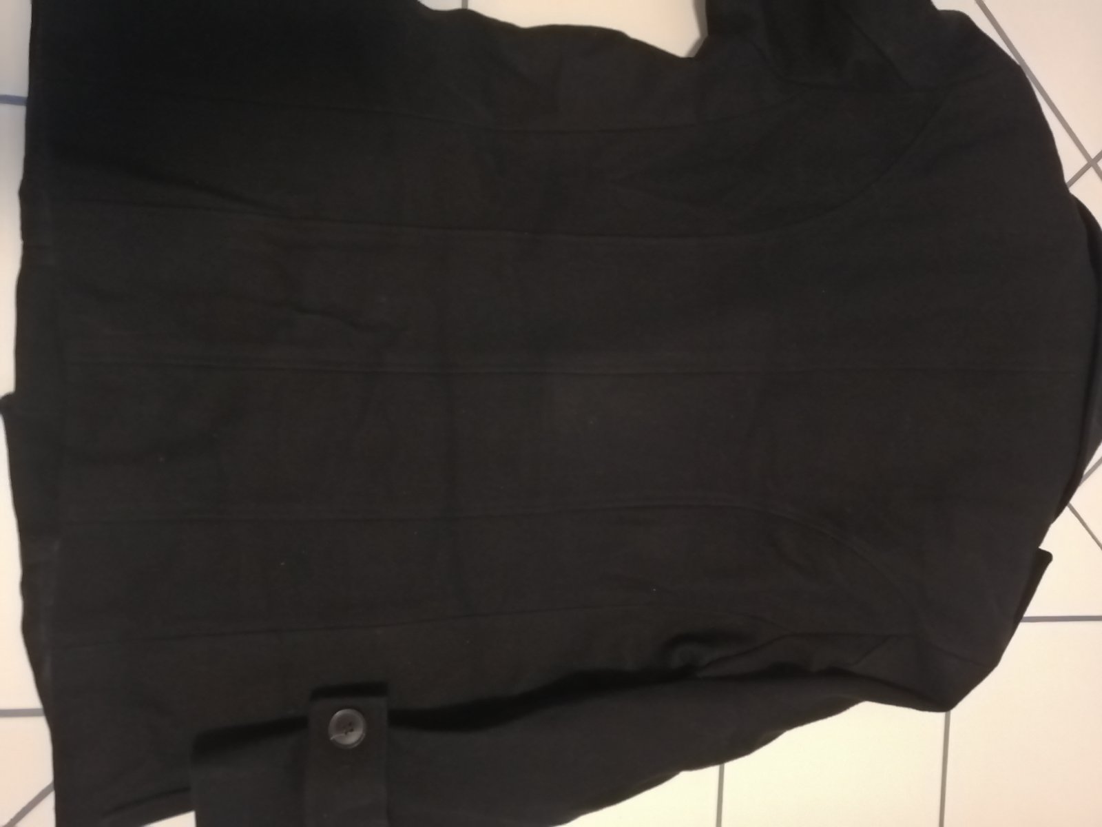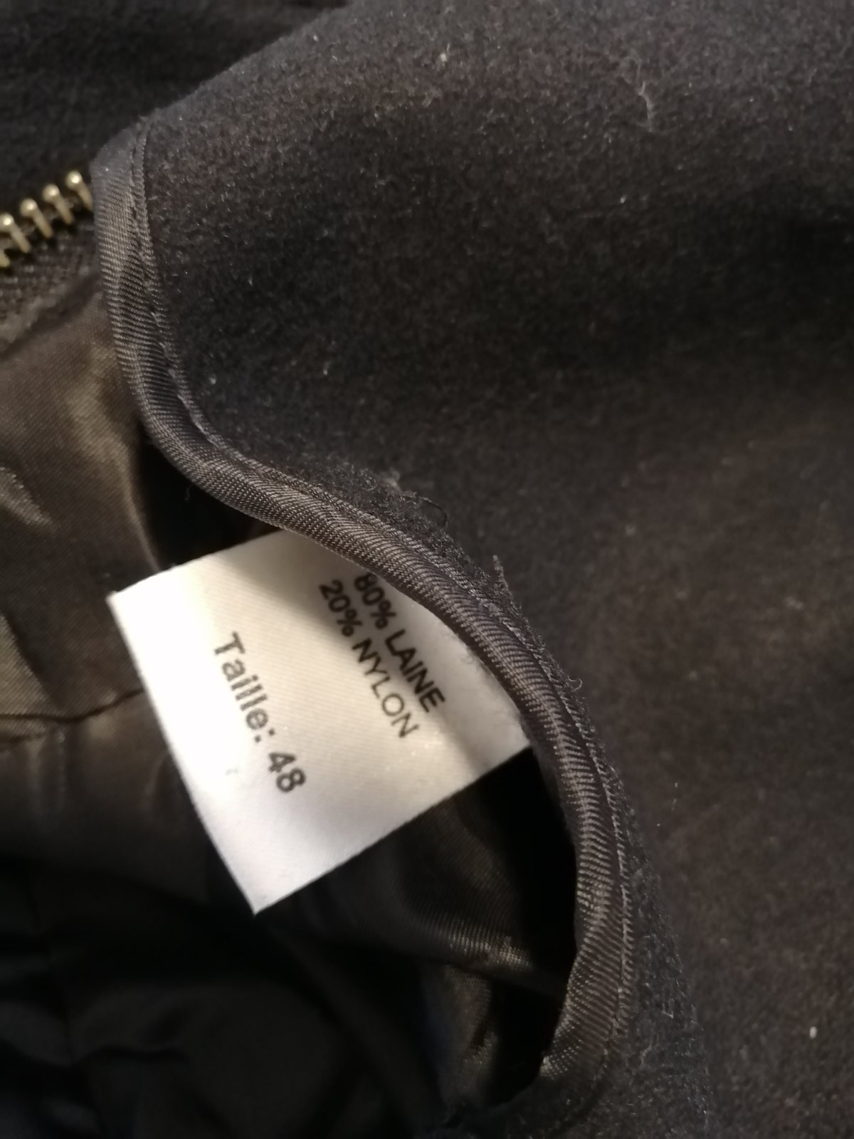 material 70% vlna, 10% kasmir, 20% polyamid Celkova dlzka 119 cm, vonkajsia dlzka rukavov 64 cm, sirka vpredu pod pazuchami 59 cm x 2 Bez poskodeni, farba cierna, na jednej fotke osvetleny bleskom