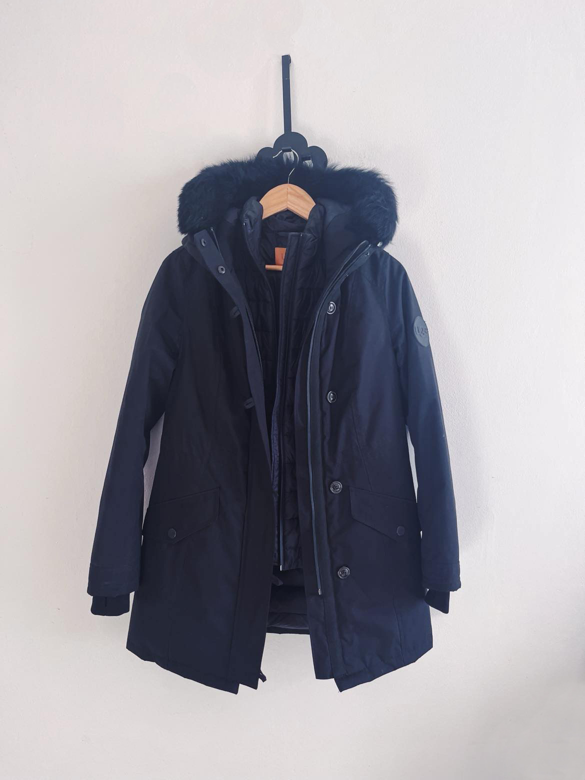 Jedenkrát oblečená zimná parka značky UGG, ako nová bez známok nosenia. Jedná sa o 2v1 kúsok, teda odnímateľná vesta a bunda. Výplň bundy aj vesty: 100% páperie (viď zloženie na poslednej foto). Materiál bundy je vodeodolný a tiež chráni pred snehom. Parka je testovaná na teploty až -31.4°C. Parka má rovnako aj snímateľnú pravú kožušinu z oviec alebo jahniat. Vrecká sú podšité flisovým materiálom. Farba: čierna. Veľkosť XS.