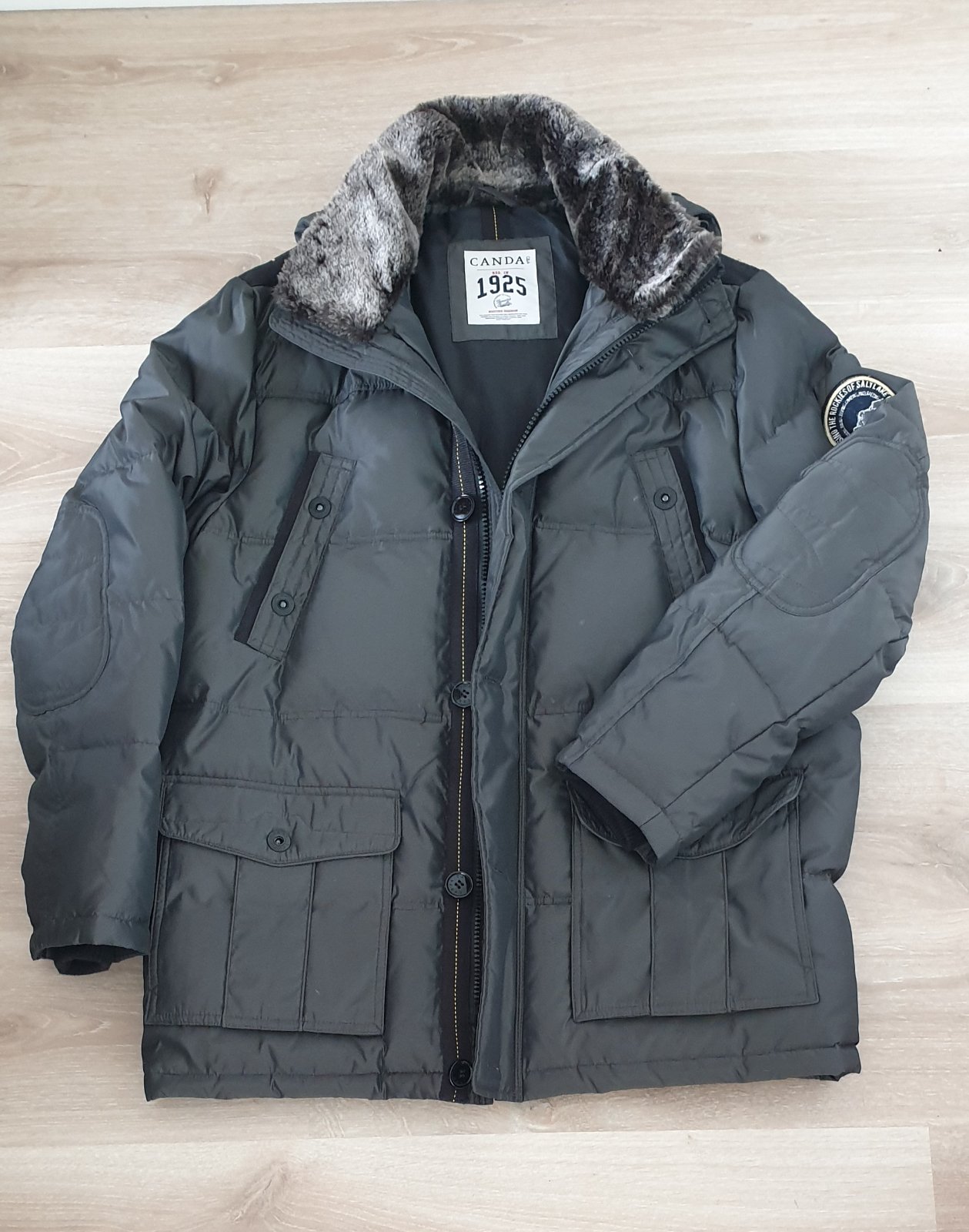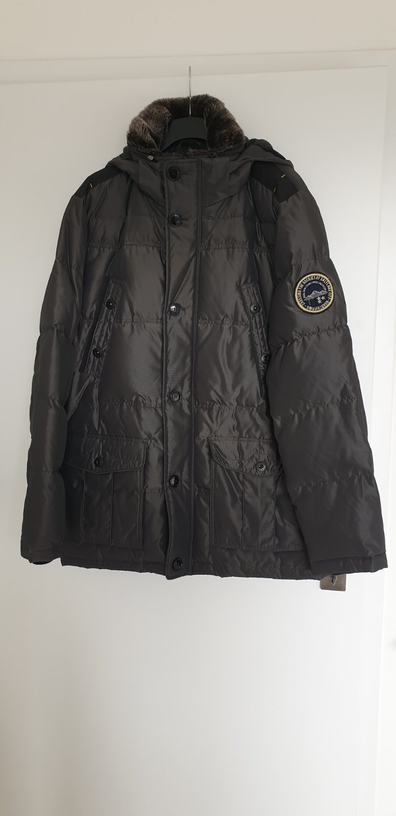 Pánska páperová bunda XL/54,zapínanie na zips,veľké vrecká bunda má kapucu dá sa odzipsovať,dĺžka bundy od krku 81cm,šírka cez prsia 65cm,dĺ.rukáva od pleca 70cm.